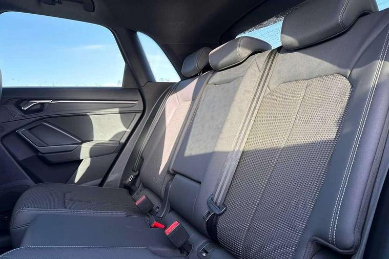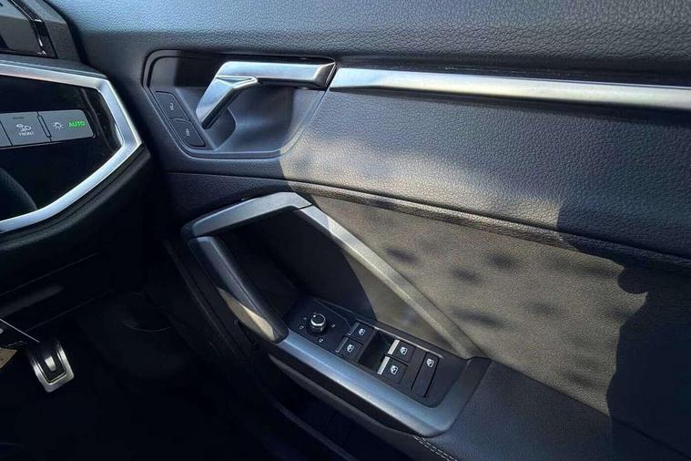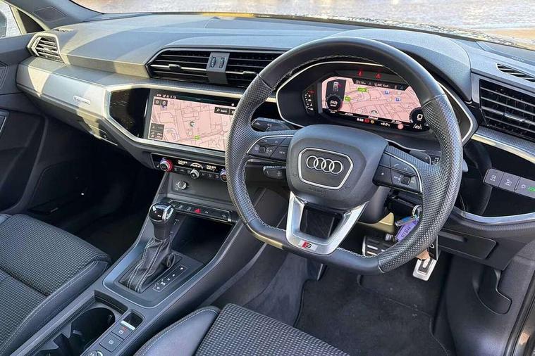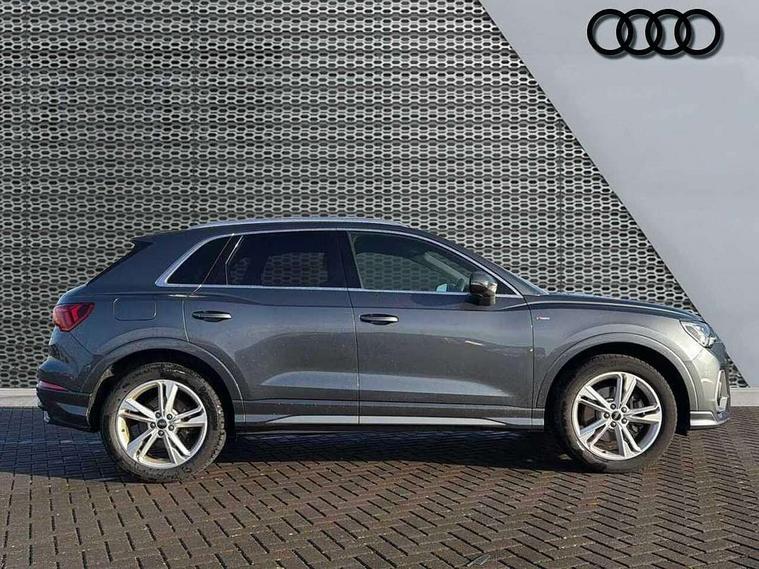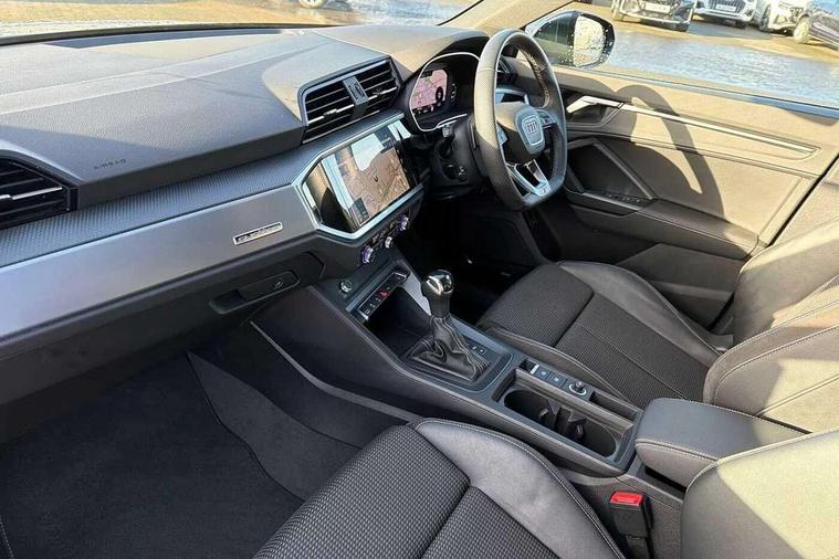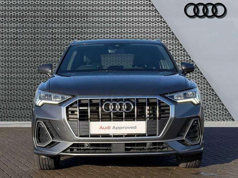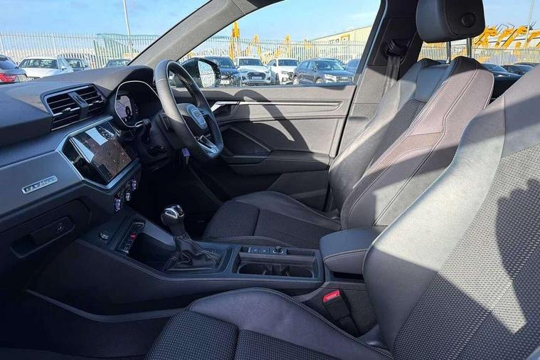 Amazon alexa Integration, Audi drive select, Audi lane departure warning, Audi Virtual Cockpit - 10.25" display, Bluetooth interface, Camera based traffic sign recognition, Legal emergency call, MMI Navigation Plus with high resolution 10.1 inch touchscreen colour display, Power operated tailgate, Progressive steering, Service interval indicator, Smartphone interface includes wireless Apple carplay/Android Auto, Start stop system with recuperation, Voice control system with natural language interaction, Sports suspension, 2 USB-C ports with charge and data functions, 6 passive loudspeakers, DAB digital radio module, Acoustic windscreen, Aluminium roof rails, Aluminium window trim, Auto dimming frameless rear view mirror, Body colour front spoiler blade, Body coloured bumpers, Electrically folding, adjustable and heated door mirrors with integrated LED side indicators and kerb view function for passenger side, Front and rear electric windows, Front fog lights, Front side air inlets in matt platinum grey, Grille vertical bars in aluminium silver/Matt, High gloss black finish B and C pillars, LED Dynamic rear indicators, LED headlights with LED daytime running lights, LED rear lights, LED third brake light, Privacy glass dark tinted rear and rear-side windows (from B-pillar backwards), Rain and light sensors, Rear diffuser grille in grained matt black, Rear diffuser strip in matt titanium black, Rear side wing doors, Rear wiper, S line badges on front wings, S Line front and rear bumpers, Side skirt insert in matt Platinium grey, Titanium black radiator grille, Variable front intermittent wipers, 12V socket in rear centre console, 3 seat bench in 2nd row, 40:20:40 folding with manual adjustment for 60:40 forwards/backwards position and backrest angle, Adjustable rear seat bench/backrest with centre armrest and cupholder, Black cloth headlining, Dual zone electronic climate control, Front and rear black floor mats with contrast stitching in rock grey, Front and rear headrests, Front and rear roof module including reading lights, Front centre armrest, Glove compartment lighting, Height and reach adjustable steering wheel, Illuminated door sill trims with S logo, ISOFIX child seat mounting for front passenger with airbag deactivation and outer rear seat including top tether attachment point for outer rear seats, Luggage compartment light, Manual front seats with height adjustment, Perforated leather gearknob, Single front passenger seat, Stainless steel luggage compartment sill finisher, Stainless steel pedals, Ambient lighting pack - Q3, Non smoking pack - Q3, 3x3 point rear seatbelts, 6 airbags - Driver, front passenger, curtain and side windows, Audi pre-sense front with pedestrain and cyclist recognition, Electrically operated child locks on rear doors, Electromechanical parking brake, Electronic stabilisation control including ABS, ASR and EDL, Front seatbelt reminder, Hill descent control, Hill hold assist, Pre sense basic, Seatbelt monitoring, Tyre pressure warning, Warning triangle and first aid kit, Anti theft alarm, Anti theft wheel bolts, Immobiliser, Remote central locking, Dark matt brushed aluminium inlay, Detail dashboard around MMI touch colour display in glass look, black with surround in aluminium look, Leatherette door armrest,