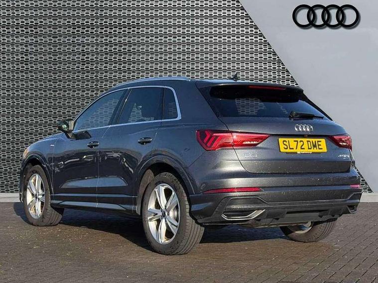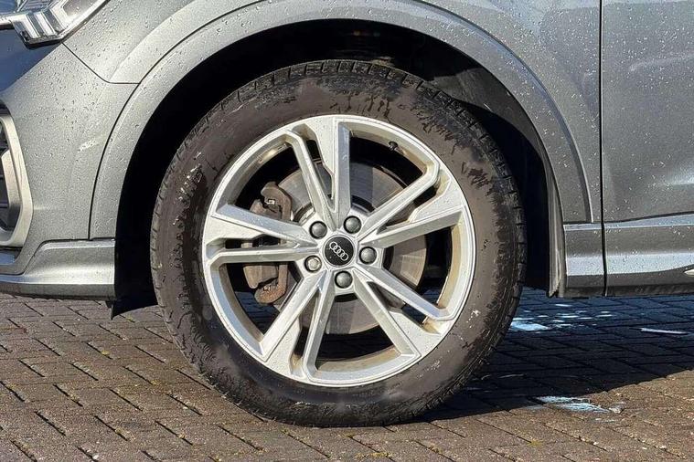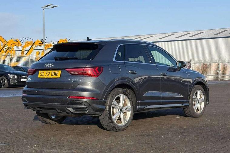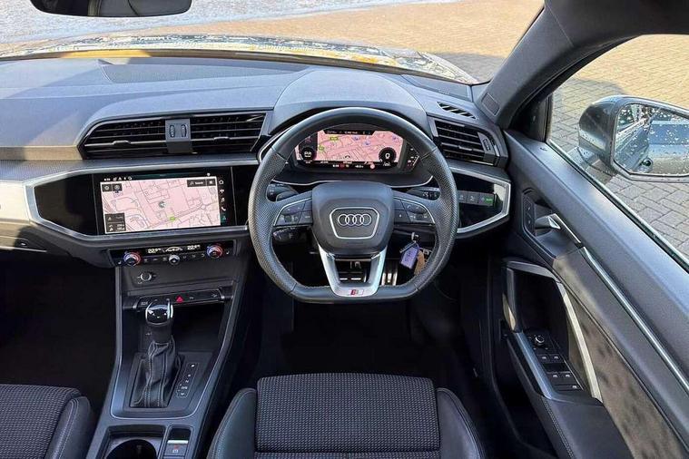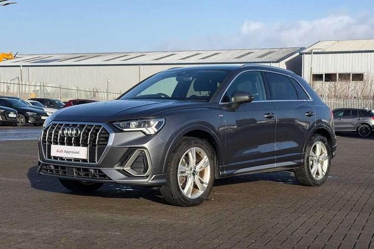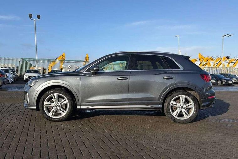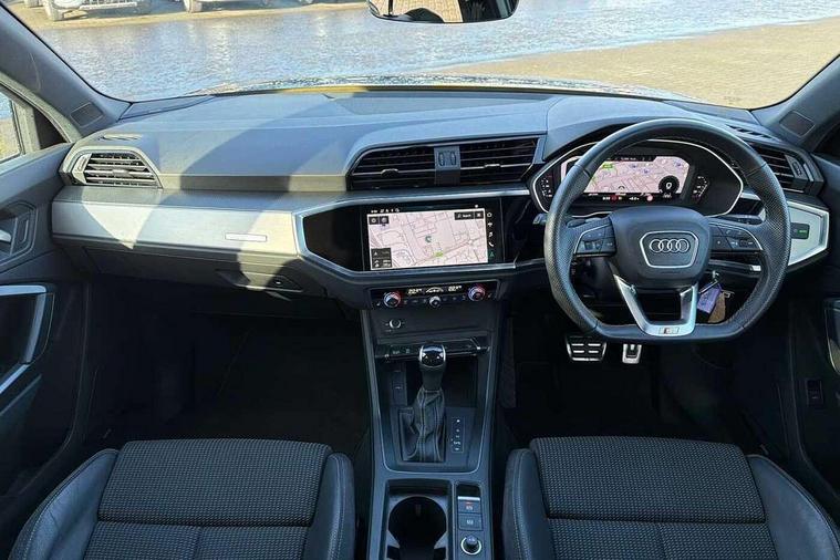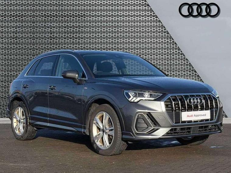 Amazon alexa Integration, Audi drive select, Audi lane departure warning, Audi Virtual Cockpit - 10.25" display, Bluetooth interface, Camera based traffic sign recognition, Legal emergency call, MMI Navigation Plus with high resolution 10.1 inch touchscreen colour display, Power operated tailgate, Progressive steering, Service interval indicator, Smartphone interface includes wireless Apple carplay/Android Auto, Start stop system with recuperation, Voice control system with natural language interaction, Sports suspension, 2 USB-C ports with charge and data functions, 6 passive loudspeakers, DAB digital radio module, Acoustic windscreen, Aluminium roof rails, Aluminium window trim, Auto dimming frameless rear view mirror, Body colour front spoiler blade, Body coloured bumpers, Electrically folding, adjustable and heated door mirrors with integrated LED side indicators and kerb view function for passenger side, Front and rear electric windows, Front fog lights, Front side air inlets in matt platinum grey, Grille vertical bars in aluminium silver/Matt, High gloss black finish B and C pillars, LED Dynamic rear indicators, LED headlights with LED daytime running lights, LED rear lights, LED third brake light, Privacy glass dark tinted rear and rear-side windows (from B-pillar backwards), Rain and light sensors, Rear diffuser grille in grained matt black, Rear diffuser strip in matt titanium black, Rear side wing doors, Rear wiper, S line badges on front wings, S Line front and rear bumpers, Side skirt insert in matt Platinium grey, Titanium black radiator grille, Variable front intermittent wipers, 12V socket in rear centre console, 3 seat bench in 2nd row, 40:20:40 folding with manual adjustment for 60:40 forwards/backwards position and backrest angle, Adjustable rear seat bench/backrest with centre armrest and cupholder, Black cloth headlining, Dual zone electronic climate control, Front and rear black floor mats with contrast stitching in rock grey, Front and rear headrests, Front and rear roof module including reading lights, Front centre armrest, Glove compartment lighting, Height and reach adjustable steering wheel, Illuminated door sill trims with S logo, ISOFIX child seat mounting for front passenger with airbag deactivation and outer rear seat including top tether attachment point for outer rear seats, Luggage compartment light, Manual front seats with height adjustment, Perforated leather gearknob, Single front passenger seat, Stainless steel luggage compartment sill finisher, Stainless steel pedals, Ambient lighting pack - Q3, Non smoking pack - Q3, 3x3 point rear seatbelts, 6 airbags - Driver, front passenger, curtain and side windows, Audi pre-sense front with pedestrain and cyclist recognition, Electrically operated child locks on rear doors, Electromechanical parking brake, Electronic stabilisation control including ABS, ASR and EDL, Front seatbelt reminder, Hill descent control, Hill hold assist, Pre sense basic, Seatbelt monitoring, Tyre pressure warning, Warning triangle and first aid kit, Anti theft alarm, Anti theft wheel bolts, Immobiliser, Remote central locking, Dark matt brushed aluminium inlay, Detail dashboard around MMI touch colour display in glass look, black with surround in aluminium look, Leatherette door armrest,