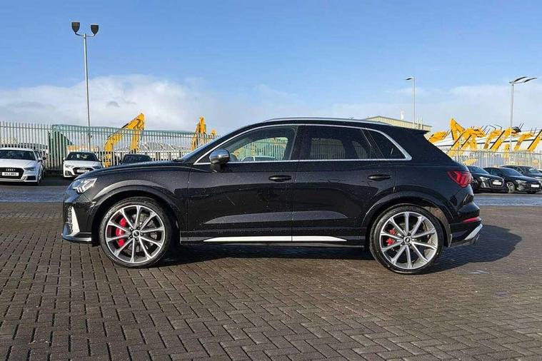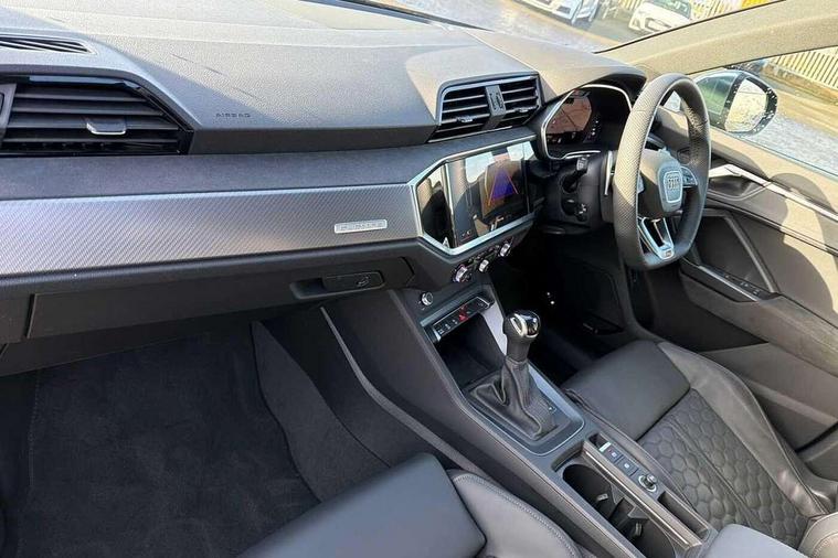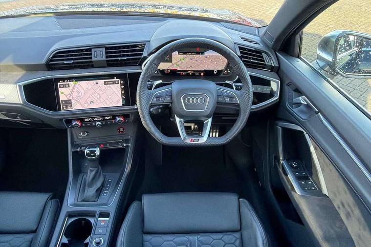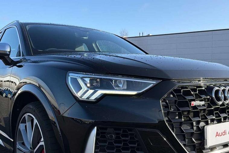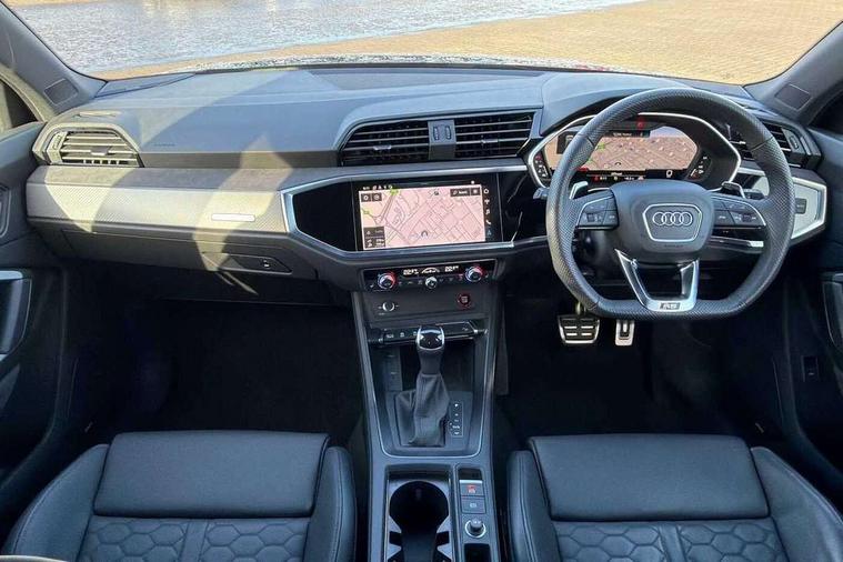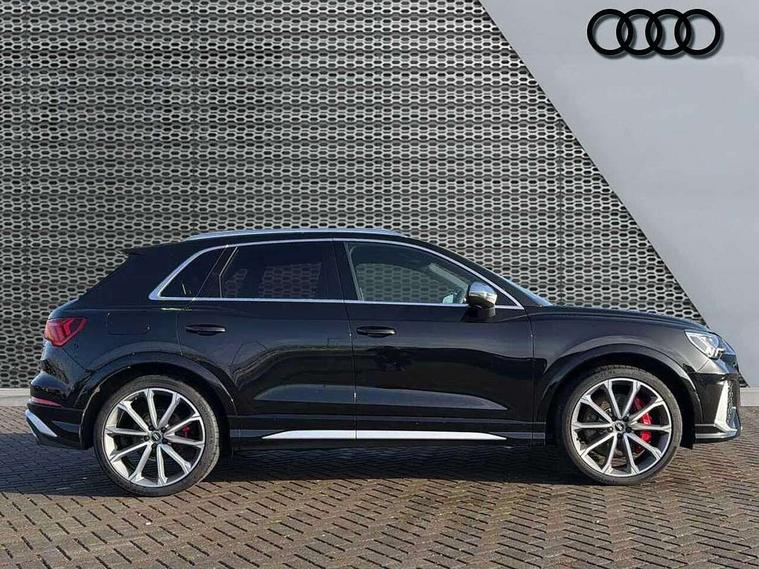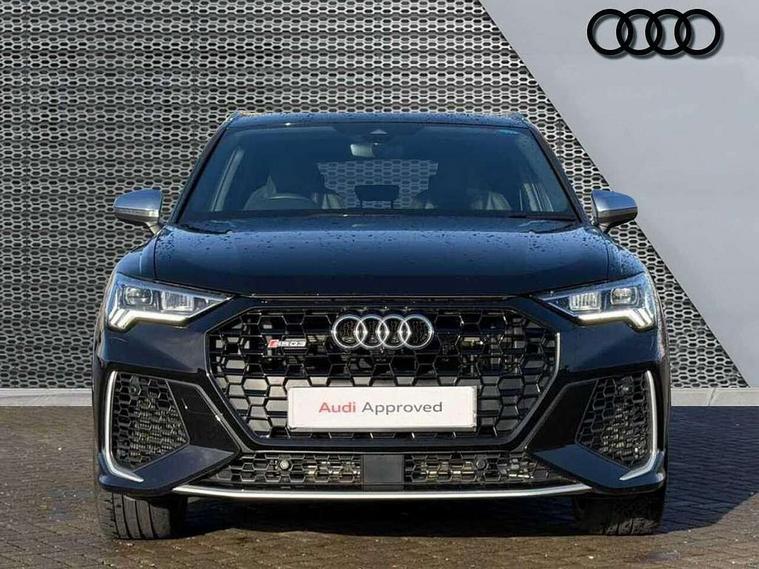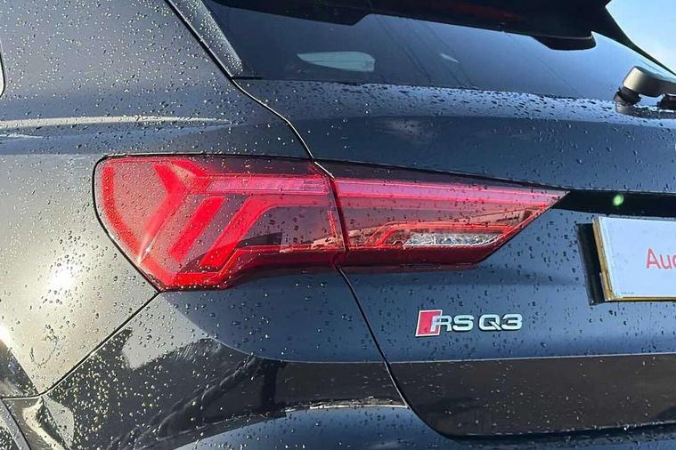 Audi drive select with new RS modes, Audi lane departure warning, Audi parking system plus with front and rear sensors, Audi virtual cockpit plus - 12.3 inch display, Bluetooth interface, Camera based traffic sign recognition, Emergency e-call, MMI Navigation Plus with high resolution 10.1 inch touchscreen colour display, Power operated tailgate, Progressive steering, Smartphone interface includes wireless Apple carplay/Android Auto, Start stop system with recuperation, Voice control system with natural language interaction, Quattro all wheel drive, 2 USB-C ports with charge and data functions, Audi sound system, DAB digital radio module, Acoustic windscreen, Aluminium roof rails, Aluminium window trim, Audi Beam uses LEDs to project the Audi Sport logo, Auto dimming frameless rear view mirror, Body colour rear spoiler, Electrically folding, adjustable and heated door mirrors with integrated LED side indicators and kerb view function for passenger side, Flared wheel arches, Flat slits on single frame grille, Front spoiler blade, side blades, inserts on door trim strips and diffuser insert in matt aluminium look, Headlight washers, High gloss black finish B and C pillars, Honeycomb radiator grille in gloss black, Illuminated door sill trims with RS logo, LED headlights with LED daytime running lights and dynamic rear indicator, LED rear lights, LED third brake light, Privacy glass dark tinted rear and rear-side windows (from B-pillar backwards), Rain and light sensors, Rear side wing doors, Rear wiper, RS specific bumpers with large front air inlets in black, Tinted rear windows, Variable front intermittent wipers, 3 seat bench in 2nd row, 4 way electric lumbar support for driver and front passenger, Adjustable rear seat bench/backrest with centre armrest and cupholder, Black cloth headlining, Black dinamica elements - dashboard and the armrests in the front and rear doors, Dual zone electronic climate control, Electrically adjustable front seats, Front and rear floor mats, Front and rear head restraints, Front centre armrest, Heated front seats, ISOFIX child seat mounting for front passenger with airbag deactivation and outer rear seat including top tether attachment point for outer rear seats, Microfibre dinamica upholstery with front sports seats + honeycomb stitching and RS embossed logo, Single front passenger seat, Stainless steel luggage compartment sill finisher, Stainless steel pedals, Ambient lighting pack - RS Q3, Non smoking pack - RS Q3, 3x3 point rear seatbelts, 6 airbags - Driver, front passenger, curtain and side windows, Audi pre-sense front with pedestrain and cyclist recognition, Electrically operated child locks on rear doors, Electromechanical parking brake, Electronic stabilisation control including ABS, ASR and EDL, Front seatbelt reminder, Hill descent control, Hill hold assist, Pre sense basic, RS brake system, Seatbelt monitoring, Tyre pressure warning, Warning triangle and first aid kit, Advanced key, Anti theft alarm, Anti theft wheel bolts, Immobiliser, Aluminium look interior elements, Detail dashboard around MMI touch colour display in glass look, black with surround in aluminium look, Inlays in aluminium race anthracite, Tool kit, Tyre repair kit,