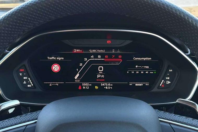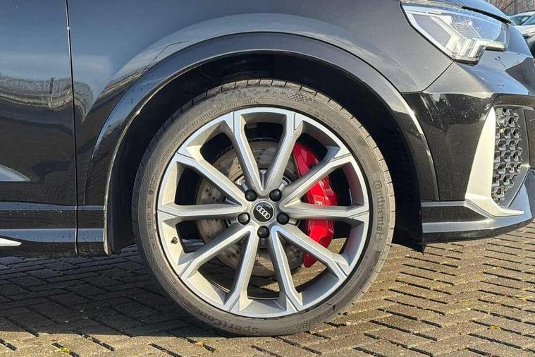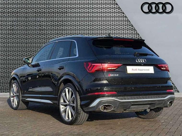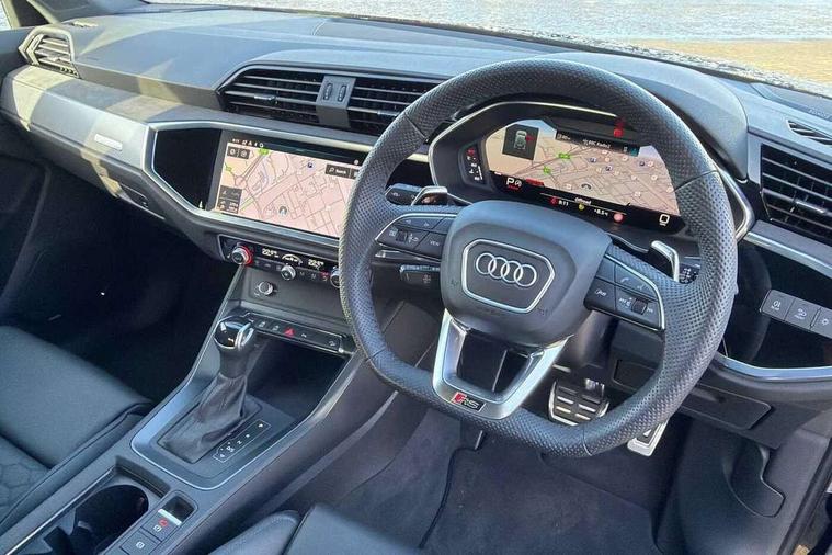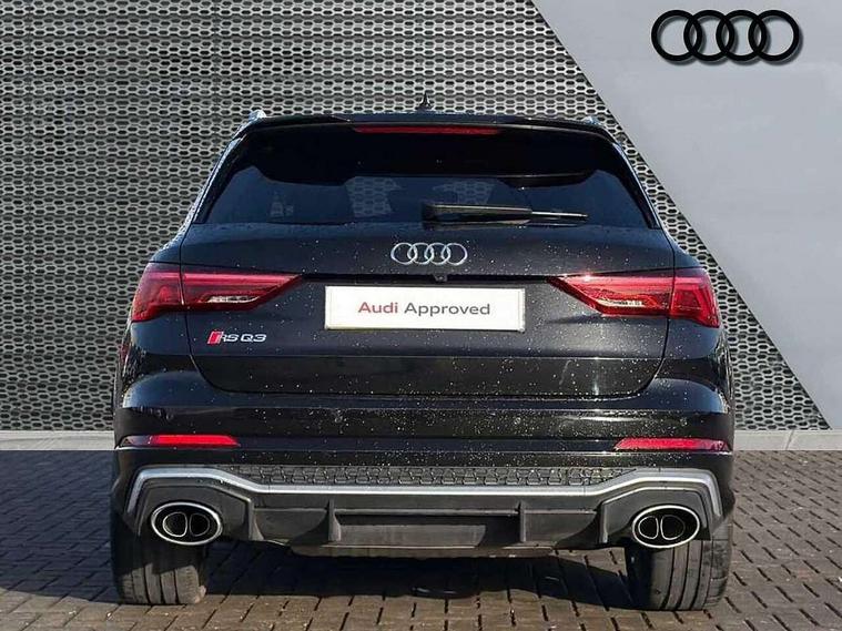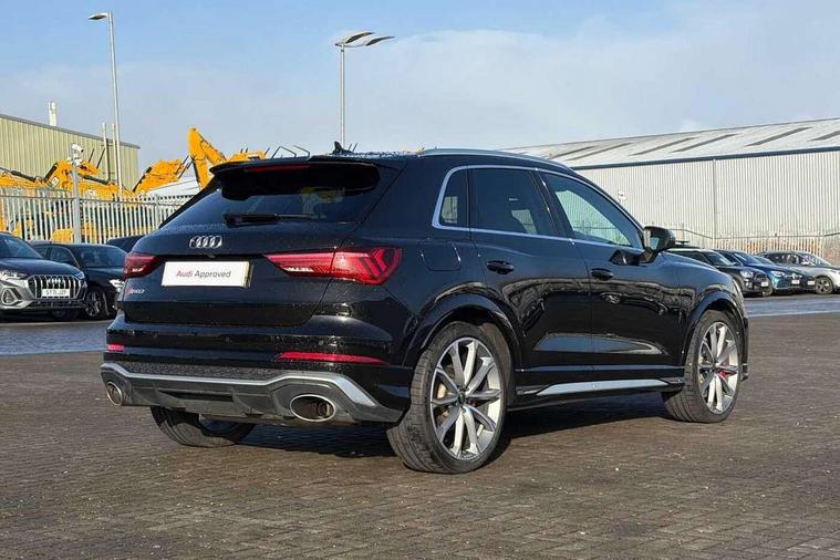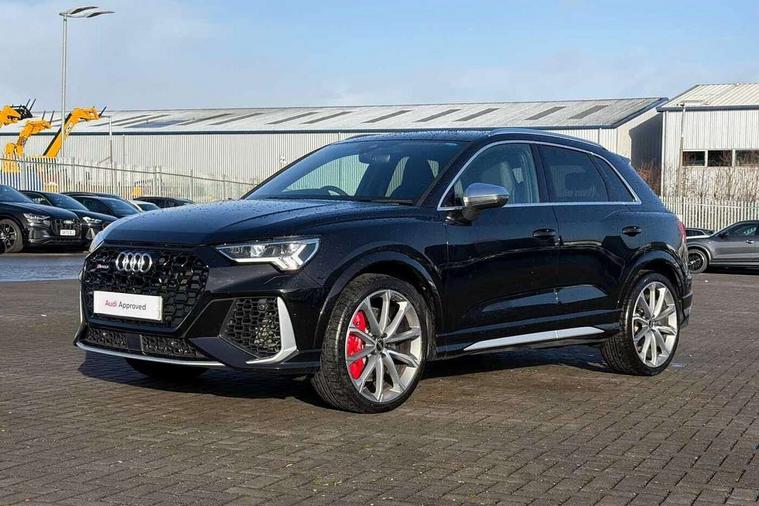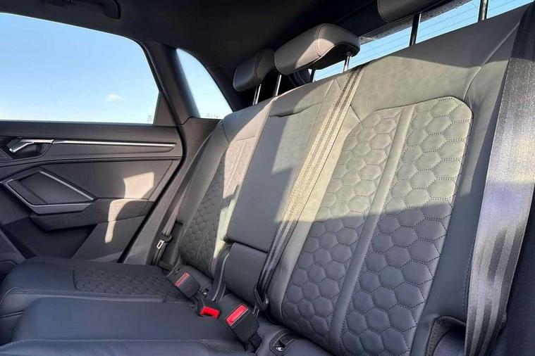 Audi drive select with new RS modes, Audi lane departure warning, Audi parking system plus with front and rear sensors, Audi virtual cockpit plus - 12.3 inch display, Bluetooth interface, Camera based traffic sign recognition, Emergency e-call, MMI Navigation Plus with high resolution 10.1 inch touchscreen colour display, Power operated tailgate, Progressive steering, Smartphone interface includes wireless Apple carplay/Android Auto, Start stop system with recuperation, Voice control system with natural language interaction, Quattro all wheel drive, 2 USB-C ports with charge and data functions, Audi sound system, DAB digital radio module, Acoustic windscreen, Aluminium roof rails, Aluminium window trim, Audi Beam uses LEDs to project the Audi Sport logo, Auto dimming frameless rear view mirror, Body colour rear spoiler, Electrically folding, adjustable and heated door mirrors with integrated LED side indicators and kerb view function for passenger side, Flared wheel arches, Flat slits on single frame grille, Front spoiler blade, side blades, inserts on door trim strips and diffuser insert in matt aluminium look, Headlight washers, High gloss black finish B and C pillars, Honeycomb radiator grille in gloss black, Illuminated door sill trims with RS logo, LED headlights with LED daytime running lights and dynamic rear indicator, LED rear lights, LED third brake light, Privacy glass dark tinted rear and rear-side windows (from B-pillar backwards), Rain and light sensors, Rear side wing doors, Rear wiper, RS specific bumpers with large front air inlets in black, Tinted rear windows, Variable front intermittent wipers, 3 seat bench in 2nd row, 4 way electric lumbar support for driver and front passenger, Adjustable rear seat bench/backrest with centre armrest and cupholder, Black cloth headlining, Black dinamica elements - dashboard and the armrests in the front and rear doors, Dual zone electronic climate control, Electrically adjustable front seats, Front and rear floor mats, Front and rear head restraints, Front centre armrest, Heated front seats, ISOFIX child seat mounting for front passenger with airbag deactivation and outer rear seat including top tether attachment point for outer rear seats, Microfibre dinamica upholstery with front sports seats + honeycomb stitching and RS embossed logo, Single front passenger seat, Stainless steel luggage compartment sill finisher, Stainless steel pedals, Ambient lighting pack - RS Q3, Non smoking pack - RS Q3, 3x3 point rear seatbelts, 6 airbags - Driver, front passenger, curtain and side windows, Audi pre-sense front with pedestrain and cyclist recognition, Electrically operated child locks on rear doors, Electromechanical parking brake, Electronic stabilisation control including ABS, ASR and EDL, Front seatbelt reminder, Hill descent control, Hill hold assist, Pre sense basic, RS brake system, Seatbelt monitoring, Tyre pressure warning, Warning triangle and first aid kit, Advanced key, Anti theft alarm, Anti theft wheel bolts, Immobiliser, Aluminium look interior elements, Detail dashboard around MMI touch colour display in glass look, black with surround in aluminium look, Inlays in aluminium race anthracite, Tool kit, Tyre repair kit,