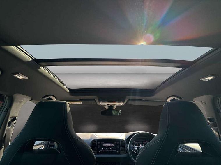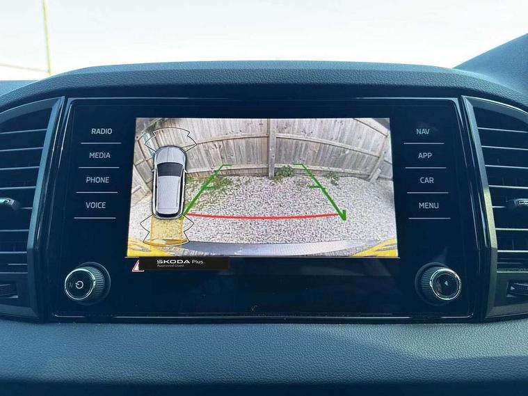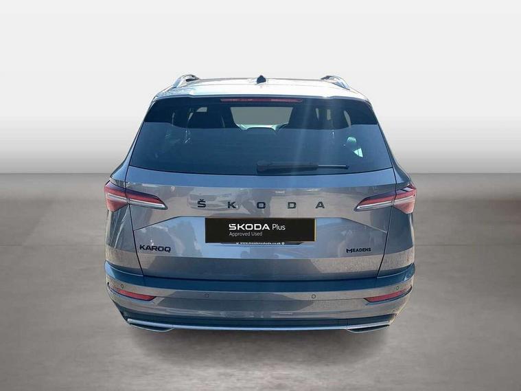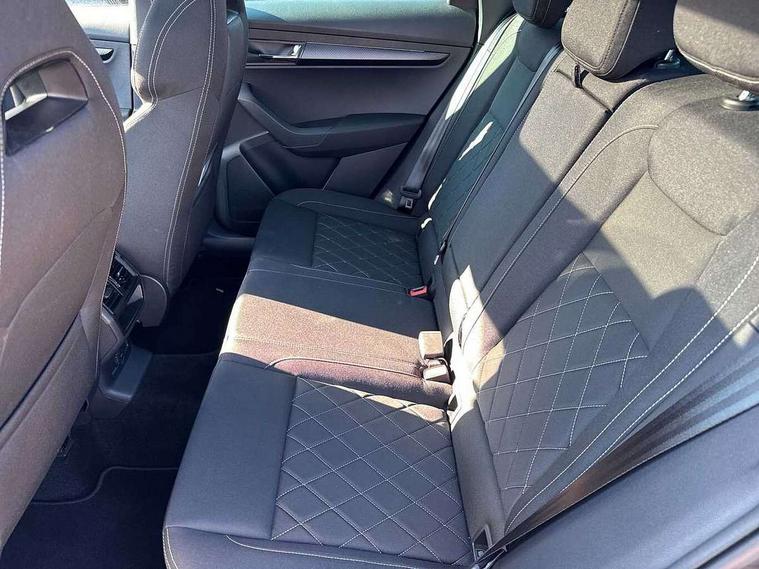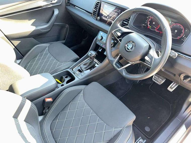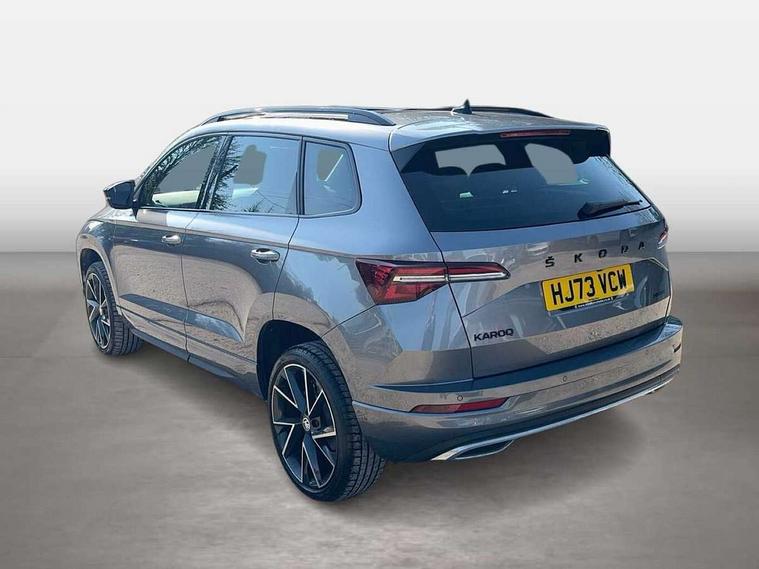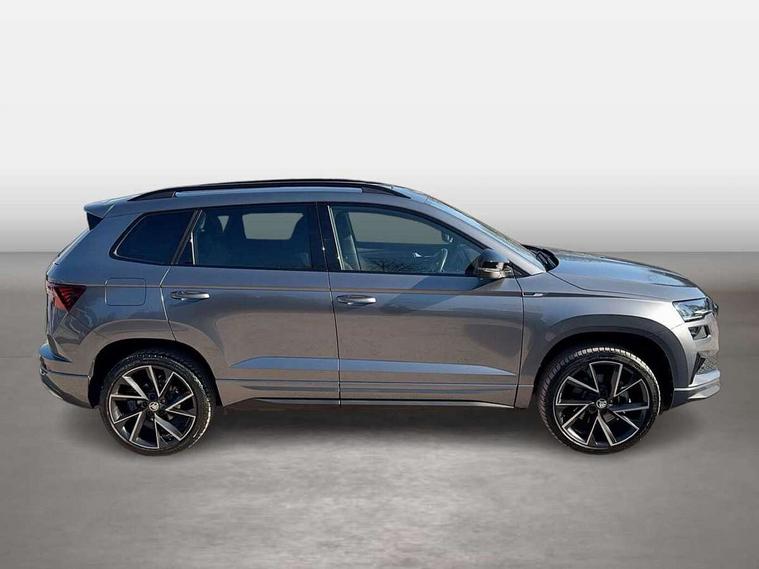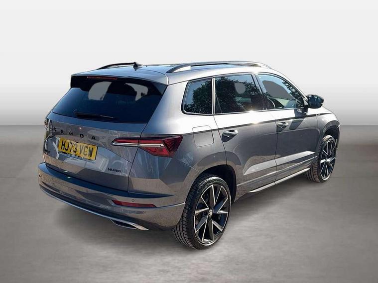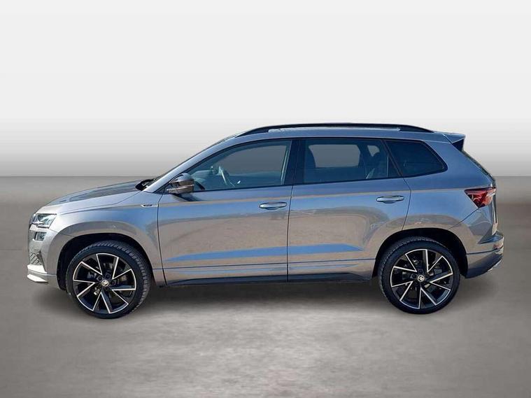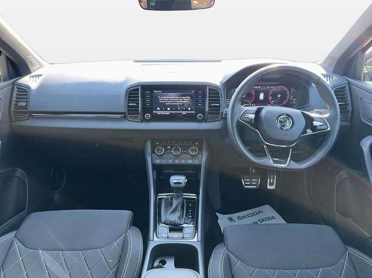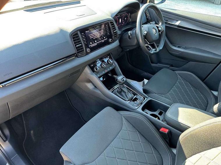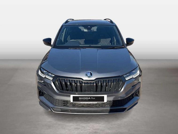 8" Digital display, Care connect, Driver fatigue sensor, Emergency services call system, Outside temperature gauge, Service interval indicator, SmartLink wireless for Apple and wired for Android, Start/stop system with regenerative braking, USB C Port x 2 in front centre console, Virtual cockpit, Virtual pedal with electrically operated boot door, 8 Speakers, DAB radio with Bluetooth, USB connection, Wireless charging without wireless aerial connection, Acoustic glass, Aero front windscreen wipers with intermittent function, Auto dimming rear view mirror with light and rain sensors, Black door mirrors, Black electric window control buttons, Black radiator grille, Black roof rails, Body colour door handles, Electric front and rear windows with child proof lock, Front door steps with SportLine logo, Heated rear windscreen, LED daytime running lights, LED rear lights with high functionality welcome effect and dynamic indicators, Light assistant (coming/leaving home/tunnel light), Panoramic sliding sunroof, Plastic scuff plates, Privacy glass, Protective door side sills in body colour, Rear diffuser, Rear side wing doors, Rear spoiler, Rear window wiper with washer system and intermittent control, Safety reflectors on front doors, Skoda lettering on tailgate in black, Sportline badge on front fender, Sportline decorative inserts with badging, Sports front and rear bumpers, 1.5 litre bottle holders in driver and front passenger door panels, 12V socket in boot, 12v socket in front centre armrest with storage compartment and rear air vents, 3 rear height adjustable headrests, 3 seat bench in 2nd row, 3 spoke leather sports multifunction steering wheel and silver stitching with gear shift paddles, 4 foldable roof handles with rear coat hooks, Black floor carpet, Black roof headlining, Chrome inner door handles, Double sided boot floor, Foldable hooks in the boot, Front head restraints, Height adjustable front three point seats belts with tensioners, Height/reach adjust steering wheel, Ice scraper, Illuminated glovebox, Illuminated luggage compartment, Isofix child seat preparation outer rear, Manual lumbar support for front seats, Pen holder, Pollen filter, Rear boot cover, Rear reading lights, Rear seats fixed folding and divided 60:40, Rubbish bin door, Safety vest holder, Single front passenger seat, Storage box in upper central dashboard closed, Sunvisors with illuminated vanity mirrors, Textile floor mats, Ticket holder, Titan black interior ceiling, Welcome animation with sportline logo, Boot pack - Karoq, Light Pack - Karoq, Parking pack - Karoq, Automatic door unlocking in case of crash, Automatic fuel cut off in case of crash, Child locks on rear doors, Driver airbag, Electronic parking brake with auto hold function, Emergency rear braking signal, ESC including ABS, MSR, ASR, EDS, HBA, DSR, RBS, MKB and traction control, Front side airbags, Hill hold control, Knee airbags, Passenger airbag with switch-off function, Pedestrian monitor, Seatbelt reminder signalisation and pretensioner for all seats, Three point seatbelts rear, Two tone horn, Tyre pressure display, Tyre pressure monitor, Alarm with interior monitoring, back up horn and tilt sensor with safe function, Electronic engine immobiliser, Keyless entry and start/stop, Remote central locking with 2 remote folding keys, Black air vent surround, Black centre console, Satin black dashboard, Satin black door trim, 19" Sagitarius anthracite alloy wheels with matt black aero inserts, Anti-theft wheel bolts protection, Matt black aero hub caps, Tool kit,