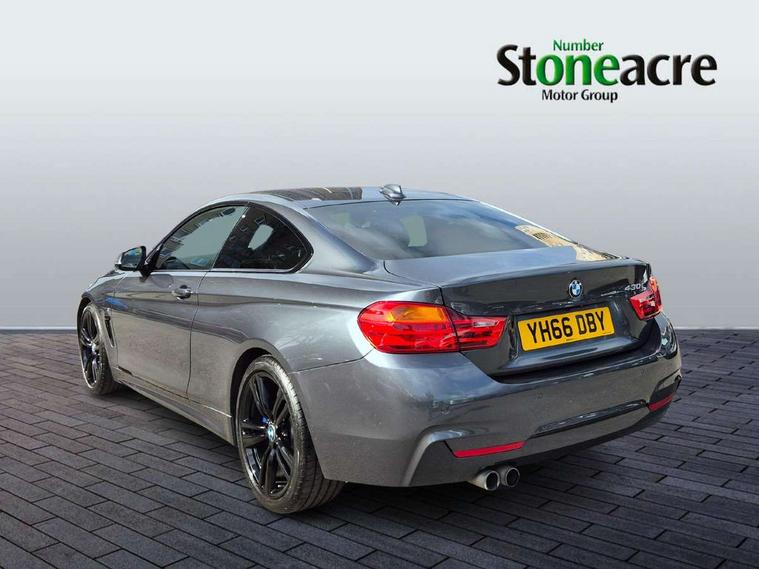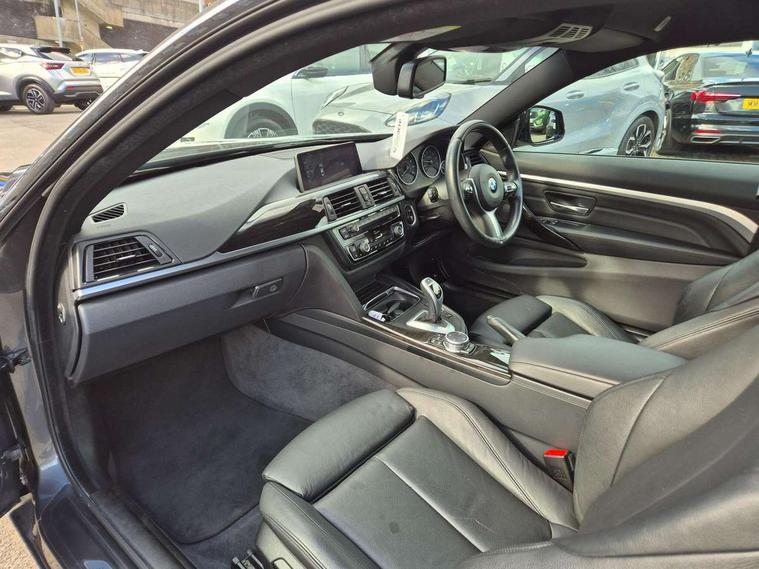 BMW Online services, BMW Teleservices, Brake pad wear indicator warning light, Check control system, Door/boot open warning, Front/rear Parking distance control, Lights on warning, Oil temperature gauge, On board computer, Outside temperature display, Run flat indicator, Service interval indicator, Stop/start button, Drive Performance Control, Sports function on gearbox with steering wheel mounted gearshift paddles, Auxiliary point for auxiliary devices, Bluetooth audio streaming, BMW professional radio/CD/MP3, DAB Digital radio, 2 speed adjustable intermittent wipers with wash/wipe function, Auto dimming rear view mirror, Body colour bumpers, Body colour door handles, Body colour door mirrors, Body colour roof mouldings, Chrome kidney grille with chrome vertical slats, Daytime running lights, Door sill finishers, Electric adjustable heated door mirrors, Electric front windows/one touch facility, Follow me home headlights, Front fog lights, Headlight washers, Heat insulating tinted glass, Heated windscreen washer jets, High gloss shadow line, M aerodynamic bodystyling, Rain sensor including auto headlights activation, Twin chrome exhaust tailpipes, Windscreen with grey shadeband, 12V sockets in front centre console and passenger footwell, 3 spoke leather M sport multifunction sports steering wheel, 4 grab handles, Anthracite headlining, Anthracite Velour floor mats, Dual zone climate control, Electrically adjustable front seats - driver seat with memory, Folding storage compartment with glasses holder + coin tray, Front centre armrest with storage compartment, Front cupholders x 2, Front head restraints, Front sports seats with electric side bolster adjustment, Front/rear armrests within door panels, Glovebox with lid, Heated front seats, Integrated rear head restraints, ISOFIX child seat preparation+airbag deactivation, Lashing eyelets in boot, Leather gearknob, Leather handbrake grip, Reach + rake adjustable steering column, Rear centre armrest, Storage compartment in rear centre console, Sunvisors with vanity mirrors, Toolkit located in luggage compartment, Extended lights package - 4 Series, 3 point seatbelts on all seats, ABS/EBD, Automatic Stability Control (ASC), BMW emergency call, Cornering brake control (CBC), Crash Sensor - activates hazard/interior lighting + unlocks doors, Driver seatbelt warning indicator, Driver/Front Passenger airbags, DSC+, Dynamic brake control, Dynamic Traction Control - DTC, Front seatbelt force limiters, Front seatbelt pretensioner, Front side airbags, Hill start assist, ITS head airbags for front/rear, Tyre pressure monitor, Warning triangle and first aid kit, Drive away door locking, Electronic immobiliser, Remote central locking, Remote control Thatcham category 1 alarm,