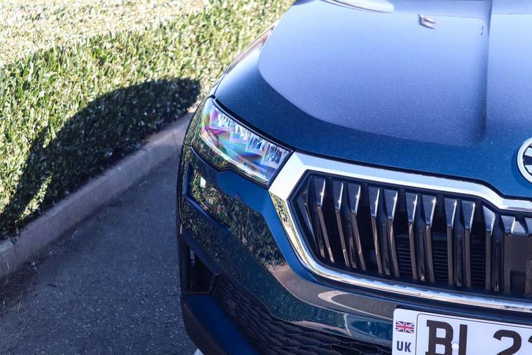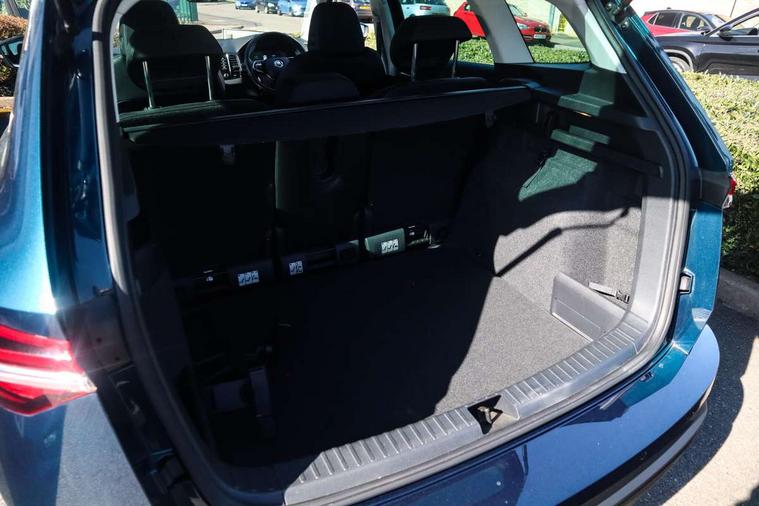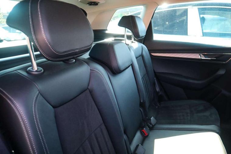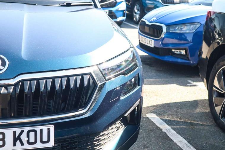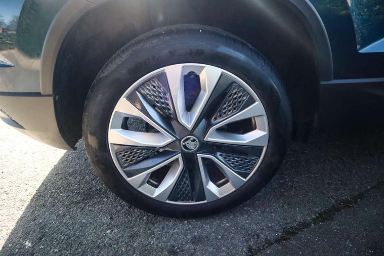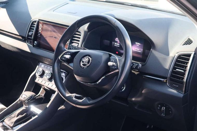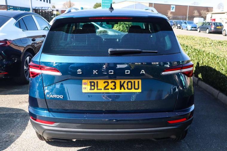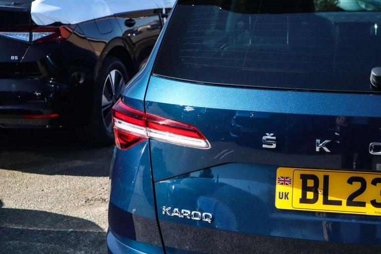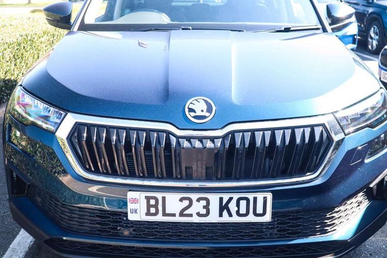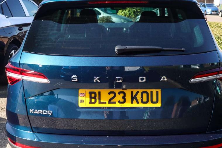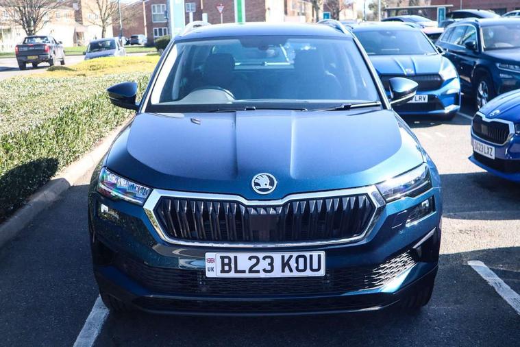 8" Digital display, Care connect, Driver fatigue sensor, Emergency services call system, Outside temperature gauge, Service interval indicator, SmartLink wireless for Apple and wired for Android, Start/stop system with regenerative braking, USB C Port x 2 in front centre console, 8 Speakers, DAB radio with Bluetooth, USB connection, Acoustic glass, Aero front windscreen wipers with intermittent function, Auto dimming rear view mirror with light and rain sensors, Black electric window control buttons, Body colour door mirrors and handles, Dynamic headlight range control with cornering light function, Electric front and rear windows with child proof lock, Heated rear windscreen, LED daytime running lights, LED rear lights with high functionality welcome effect and dynamic indicators, Light assistant (coming/leaving home/tunnel light), Plastic scuff plates, Privacy glass, Rear side wing doors, Rear spoiler, Rear window wiper with washer system and intermittent control, Safety reflectors on front doors, 1.5 litre bottle holders in driver and front passenger door panels, 12V socket in boot, 12v socket in front centre armrest with storage compartment and rear air vents, 2 spoke leather heated multifunction steering wheel with DSG paddles, 2 x Tablet holder, 3 rear height adjustable headrests, 3 seat bench in 2nd row, 4 foldable roof handles with rear coat hooks, Black floor carpet, Chrome inner door handles, Decorative door sills with KAROQ badging, Double sided boot floor, Foldable hooks in the boot, Front head restraints, Height adjustable front three point seats belts with tensioners, Height/reach adjust steering wheel, Ice scraper, Illuminated glovebox, Illuminated luggage compartment, Isofix child seat preparation for front passenger seat, Isofix child seat preparation outer rear, Manual lumbar support for front seats, Pen holder, Pollen filter, Rear boot cover, Rear reading lights, Rubbish bin door, Safety vest holder, Single front passenger seat, Storage box in upper central dashboard closed, Sunvisors with illuminated vanity mirrors, Textile floor mats, Ticket holder, VarioFlex seats with standard rear seat release, Boot pack - Karoq, Chrome roof rails + chrome pack - Karoq, Parking pack - Karoq, Automatic door unlocking in case of crash, Automatic fuel cut off in case of crash, Child locks on rear doors, Driver airbag, Electronic parking brake with auto hold function, Emergency rear braking signal, ESC including ABS, MSR, ASR, EDS, HBA, DSR, RBS, MKB and traction control, Front side airbags, Hill hold control, Knee airbags, Passenger airbag with switch-off function, Pedestrian monitor, Seatbelt reminder signalisation and pretensioner for all seats, Three point seatbelts rear, Two tone horn, Tyre pressure display, Tyre pressure monitor, Alarm with interior monitoring, back up horn and tilt sensor with safe function, Electronic engine immobiliser, Keyless entry and start/stop, Remote central locking with 2 remote folding keys, Chrome framed air vents, 18" Procyon silver alloy wheels with anthracite aero inserts, Anti-theft wheel bolts protection, Storage on wheel cover, Tool kit,