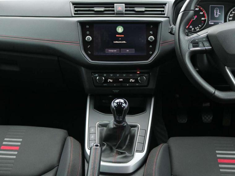 'Lights On' Reminder warning buzzer, Cruise control and speed limiter, Digital clock, Electric speed sensitive power steering, Full Link Smartphone Integration with Mirror Link, Apple Car Play, Google Android Auto with USB Type C cable for Apple and Android compatibility, Low fuel warning light, Outside temperature display, Rear parking sensor, RPM counter, Seat connect with safety, service, remote and online, SEAT Drive profile - Four different models normal-sport-eco-individual, steering response, throttle response, Trip computer, Sports suspension, Bluetooth interface for hands free and audio streaming, DAB digital radio and AM/FM radio, Steering wheel mounted audio controls, Anti theft roof antenna, Auto dimming interior rear view mirror, Automatic activation of hazard warning lights, Automatic headlights, Body coloured bumpers, Body coloured door handle inserts, Chrome front grille frame, Chrome roof rails, Chrome window trim, Coming/leaving home lighting function, Dark tinted rear windows, Electric front/rear windows with one touch/auto up/down, Electrically adjustable, heated and folding door mirrors, Full LED headlights dipped and mainbeam + front and rear fog lights, LED daytime running lights, LED rear tail lights and licence plate lights, Protective side mouldings, Rain sensing wipers, Rear window wash/wipe, Roof colour door mirrors, Twin exhaust pipe styling hidden exhaust pipe, Visible VIN plate, Windshield wiper with intermittent control and potentiometer, 2 cupholders, 60/40 split folding rear seat, Aircare filter, Black interior roof, Double boot floor, Driver sunvisor with covered mirror + card holder, Dual zone climate control, Front courtesy light with front reading lights, Front sport seats, Gear shift indicator, Height adjustable front seats, Height/reach adjustable steering column, Illuminated boot, Instrument lighting with brightness control, Interior light in footwell, central console and door panel, ISOFIX points in outer rear seats with top tether anchorage points, Multi-colour ambient interior lighting, Nora cloth upholstery, Passenger sunvisor with vanity mirror, Perforated flat bottomed leather steering wheel/gear knob/handbrake with red stitching and FR logo, Two front and three rear height adjustable headrests, Connectivity pack plus - Arona, Interior chrome pack - Arona, 3 point seatbelts on all rear seats, ABS, Active front headrests, Child locks on rear doors, Driver and front passenger airbags with front passenger airbag de activation, front side and curtain airbags, Electronic stability control, Emergency Brake Assist (EBA) and front assist, Front and rear seatbelt reminder, Hill hold control, Multi-Collision braking, Tiredness recognition system, Traction control, Tyre pressure monitoring system, 2 folding remote keys with window open/close function, Alarm with back-up horn, Electronic engine immobiliser, Locking wheel bolts, Remote central locking + deadlocks, Tow away protection, Interior chrome line trim, Leatherette dashboard, 17" Dynamic alloy wheels,