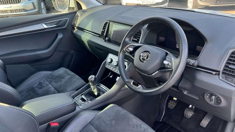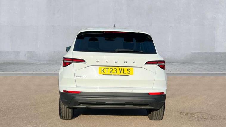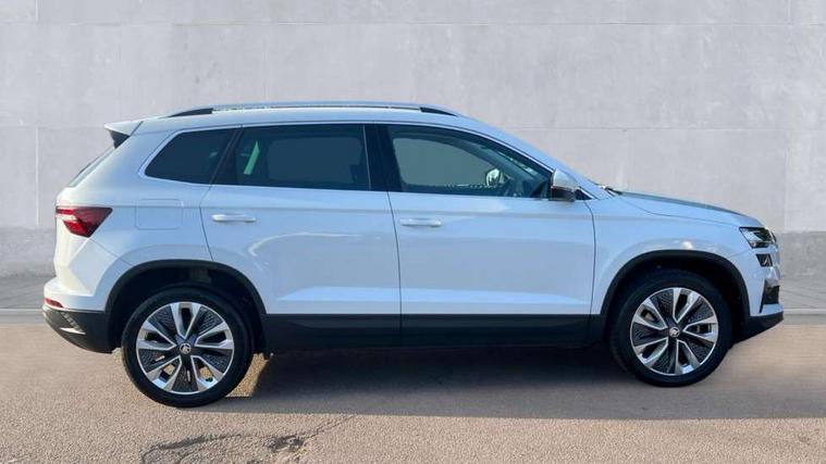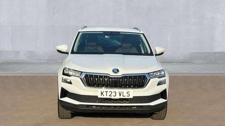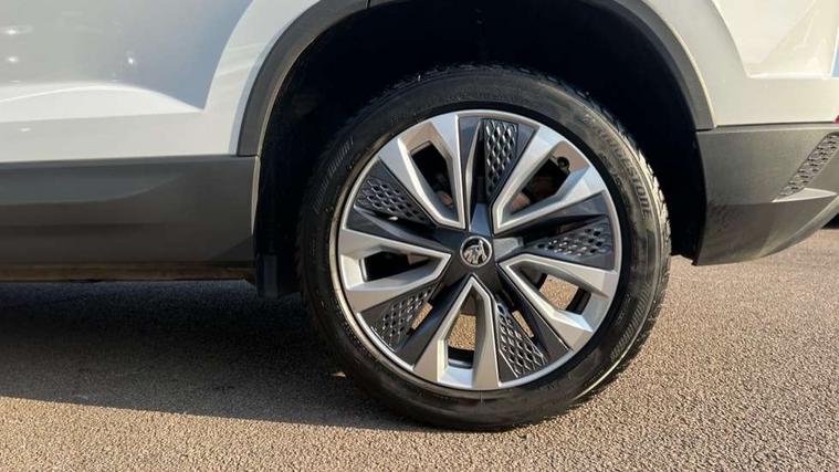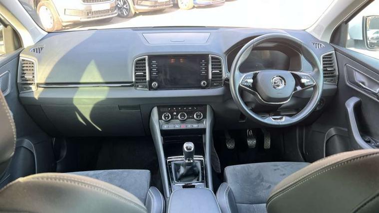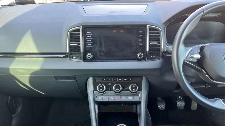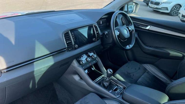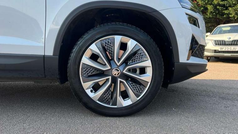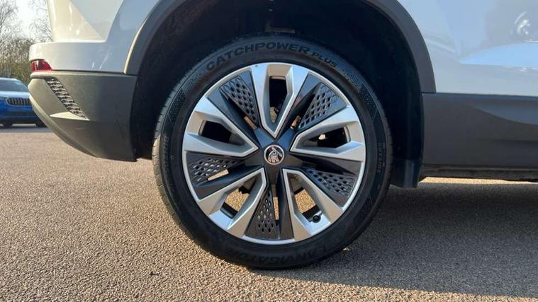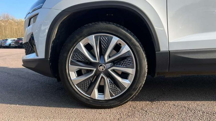 8" Digital display, Care connect, Drive mode selector, Driver fatigue sensor, Electro-mechanical PAS, Emergency services call system, Outside temperature gauge, Service interval indicator, SmartLink wireless for Apple and wired for Android, Start/stop system with regenerative braking, USB C Port x 2 in front centre console, Diesel particulate filter, 8 Speakers, DAB radio with Bluetooth, USB connection, Acoustic glass, Aero front windscreen wipers with intermittent function, Auto dimming rear view mirror with light and rain sensors, Black electric window control buttons, Body colour door mirrors and handles, Dynamic headlight range control with cornering light function, Electric front and rear windows with child proof lock, Heated rear windscreen, LED daytime running lights, LED rear lights with high functionality welcome effect and dynamic indicators, Light assistant (coming/leaving home/tunnel light), Plastic scuff plates, Privacy glass, Rear side wing doors, Rear spoiler, Rear window wiper with washer system and intermittent control, Safety reflectors on front doors, Third brake light, 1.5 litre bottle holders in driver and front passenger door panels, 12V socket in boot, 12v socket in front centre armrest with storage compartment and rear air vents, 2 spoke leather heated multifunction steering wheel, 2 x Tablet holder, 3 rear height adjustable headrests, 3 seat bench in 2nd row, 4 foldable roof handles with rear coat hooks, Black floor carpet, Chrome inner door handles, Decorative door sills with KAROQ badging, Double sided boot floor, Foldable hooks in the boot, Front head restraints, Height adjustable front three point seats belts with tensioners, Height/reach adjust steering wheel, Ice scraper, Illuminated glovebox, Illuminated luggage compartment, Interior noise suppression, Isofix child seat preparation for front passenger seat, Isofix child seat preparation outer rear, Manual lumbar support for front seats, Pen holder, Pollen filter, Rear boot cover, Rear reading lights, Rubbish bin door, Safety vest holder, Single front passenger seat, Storage box in upper central dashboard closed, Sunvisors with illuminated vanity mirrors, Textile floor mats, Ticket holder, VarioFlex seats with standard rear seat release, Boot pack - Karoq, Chrome roof rails + chrome pack - Karoq, Parking pack - Karoq, Automatic door unlocking in case of crash, Automatic fuel cut off in case of crash, Child locks on rear doors, Driver airbag, Electronic parking brake with auto hold function, Emergency rear braking signal, ESC including ABS, MSR, ASR, EDS, HBA, DSR, RBS, MKB and traction control, Front side airbags, Hill hold control, Knee airbags, Passenger airbag with switch-off function, Pedestrian monitor, Seatbelt reminder signalisation and pretensioner for all seats, Three point seatbelts rear, Two tone horn, Tyre pressure display, Tyre pressure monitor, Alarm with interior monitoring, back up horn and tilt sensor with safe function, Electronic engine immobiliser, Keyless entry and start/stop, Remote central locking with 2 remote folding keys, Chrome framed air vents, 18" Procyon silver alloy wheels with anthracite aero inserts, Anti-theft wheel bolts protection, Storage on wheel cover, Tool kit,
