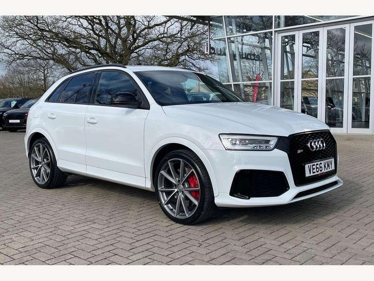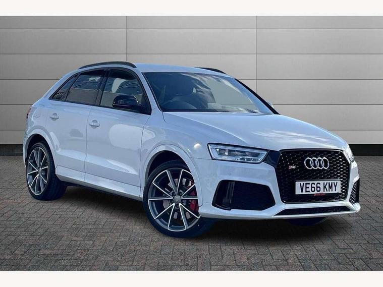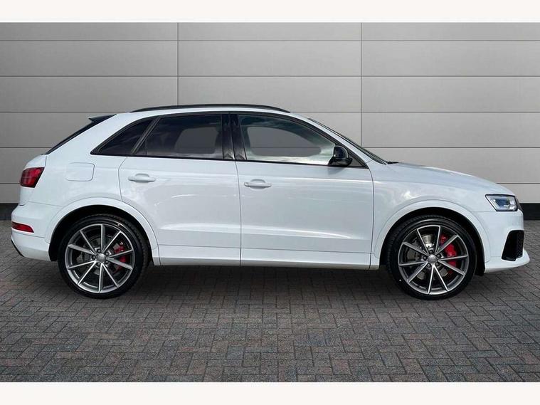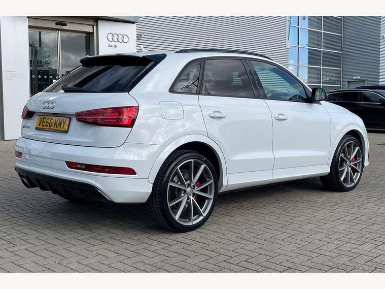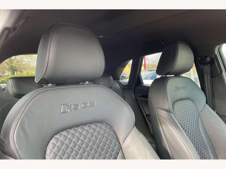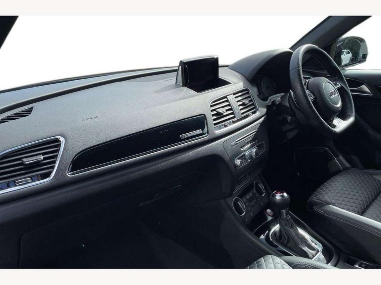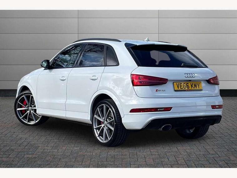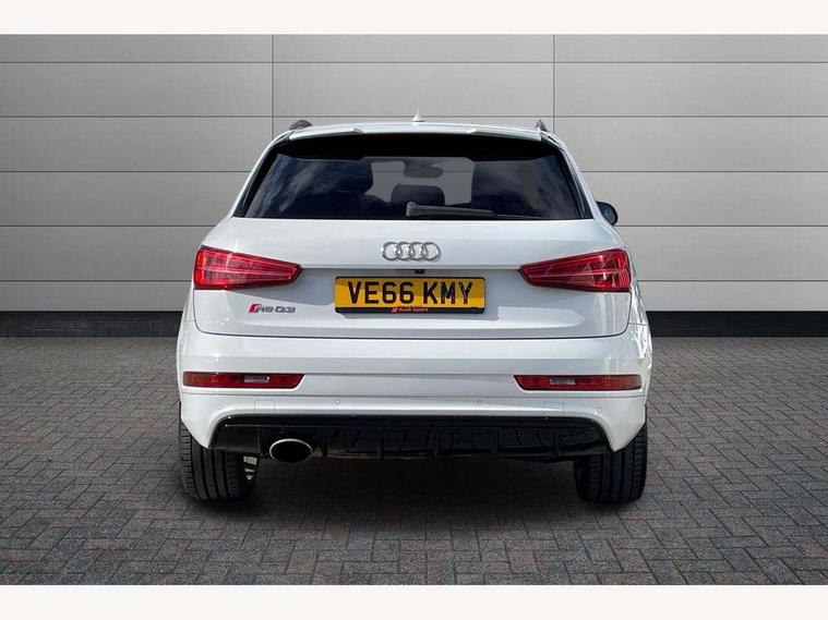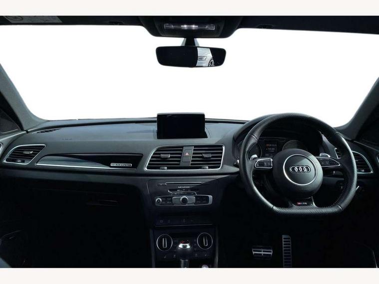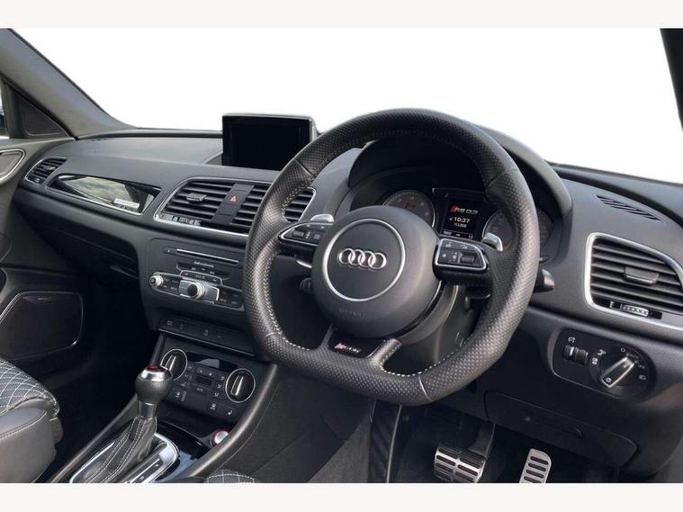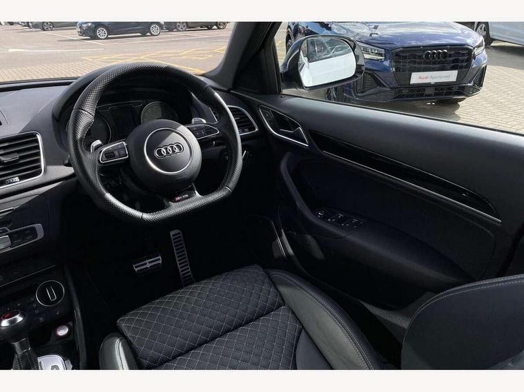 Audi drive select, Colour driver's information system display, Cruise control, Electro-mechanical PAS, Low washer fluid indicator, On board computer, Remote electric boot opening/closing, Service interval indicator, Voice control system, Electronic differential lock, Audi music interface, DAB digital radio module, Acoustic windscreen, Body coloured bumpers, Chrome exhaust tailpipe, Coming home function, Door mirror integrated indicators, Front and rear electric windows, Heated windscreen washer jets, LED headlights with headlight washers, LED rear lights, Light and rain sensor for auto activation of lights and windscreen wipers, Loading sill protector in stainless steel, Privacy glass, Rear wiper, RS design body styling, Sunband for windscreen, Towbar preparation, 12V socket in rear centre console, 2 cupholders, 3 spoke flat bottom multi-function perforated leather steering wheel with contrast stitching and aluminium gearshift paddles, Aluminium door sill trims, Aluminium pedals, Dual zone climate control, Electric front lumbar adjustment, Front and rear headrests, Front and rear interior lights with delay, Front and rear velour floor mats, Front centre armrest with storage compartment and angle adjustment, Front sports seats, Gearshift paddles on steering wheel, Heated front seats, Height/reach adjust steering wheel, Illuminated glovebox, ISOFIX on front passenger and rear outer seats, Jack and tool kit, Luggage compartment lighting, Perforated leather gearknob, Retractable luggage cover, Reversible boot floor, Split fold rear seat, Through load facility + rear centre armrest + cupholders, LED interior light pack - RS Q3, 3x3 point rear seatbelts, ABS+Electronic Brake force Distribution, Curtain airbags, Driver and passenger airbags, Driver and passenger side airbags, EDL + ASR, Electrically operated child locks on rear doors, Electromechanical parking brake, Electronic stability control, First aid kit, Front passenger airbag deactivation, High performance braking system, Hydraulic Brake Assist (HBA), Seatbelt warning light, Tyre pressure monitoring system, Warning triangle, Advanced key, Locking wheel bolts, Remote central locking, Thatcham category 1 alarm + immobiliser, Tyre mobility system,