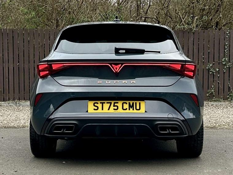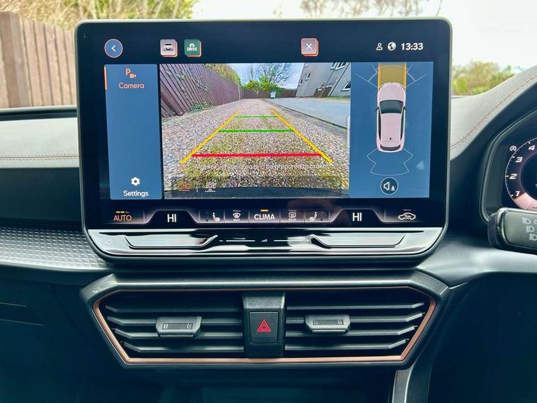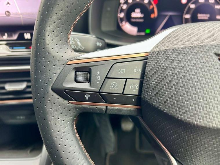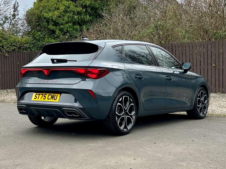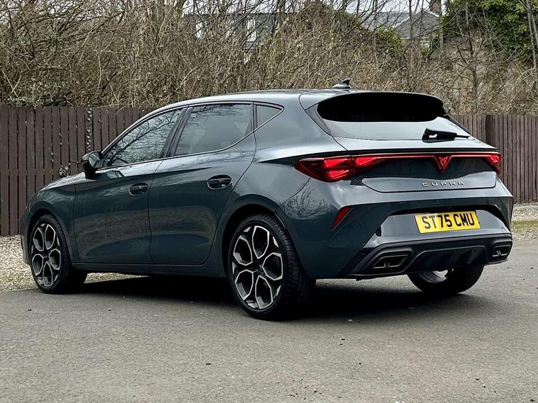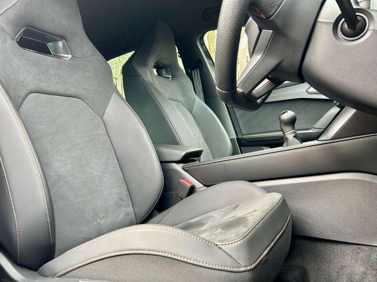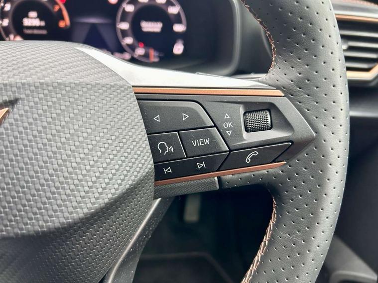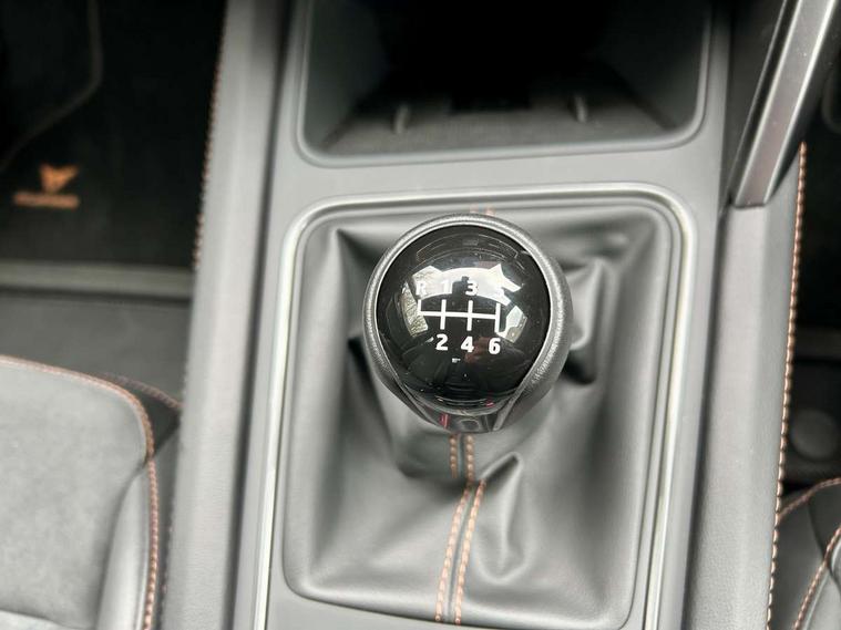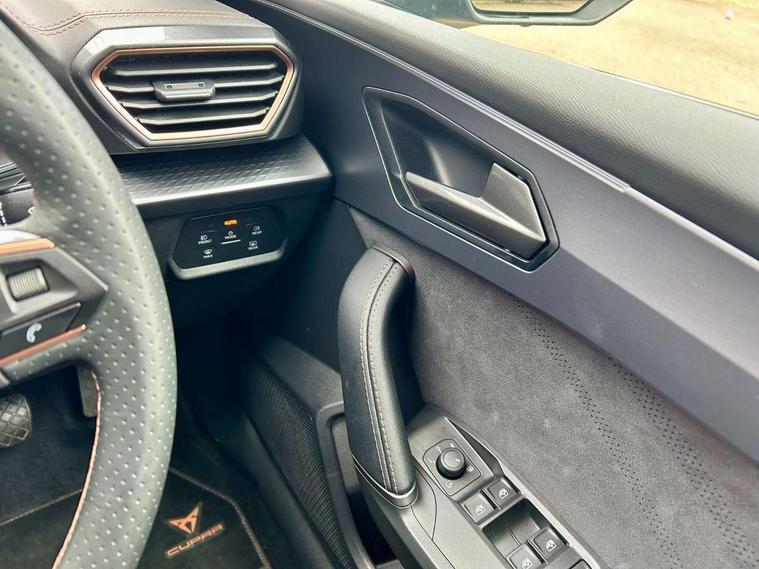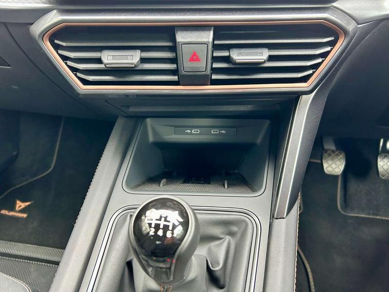 Adaptive cruise control with follow-to-stop and speed limiter, CUPRA drive profile selection with (Comfort/Sport/Individual), throttle response and gearshift mode, Digital cockpit, Dynamic road sign display, E-call, Front and rear parking sensors, Front assist with forward collision warning braking reaction to vehicles, pedestrians and cyclists, Full link smartphone integration with Mirror Link, wireless Apple CarPlay and wired Google Android Auto, Lane assist, Lockable tailgate, Rear view camera, RPM, trip computer, outside temp gauge, instrument light brightness, low fuel warning light, lights on reminder, gearshift indicator, Service interval indicator, Start/stop system with regenerative braking, Wireless phone charger, Auxiliary input socket, Auto dimming rear view mirror, Body colour door handles, Body coloured bumpers, Cupra sports bumpers, Dark tinted rear windows, Electric front/rear windows, Electrically adjustable, heated and folding door mirrors, High beam assist, LED front fog lamps with cornering function, LED headlights with dynamic turn signals, tail lights, rear fog lights with rear coast to coast lighting, LED rear fog lamp, Rain sensing wipers, Rear side wing doors, Rear wash/wipe, Separate daytime running light with automatic headlight control and coming home feature, Third brake light, Welcome light with logo projector in door mirrors, 12v power supply in centre console, 3 seat bench in 2nd row, 5 headrests, 60/40 split rear bench seat with armrest, Ambient lighting (glovebox, footwell, ambient lighting multicoloured), Black headlining, CUPRA Leather flat bottomed, heated, perforated steering wheel, Dinamica cloth upholstery, Electrically adjustable driver seat and lumbar support with memory function + manually adjustable passenger seat, Folding boot cover, Four x USB Type C ports (2 in front and 2 in rear), Front and rear reading lights X 4, Front centre armrest, Heated front seats, Height/reach adjust steering wheel, Illuminated interior front door sills, Interior wraparound lighting, ISOFIX points in outer rear seats with top tether anchorage points, Single front passenger seat, Storage pockets on rear of front seats, Sunvisors with illuminated mirror, Three zone climate control, Dynamic and comfort pack - Leon Cupra, Media system plus with 12.9" display + navigation pack - Leon Cupra, 3 point seatbelts on all rear seats, ABS, Brake control system - ESC and brake booster, Child proof door locks, Cupra black brake calipers, Driver and front passenger airbags with front passenger airbag de-activation, front side and curtain airbags, Electronic parking brake, Hill hold control, Rear disc brakes, Seat belt reminder for front and rear seats, Tiredness recognition system, Tyre pressure monitoring system, Anti theft alarm system with interior monitoring in cab, backup horn and towing protection, KESSY Advanced - Keyless start, keyless entry, Locking wheel bolts, Chrome and copper interior detailing, 19" Polar machined sport black and silver alloy wheel with 91Y tyres, Tool kit,