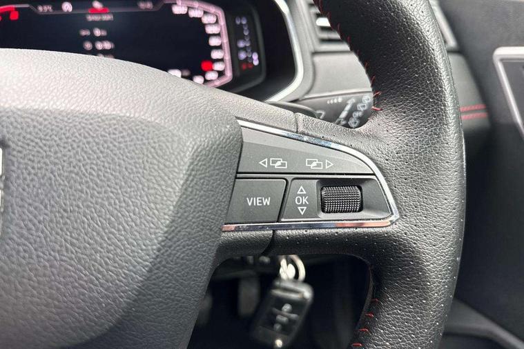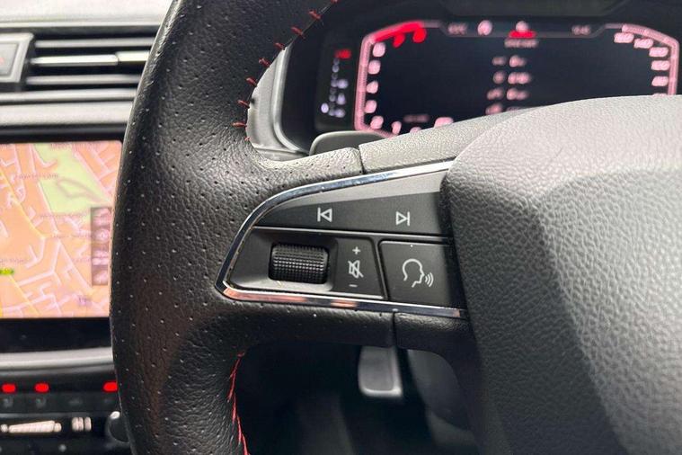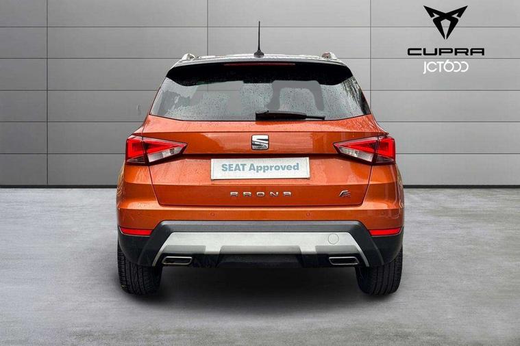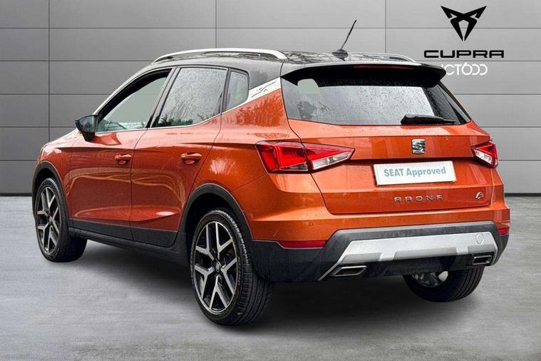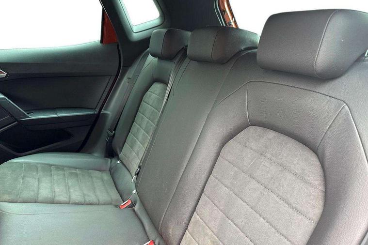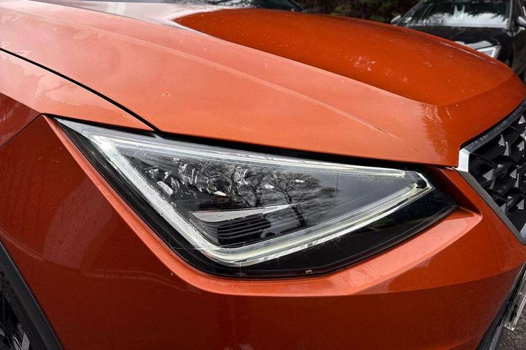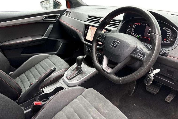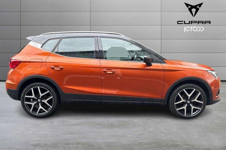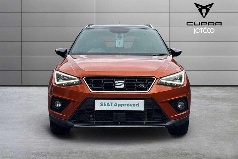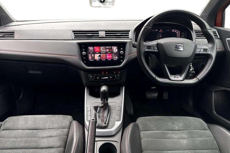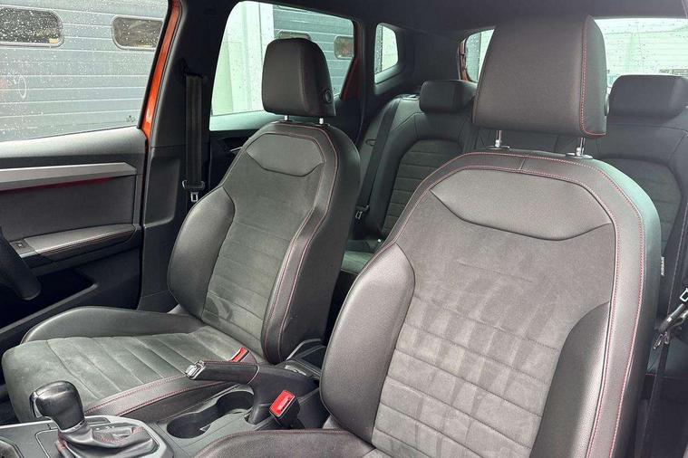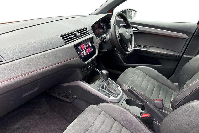 'Lights On' Reminder warning buzzer, Cruise control, Digital clock, Digital cockpit, Electric speed sensitive power steering, Front assistant collision mitigation, Full Link Smartphone Integration with Mirror Link, Apple Car Play, Google Android Auto, Low fuel warning light, Outside temperature display, Rear parking sensor, RPM counter, SEAT Drive profile, Trip computer, Dynamic chassis control, Sports suspension, 6 speakers, Bluetooth interface for hands free and audio streaming, DAB Digital radio, Steering wheel mounted audio controls, Anti theft roof antenna, Auto dimming interior rear view mirror, Automatic activation of hazard warning lights, Automatic headlights, Body coloured bumpers, Body coloured door handle inserts, Chrome grille surround, Chrome roof rails, Chrome window surround, Coming/leaving home lighting function, Dark tinted rear windows, Electric front/rear windows with one touch/auto up/down, Electrically adjustable and heated door mirrors, Electrically folding wing mirrors, Front fog lights, Full LED headlights, Ice metal door side panels, LED daytime running lights, LED licence plate lighting, LED tail lights, Rain sensor windscreen wipers, Rear fog lights, Rear window wash/wipe, Roof colour door mirrors, Twin exhaust pipes, Visible VIN plate, Windshield wiper with intermittent control and potentiometer, 2 cupholders, 3 rear height adjustable headrests, 60/40 split folding rear seat, Active head restraints, Ambient interior lighting, Card holder, Double boot floor, Driver and passenger sunvisors, Driver/front passenger seat height adjustment, Dual zone climate control, Dust/pollen filter, Flat bottomed steering wheel, Footwell ambient lighting, Front courtesy lights, Front reading light, Gear shift indicator, Gearshift paddles on steering wheel, Height/reach adjustable steering column, Illuminated boot, Instrument lighting with brightness control, Isofix attachments on outer rear seats, Leather handbrake, Leather steering wheel and gear knob, Microsuede cloth upholstery, Multi-colour ambient interior lighting, Sports seats, Connectivity pack plus - Arona, 3 point seatbelts on all rear seats, ABS+EBA, Child locks on rear doors, Driver/Front Passenger airbags, Electronic stability control, Front and rear seatbelt reminder, Front side/curtain airbags, Height adjustable active front headrests, Hill hold control + Tyre Pressure monitor, Multi-Collision braking, Passenger airbag deactivate switch, Tiredness recognition system, Traction control, 2 folding remote keys with window open/close function, Alarm with back-up horn, Immobiliser, Locking wheel bolts, Remote central locking + deadlocks, Tow away protection, Interior chrome line trim, 18" Performance alloy wheels,