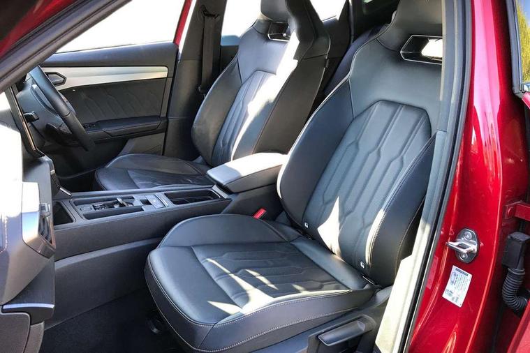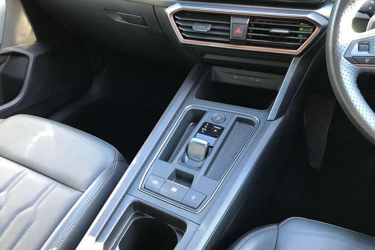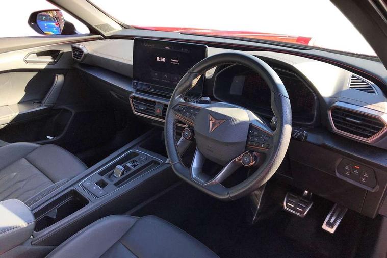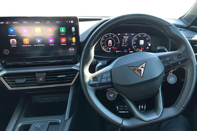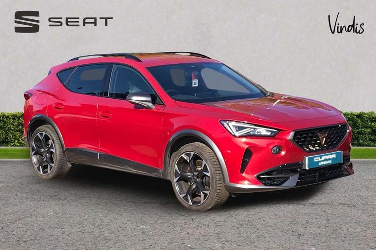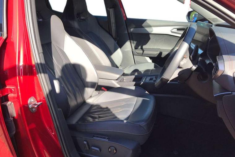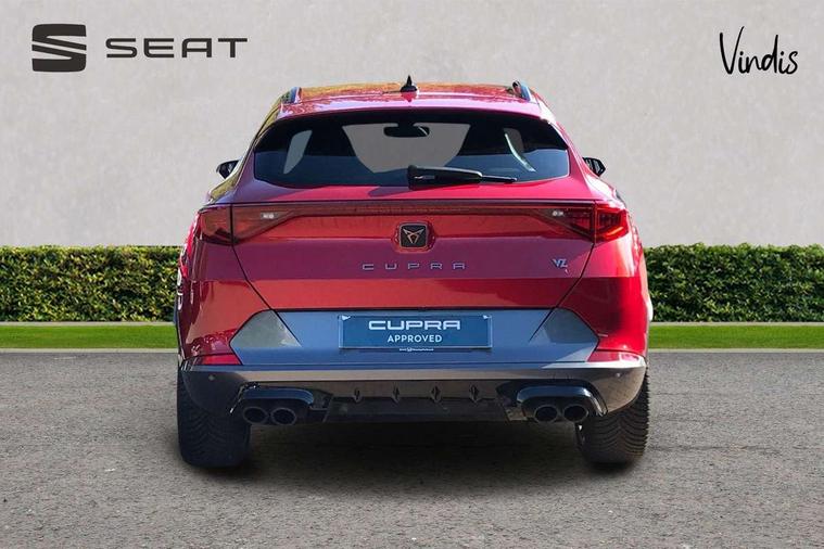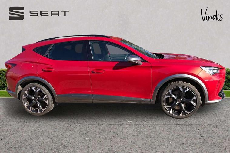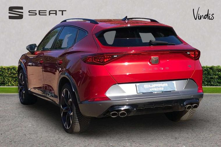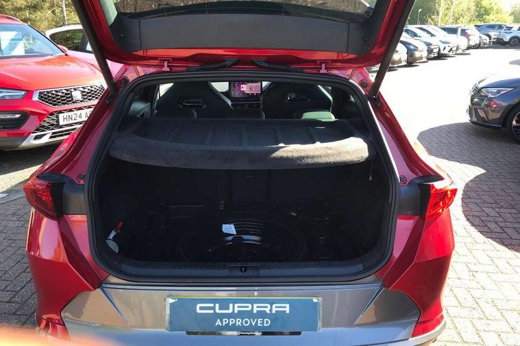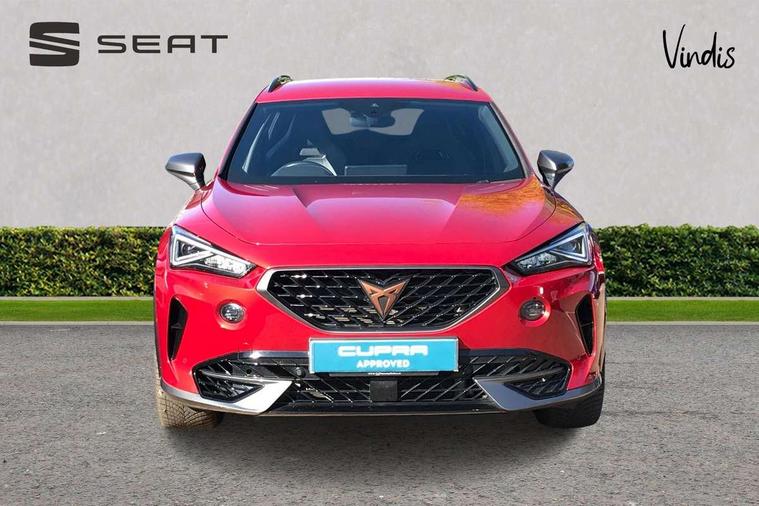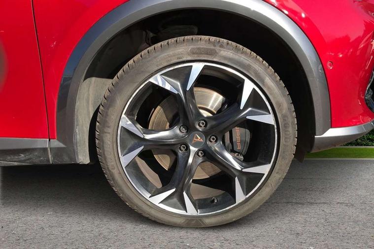 Digital cockpit and configurable dashboard, Driver alert system, Dynamic chassis control with driving profile selection (Comfort, Sport, CUPRA, Individual), Forward collision warning with automatic braking, Lane assist, Navigation system with 12'' Touchscreen Display, Park assist (inc front/rear parking sensors), Predictive adaptive cruise control with speed limiter, Rear view camera, RPM, trip computer, outside temp gauge, instrument light brightness, low fuel warning light, lights on reminder, gearshift indicator, Service interval indicator, Speed sensitive power steering, Start/stop system with regenerative braking, Virtual pedal and electric tailgate, Voice control system, Wireless apple carplay, Wireless phone charger, Electronic locking differential and dynamic traction support, Sports suspension with front shock absoption, 2 front and 2 rear USB type C sockets, Auxiliary input socket, DAB radio, Auto dimming rear view mirror, Body colour door handles, Body coloured bumpers, Dark grey wing mirror, Daytime running light with automatic headlight control and coming home feature, Dynamic headlight range control, Electric front/rear windows, Electrically adjustable heated and folding door mirrors with memory function, Front fog lamps with cornering function, Gloss black roof rails and window surrounds, LED Headlights, LED Taillights with dynamic indicator, Rain sensing wipers, Rear diffuser with twin exhaust pipe on each side, Rear side wing doors, Rear wash/wipe, Sports bumpers, Third brake light, Tinted rear windows, VZ logo rear badging, Welcome lights, 12v power supply in centre console, 12V socket, 12v socket in loadspace, 2 front and 2 rear reading lights, 230V socket, 3 seat bench in 2nd row, 60/40 split rear bench seat with armrest and mechanical seat release, Black headlining, Cupra sports pedals, Dust/pollen filter, Front and rear head restraints, Front centre armrest, Height/reach adjust steering wheel, Illuminated interior front door sills, Illuminated sunvisor with mirror, Isofix, Leather heated multi-function sports steering wheel with start stop, CUPRA mode button and gear shift paddles, Luggage tie-down hooks, Single front passenger seat, Three zone climate control with control panel in rear, Variable luggage/load compartment floor, Wraparound lighting, Genuine Nappa leather Pack - Cupra, Safety and driving pack (XL) - Formentor, 3 point seatbelts on all rear seats, ABS, Brake control system - ESC and brake booster, Child proof door locks, Driver and front passenger airbags with front passenger airbag de-activation, Electronic parking brake, Front and rear disc brakes, Front side curtain airbags, Hill hold control, Public e-call, Seat belt reminder for front and rear seats, Tyre pressure monitoring system, Anti theft alarm system, Keyless entry and start system (KESSY), Locking wheel bolts, Copper and aluminium interior detailing, 19" 'Exclusive' machined sport matte black and silver alloy wheels, Space saver spare wheel,