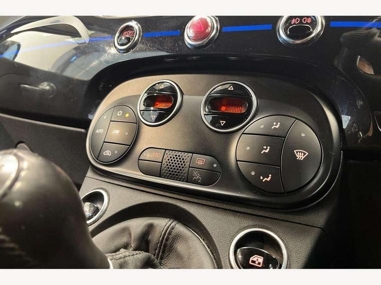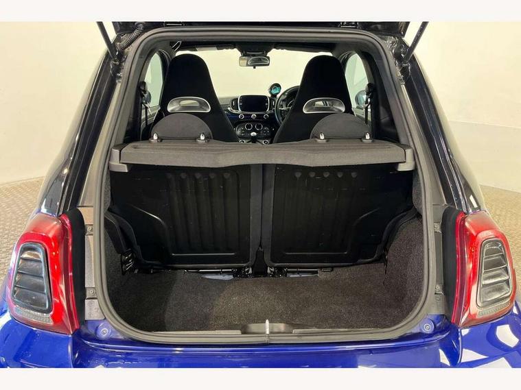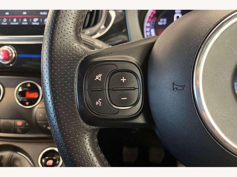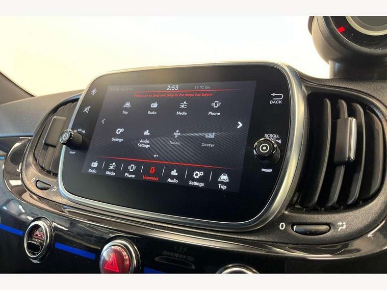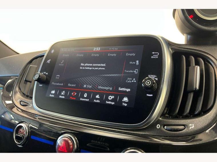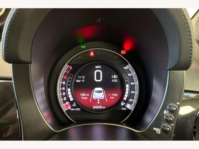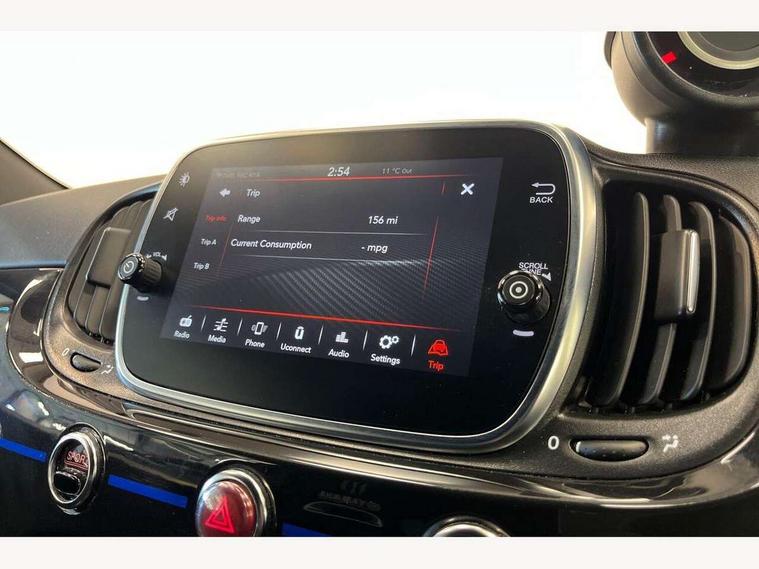 7" TFT instrument display with sports mode, 7" Touchscreen radio with bluetooth, USB and DAB, Apple car play/Android Auto, Dualdrive PAS, Rear parking sensors, Sports button, Trip computer, U-connect access via mobile, Uconnect live service, Front Mac-Phersonsuspension with anti roll-bar, Front telescopic shock absorbers with Frequency Selective Damping (FSD), Koni rear suspension, Torque transfer control (TTC), 6 speakers, Bi-Colour paint finish, Body coloured bumpers, Dark tinted rear windows, Dual mode record monza exhaust system with four tailpipes, Dusk and rain sensors, Electric adjustable door mirrors, Electric front windows, Front bumper with honeycomb grille and embossed Abarth logo, Front fog lights, Grey door mirrors, LED daytime running lights, Monster logo bonnet sticker, Poly elliptical headlights, Rear wiper, Scorpion Antenna Plug, Window integrated aerial with aluminium roof cap, Yamaha logo side sticker, 12V socket, Abarth sport seats, Air conditioning, Aluminium sports pedals, Driver/front passenger seat height adjustment, Fabric upholstery with blue detailing, Front head restraints, Front passenger seat memory, Glovebox, Height adjustable steering wheel, High performance BMC air filter, Interior stowage net, Monster logo and Yamaha logo embroidered on the driver and passenger seat, Rear headrests, Specific floor mats, Specific interior plaque of authenticity, Sports leather multifunction steering wheel with controls and satin chrome detailing, ABS, Driver and passenger airbags, Drivers knee airbag, ESP + ASR/MSR + HBA + Hill holder, Front drilled and perforated brake discs, Front side airbags, Gold brake calipers, High performance perforated brakes, Rear perforated brake discs, Tyre pressure monitoring system, Window airbags, Alarm, Central locking, Immobiliser, Remote central locking, Blue finishing on dashboard, 17" Formula alloy wheels with matt black finish, Black wheel hub caps with grey scorpion, Fix and go kit,