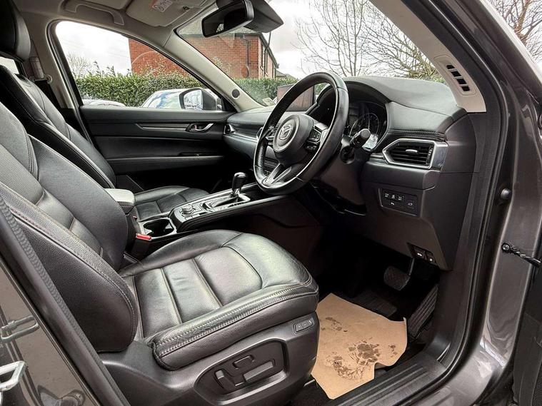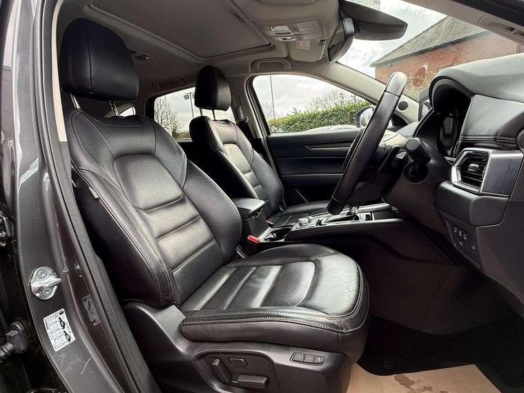 10.25" display with Mazda Connect infotainment, 7" colour TFT display, Advanced blind spot monitoring, Bluetooth connectivity with voice control, Collision prevention assist, Connected services, Cruising Traffic Support, Drive mode selector, Electric power steering, Emergency stop signalling system, Engine start/stop button, Forward collision warning, Front and rear parking sensors, Integrated navigation system, Intelligent speed assist, Lane departure warning system, Lane keep assist, Power liftgate, Qi wireless phone charging, Radar cruise control with Stop and Go, Rear cross traffic alert, Reversing camera, Service indicator, Traffic sign recognition (TSR), Trip computer, Windscreen projected colour active driving display (HUD) with memory, Wireless apple car play/android Auto, Cylinder Deactivation, i-stop, AM/FM radio, Bluetooth audio streaming, Bose premium sound system with 10 speakers, DAB Digital radio, Multimedia Commander including separate volume dial, Steering wheel mounted audio controls, Adaptive front lighting system, Auto dimming rear view mirror, Automatic headlights, Black inlay dashboard panel, Body colour door mirrors, Body colour roof spoiler, Body coloured front and rear black lower bumper mouldings, Coming/leaving home lighting function, Door mirror integrated indicators, Dual chrome tailpipes, Dusk sensitive headlamps, Electric front/rear windows with one touch auto up/down, Front grille in gloss black finish, Front grille in gloss black finish with chrome signature wing, Gloss black B and C pillars garnish, High beam assist, Intermittent rear wash/wipe, LED auto levelling, LED daytime running lights, LED front fog lights, LED Headlights, LED third brake light, Power folding and heated door mirrors, Power tilt/slide sunroof, Privacy glass (rear side windows only), Rain sensing front wipers, Rear side wing doors, Satin black side mouldings, Scuff plates, Shark fin antenna, Signature LED rear combination lights, Variable intermittent front wash/wipe, Vinyl with wood grain metal inlay door trim panel, Windscreen wiper de-icer, 12v electrical power outlet, 3 seat bench in 2nd row, 3 stage heated front seats, 40:20:40 Karakuri fold-flat seat system, 6 way electric adjustable passenger seat, 8 way electric driver seat with lumbar support + memory, Cargo room flat floor board with waterproof undertray, Driver seat power slide, recline and height adjustment, Driver, Front passenger and two rear grab handles with coat hooks, Driver/passenger front seatback pockets, Driver/passenger sunvisors + illuminated vanity mirrors (drivers with ticket holder), Dual zone climate control, Folding centre armrest with 2 cup holders, Front and rear door pockets, Front centre storage with two cupholders, Front passenger seat power slide, recline and height adjustment, Heated steering wheel, Humidity sensor, Illuminated glovebox, Interior dome light with integral spotlight, ISOFIX child seat anchorage points attached on outer rear seats, Karakuri tonneau cover, Leather upholstery, Leather wrapped steering wheel and gear knob, Light roof lining, Luggage compartment LED lighting, Luggage compartment power outlet, Paddle shifts, Rear air vents, Rear headrests, Rear seat recline, Roof mounted sunglasses holder, Single front passenger seat, Three height adjustable head restraints, Tilt/height adjustable steering wheel, USB Connectivity (2x front Type-C, 2x rear Type-B), White interior LED illumination lighting, 3 point front seatbelts with pre-tensioners, 3 rear 3 point seatbelts, ABS, Advanced Smart City Brake Support - SCBS, Child locks on rear doors, Driver and front passenger side airbags, DSTC-Dynamic Stability and Traction Control, Dual front airbags, Electronic brake force distribution, Electronic parking brake with auto hold, ESP, Front and rear curtain airbags, Front passenger airbag deactivation, G-Vectoring control, Hill hold assist, Seatbelt reminder front and rear, Single stage passenger airbags, Smart brake support with forward obstruction warning, Tyre pressure monitoring system, Automatic door locking when moving off, Deadlock, Immobiliser, Power door locks, Remote central locking, Smart keyless entry, Thatcham Cat.1 alarm, 19" diamond cut black alloy wheels, Tyre repair kit,