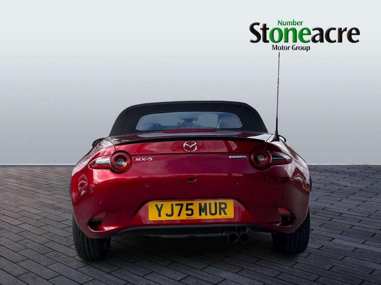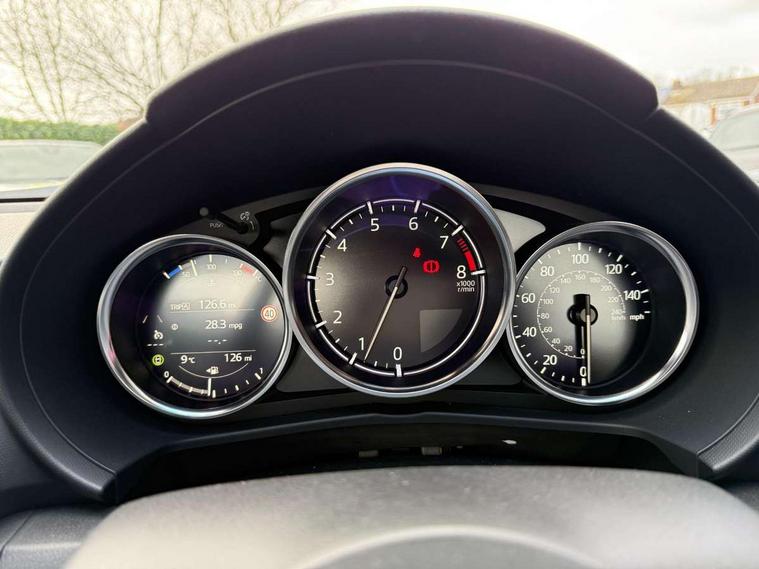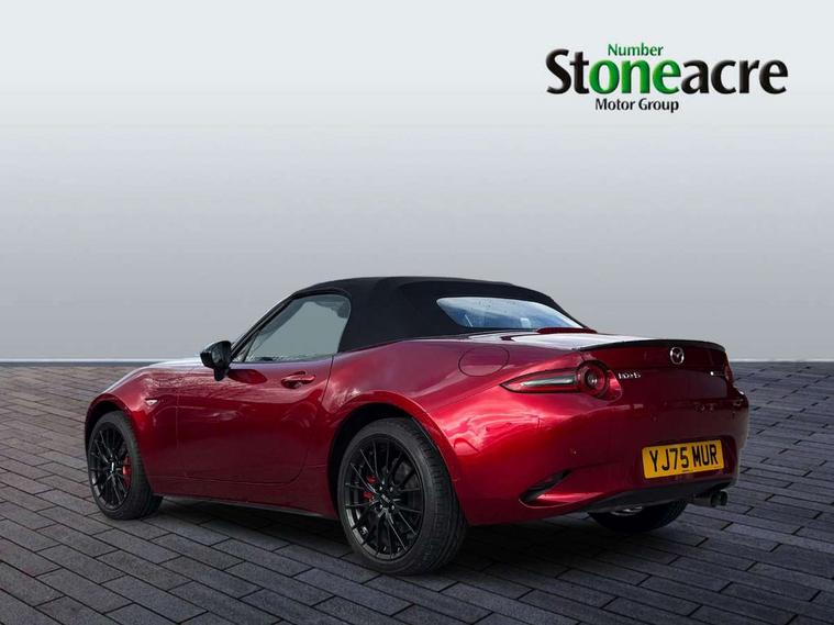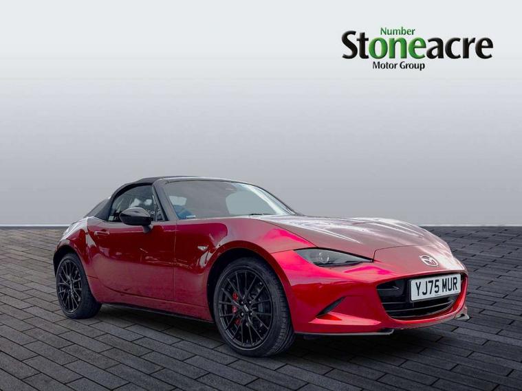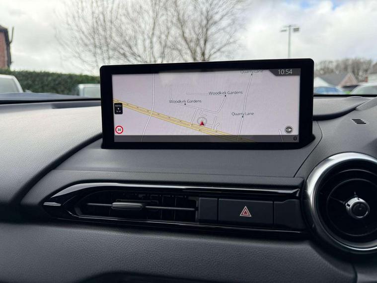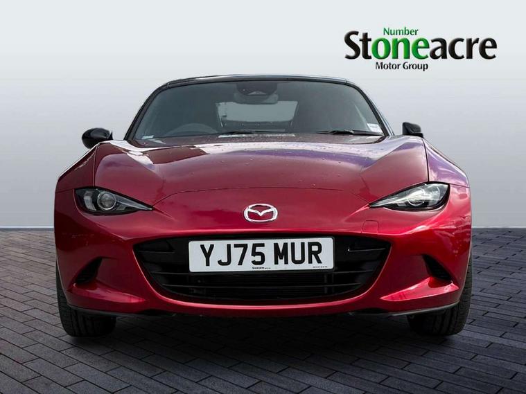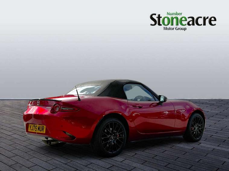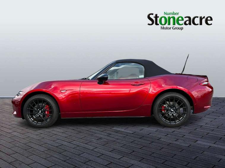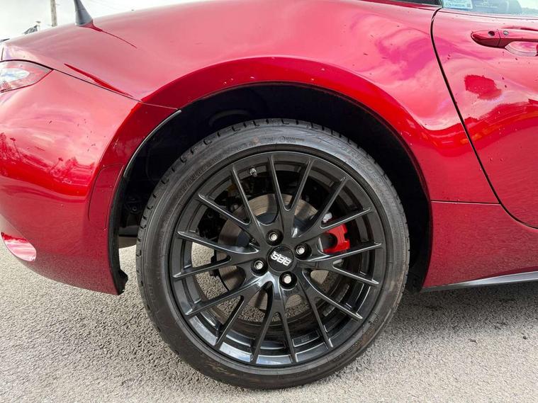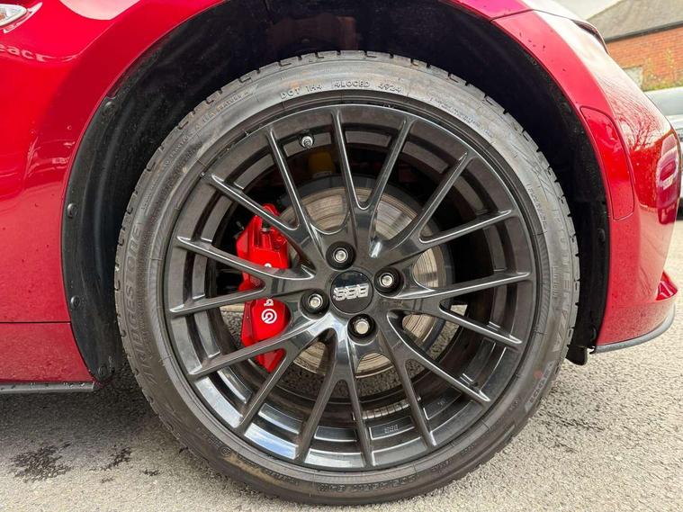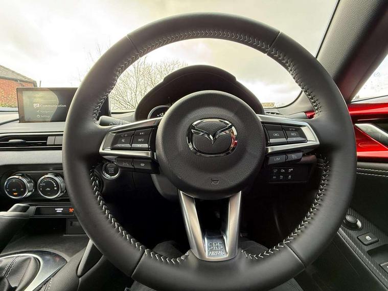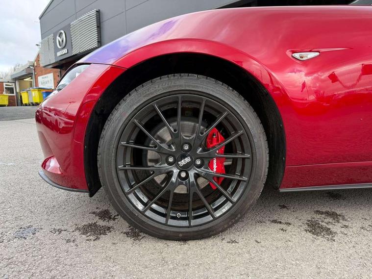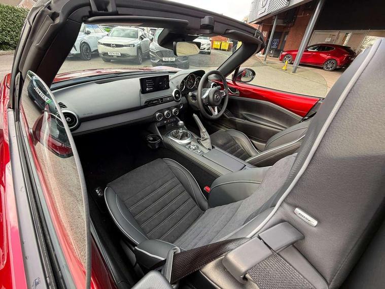 8.8" Colour centre touch screen display with Mazda Connect infotainment, Aha and stitcher app, Analogue speedometer, Apple car play/Android Auto, Blind spot monitoring with rear cross traffic alert, Cruise control with Intelligent speed assist, Driver alert system, eCall emergency call system, Emergency stop signalling system, Engine start/stop button, Hands free phone preparation, Integrated bluetooth with hands-free calling, bluetooth audio and easy access to phone contacts, Integrated navigation system, Kinematic posture control, Lane departure warning system, Lane keep assist, Multi dot display tachometer and electric odometer, PAS, Rear parking sensor, Reversing camera, Service indicator, Traffic sign recognition, Trip computer, Water temperature gauge, Asymmetric limited slip differential, I-ELOOP, i-stop, Sports suspension featuring Bilstein dampers, 2 x USB Type-C inputs, Multimedia Commander including separate volume dial, Premium Bose sound system with 9 speakers with 2 in each front headrest, AM/FM/DAB radio and MP3, Steering wheel mounted audio/bluetooth controls, Adaptive LED Headlights, Automatic headlamp levelling, Body colour bumpers, Body colour co ordinated interior upper door trim, Coming/leaving home lighting function, Dual exhaust pipes, Dusk sensitive headlamps, Electric front windows/one touch facility, Frameless auto dimming rear view mirror, Front intermittent wipers, LED 3rd brake light, LED daytime running lights, LED indicator lights, LED rear lights, Manually operated black premium cloth soft top with heated rear glass window, Piano black electric/heated door mirrors, Piano Black fashion bars, Rain sensing front wipers, Rear boot, Stainless steel scuff plates with MX-5 logo, 12V socket, Alcantara/leather upholstery, Centre console storage box, Chrome Air conditioning dials, Climate control air conditioning, Coin Box, Driver and front passenger sunvisors with covered vanity mirror and driver ticket holder, Driver seat manual slide, recline and tilt adjustment, Front centre armrest, Front head restraints, Gear shift indicator, Heated front seats, in 3 heat levels, Interior courtesy light, ISOFIX front passenger seat child seat compliance, Leather gear knob, Leather handbrake lever, Leather steering wheel, Lockable rear centre box with lid, Passenger seat + manual slide/recline adjust, Recaro sports seats, Single front passenger seat, Strut brace, Tilt/telescopic steering column, Two cupholders, Windblocker, 3 point ELR front seatbelts with pretensioners, ABS+Electronic Brake force Distribution, Deployable Hood System (DHS), Driver and passenger seatbelt reminder audible warning, Dynamic stability control with track mode, Exit warning, Front dual stage driver and single stage front passenger airbags, Front smart city brake support with autonomous emergency braking (SCBS), Hill hold assist, Passenger airbag deactivate switch, Red brembo brake callipers, Side airbags, Smart city brake support - Rear (SCBS-R), Traction control, Tyre pressure monitor, Remote central locking with deadlocking and remote boot release, Smart keyless entry, Superlocking, Thatcham category 1 alarm + immobiliser, Centre Console - Vinyl leather, Chrome air vent surrounds, Dashboard panel - Black Vinyl, Exterior body colour co-ordinated upper door panel trim with black vinyl, 17" BBS Gun Metallic alloy wheels, Tyre puncture repair kit,