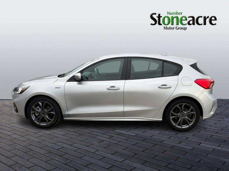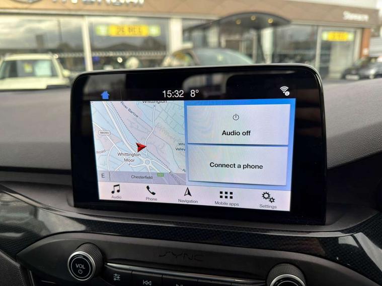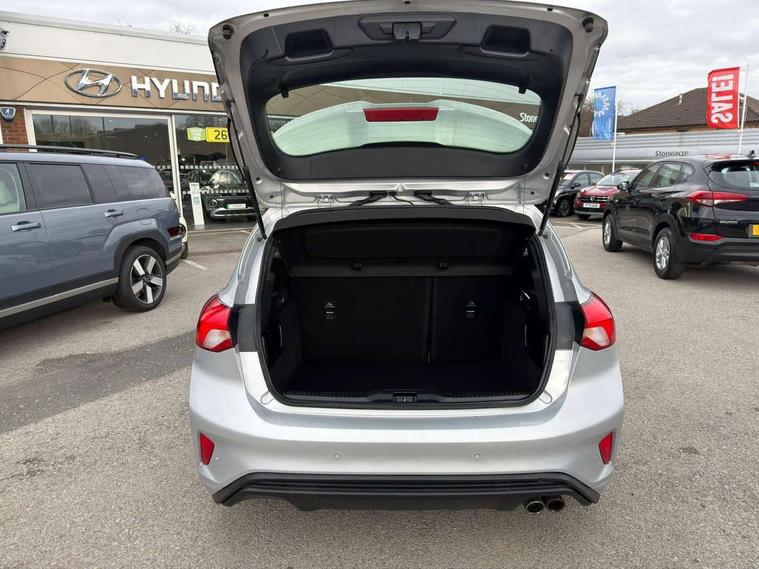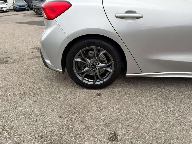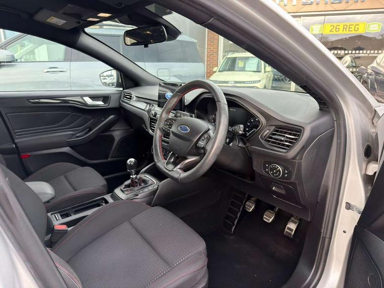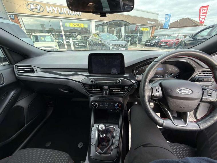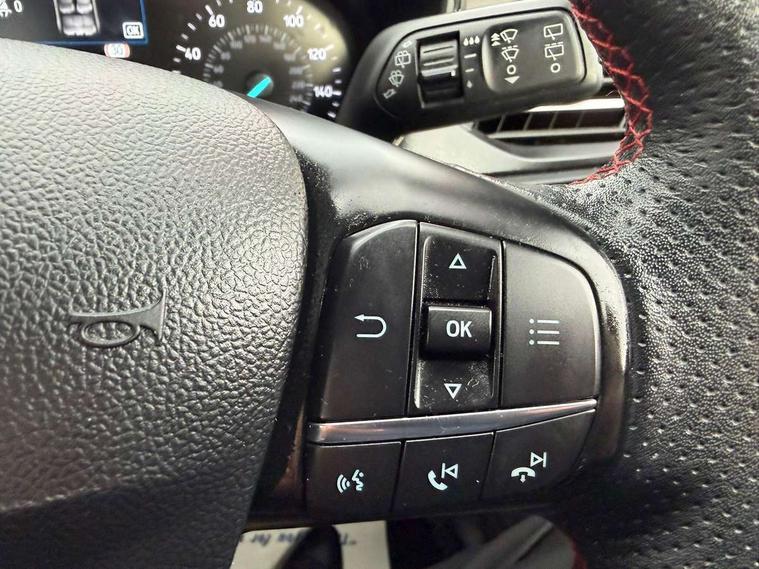 Bluetooth system, Digital clock, Easy fuel capless refuelling system, Eco mode, Ford pass connect, Ford SYNC 3 with 8" TFT touchscreen, and app link Android auto/Apple carplay, Intelligent speed assist, Lane keeping aid with lane departure warning, PAS, Selectable drive mode, Trip computer, Sports tuned suspension, 6 speakers, Aux input, 'Quickclear' heated windscreen/heated washer jets, Auto headlamps (on/off), Body colour large rear spoiler, Body colour side skirt, Body coloured bumpers, Body coloured door handles, Body coloured electrically operated and heated door mirrors with side indicators, Electrically operated front and rear windows with one touch opening and closing, Front variable intermittent wipers with electric wash, Halogen reflector headlamps, Heated rear window, LED daytime running lamp, LED front fog lamps with cornering function, Polished twin tailpipe, ST-Line upper and lower grille with full body styling kit and wing badges, Tailgate wash/wipe, 3 spoke flat bottomed leather steering wheel with red stitching, 60/40 split back and cushion rear seats with 2 height adjustable headrests, Alloy finish pedals, Aluminium gear knob, Centre console with armrest, Cloth upholstery with red stitching, Dark headliner, Driver's lumbar support, Front floor mats, Height adjustable front headrests, Isofix child seat preparation, Manual air conditioning, Reach + rake adjustable steering column, Rear centre headrest, ABS+Electronic Brake force Distribution, Auto hold function, Driver airbag, Electronic parking brake, Electronic stability control, Front and rear seatbelt reminder, Front inertia reel height adjustable seatbelts with pre-tensioners, Front passenger airbag, Front side airbags, Hill start assist, Passenger airbag deactivate switch, Post collision braking, Pre collision assist with autonomous emergency braking and pedestrian/cyclist detection, Side curtain airbags, Three rear inertia reel lap/diagonal seatbelts, Tyre pressure monitoring system, Keyless start with 'Ford Power' starter button, MyKey system, Remote central locking & engine immobiliser, Thatcham category 1 alarm, Contrast stitching - Red, 17" 5x2 spoke alloy wheels with rock metallic finish, Mini steel spare wheel,