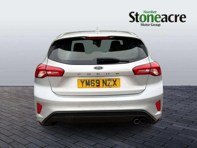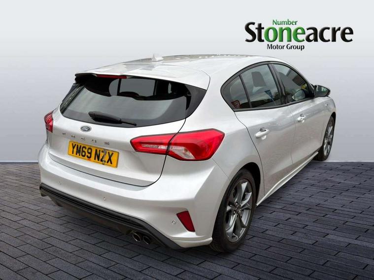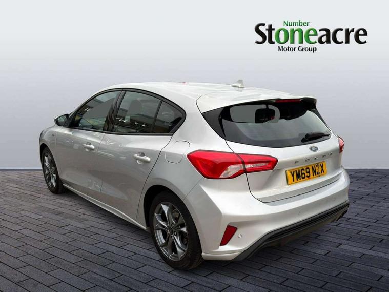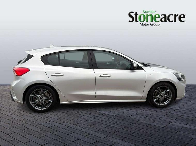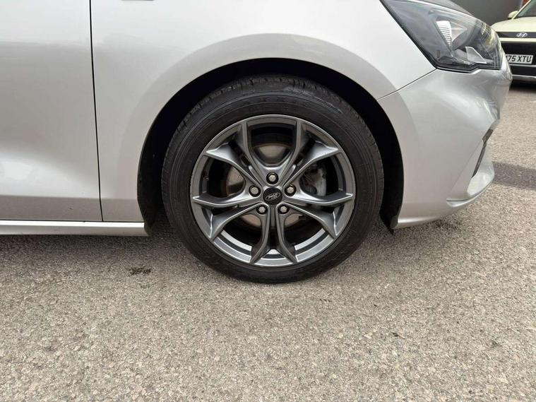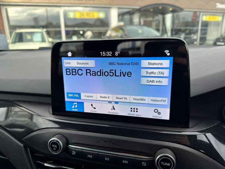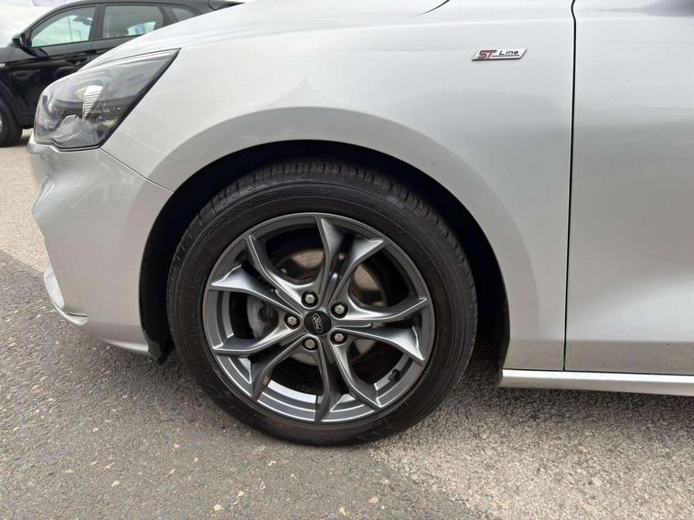 Bluetooth system, Digital clock, Easy fuel capless refuelling system, Eco mode, Ford pass connect, Ford SYNC 3 with 8" TFT touchscreen, and app link Android auto/Apple carplay, Intelligent speed assist, Lane keeping aid with lane departure warning, PAS, Selectable drive mode, Trip computer, Sports tuned suspension, 6 speakers, Aux input, 'Quickclear' heated windscreen/heated washer jets, Auto headlamps (on/off), Body colour large rear spoiler, Body colour side skirt, Body coloured bumpers, Body coloured door handles, Body coloured electrically operated and heated door mirrors with side indicators, Electrically operated front and rear windows with one touch opening and closing, Front variable intermittent wipers with electric wash, Halogen reflector headlamps, Heated rear window, LED daytime running lamp, LED front fog lamps with cornering function, Polished twin tailpipe, ST-Line upper and lower grille with full body styling kit and wing badges, Tailgate wash/wipe, 3 spoke flat bottomed leather steering wheel with red stitching, 60/40 split back and cushion rear seats with 2 height adjustable headrests, Alloy finish pedals, Aluminium gear knob, Centre console with armrest, Cloth upholstery with red stitching, Dark headliner, Driver's lumbar support, Front floor mats, Height adjustable front headrests, Isofix child seat preparation, Manual air conditioning, Reach + rake adjustable steering column, Rear centre headrest, ABS+Electronic Brake force Distribution, Auto hold function, Driver airbag, Electronic parking brake, Electronic stability control, Front and rear seatbelt reminder, Front inertia reel height adjustable seatbelts with pre-tensioners, Front passenger airbag, Front side airbags, Hill start assist, Passenger airbag deactivate switch, Post collision braking, Pre collision assist with autonomous emergency braking and pedestrian/cyclist detection, Side curtain airbags, Three rear inertia reel lap/diagonal seatbelts, Tyre pressure monitoring system, Keyless start with 'Ford Power' starter button, MyKey system, Remote central locking & engine immobiliser, Thatcham category 1 alarm, Contrast stitching - Red, 17" 5x2 spoke alloy wheels with rock metallic finish, Mini steel spare wheel,
