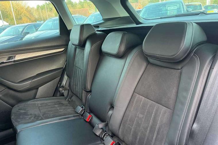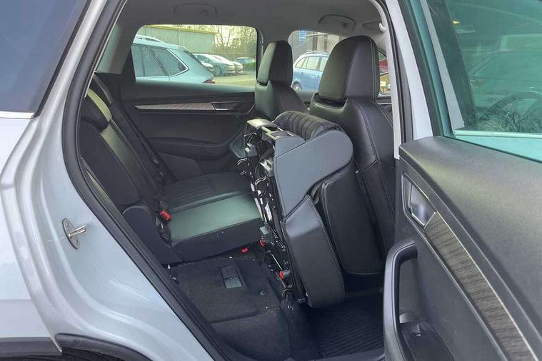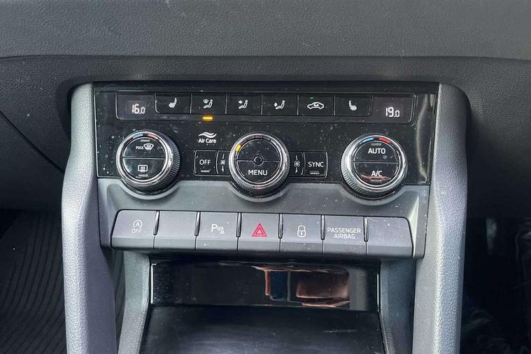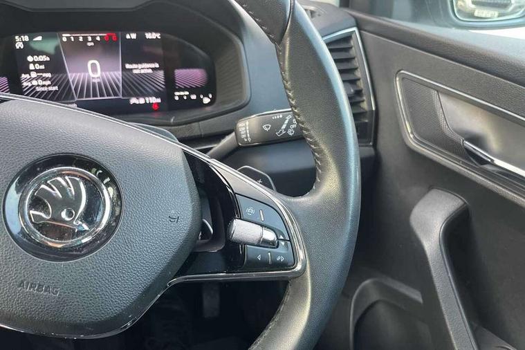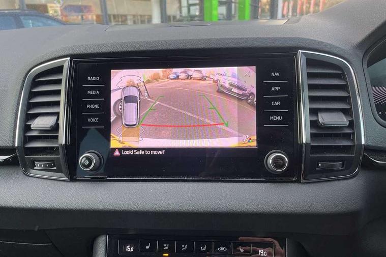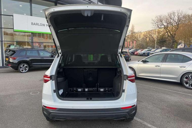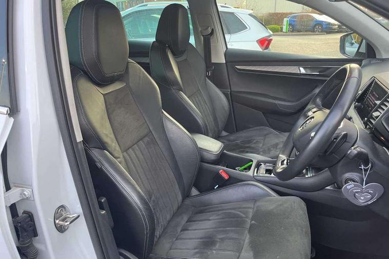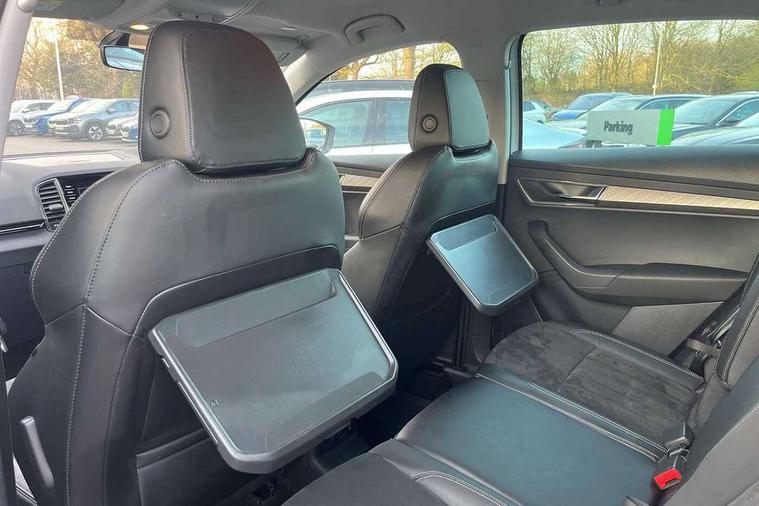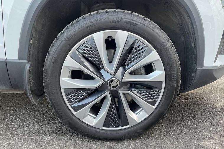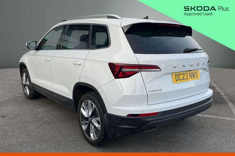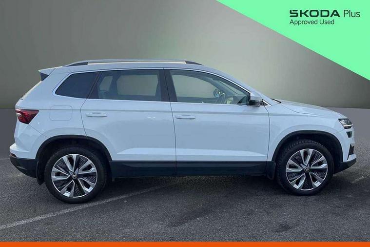 8" Digital display, Care connect, Driver fatigue sensor, Emergency services call system, Outside temperature gauge, Service interval indicator, SmartLink wireless for Apple and wired for Android, Start/stop system with regenerative braking, USB C Port x 2 in front centre console, 8 Speakers, DAB radio with Bluetooth, USB connection, Acoustic glass, Aero front windscreen wipers with intermittent function, Auto dimming rear view mirror with light and rain sensors, Black electric window control buttons, Body colour door mirrors and handles, Dynamic headlight range control with cornering light function, Electric front and rear windows with child proof lock, Heated rear windscreen, LED daytime running lights, LED rear lights with high functionality welcome effect and dynamic indicators, Light assistant (coming/leaving home/tunnel light), Plastic scuff plates, Privacy glass, Rear side wing doors, Rear spoiler, Rear window wiper with washer system and intermittent control, Safety reflectors on front doors, 1.5 litre bottle holders in driver and front passenger door panels, 12V socket in boot, 12v socket in front centre armrest with storage compartment and rear air vents, 2 spoke leather heated multifunction steering wheel with DSG paddles, 2 x Tablet holder, 3 rear height adjustable headrests, 3 seat bench in 2nd row, 4 foldable roof handles with rear coat hooks, Black floor carpet, Chrome inner door handles, Decorative door sills with KAROQ badging, Double sided boot floor, Foldable hooks in the boot, Front head restraints, Height adjustable front three point seats belts with tensioners, Height/reach adjust steering wheel, Ice scraper, Illuminated glovebox, Illuminated luggage compartment, Isofix child seat preparation for front passenger seat, Isofix child seat preparation outer rear, Manual lumbar support for front seats, Pen holder, Pollen filter, Rear boot cover, Rear reading lights, Rubbish bin door, Safety vest holder, Single front passenger seat, Storage box in upper central dashboard closed, Sunvisors with illuminated vanity mirrors, Textile floor mats, Ticket holder, VarioFlex seats with standard rear seat release, Boot pack - Karoq, Chrome roof rails + chrome pack - Karoq, Parking pack - Karoq, Automatic door unlocking in case of crash, Automatic fuel cut off in case of crash, Child locks on rear doors, Driver airbag, Electronic parking brake with auto hold function, Emergency rear braking signal, ESC including ABS, MSR, ASR, EDS, HBA, DSR, RBS, MKB and traction control, Front side airbags, Hill hold control, Knee airbags, Passenger airbag with switch-off function, Pedestrian monitor, Seatbelt reminder signalisation and pretensioner for all seats, Three point seatbelts rear, Two tone horn, Tyre pressure display, Tyre pressure monitor, Alarm with interior monitoring, back up horn and tilt sensor with safe function, Electronic engine immobiliser, Keyless entry and start/stop, Remote central locking with 2 remote folding keys, Chrome framed air vents, 18" Procyon silver alloy wheels with anthracite aero inserts, Anti-theft wheel bolts protection, Storage on wheel cover, Tool kit,