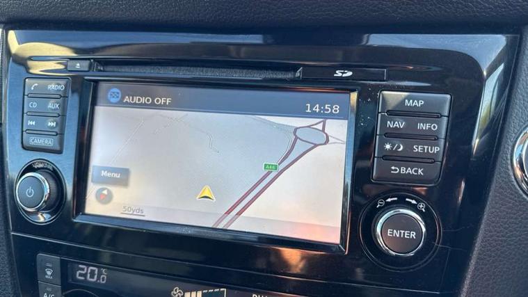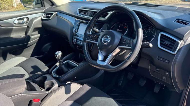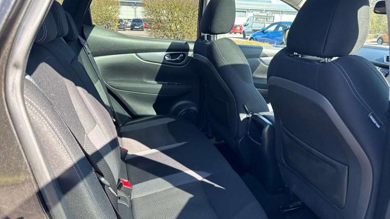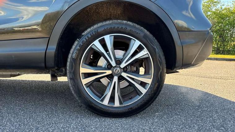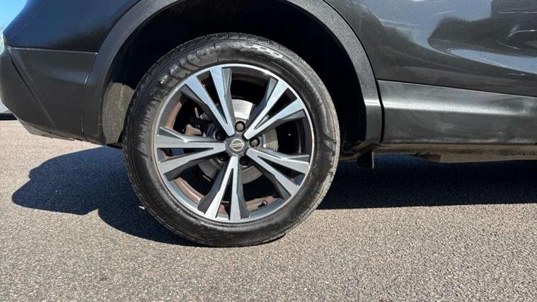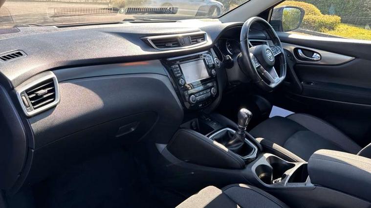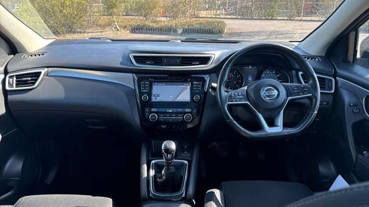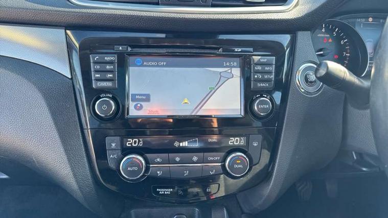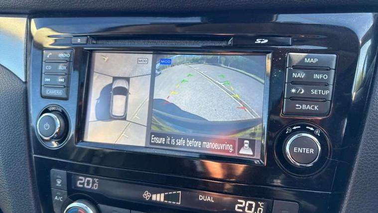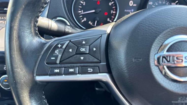 Piano black interior trim, 18" Bi-colour alloy wheels, Tyre puncture repair kit, Alarm, Immobiliser, Intelligent Key, Remote central locking, 'Shark fin' mobile antenna, 6 speakers, DAB Digital radio, Radio/CD, Smartphone apps, Steering wheel mounted audio controls, USB/aux input socket, ABS, brake assist and EBD, Child locks on rear doors, Curtain airbags, Driver/front passenger airbag, Electronic parking brake, ESP + traction control, Forward emergency braking, Front passenger airbag deactivation, Height adjustable front seatbelts, Hill start assist, Seatbelt warning, Side airbags, Three 3 point rear seatbelts, Tyre pressure monitoring system, Automatic headlamp activation, Body colour bumpers, Body colour door handles, Body colour door mirrors, Chrome window surround, Electric folding and heated door mirrors, Front fog lights, High beam assist, Interior mirror with auto anti dazzle, LED indicators in door mirrors, Matt silver roof rails, One touch electric front/rear windows, Privacy glass, Rain sensor windscreen wipers, Rear roof spoiler, Rear wiper, 2 X front 12v power sockets, 60/40 split folding rear seat, Ambient interior lighting, Centre console with armrest, Chrome interior door handles, Cloth upholstery, Configurable luggage board system, Driver + front passenger lumbar support, Dual zone climate control, Front and rear door pockets with bottle holders, Front headrests, Front seat belt pre-tensioners with load limiters, Height adjustable driver's seat, Height adjustable passenger seat, Illuminated electric window switch, Isofix child seat preparation, Leather gearknob, Leather interior door handles, Leather knee rest, Leather steering wheel, Luggage compartment lighting, Parcel shelf, Pollen filter, Rake/reach adjustable steering wheel, Rear armrest with 2 cupholders, Rear headrests, 5" TFT driver information centre, Around View Monitor, Bluetooth phone integration system, Cruise control, Electric speed sensitive power steering, Front and rear parking sensors, Lane departure warning system, Nissan connect sat nav system, Outside temperature display, Push button starter, Rear view camera, Service interval indicator, Speed limiter, Traffic sign recognition, Trip computer,