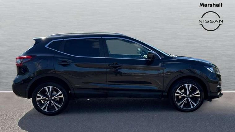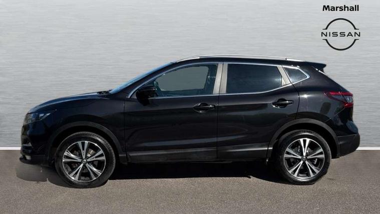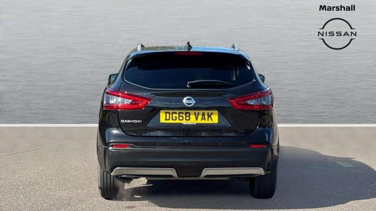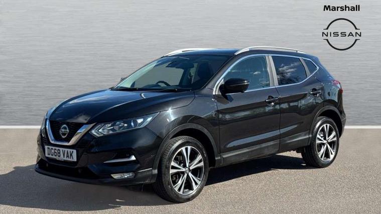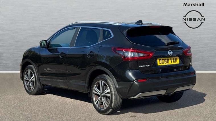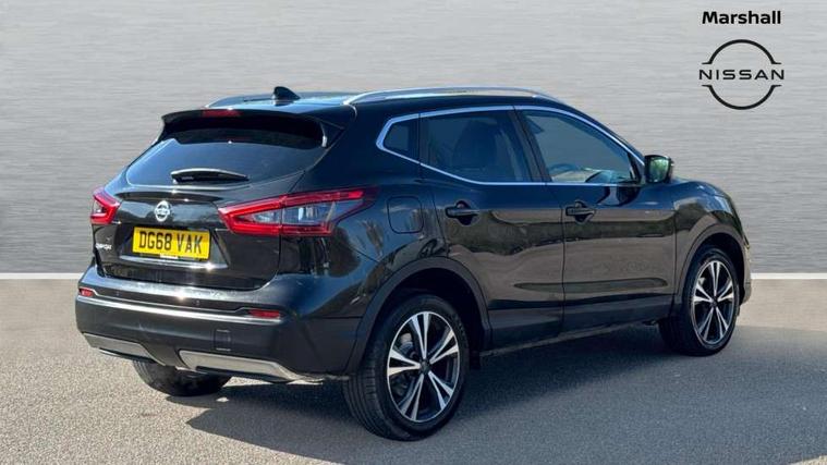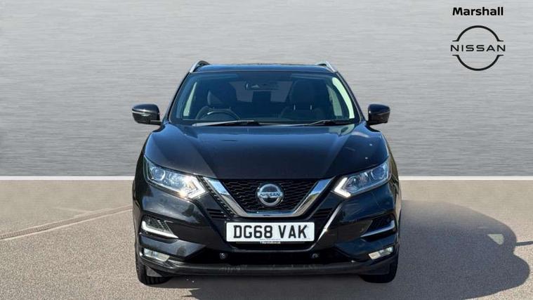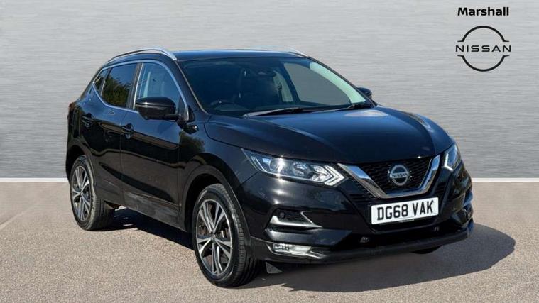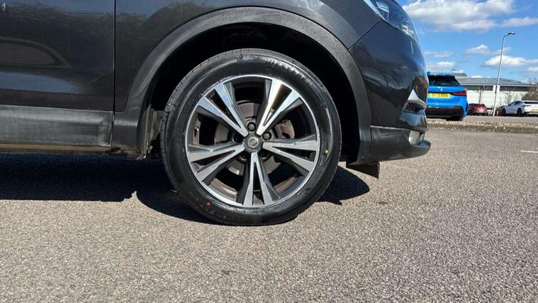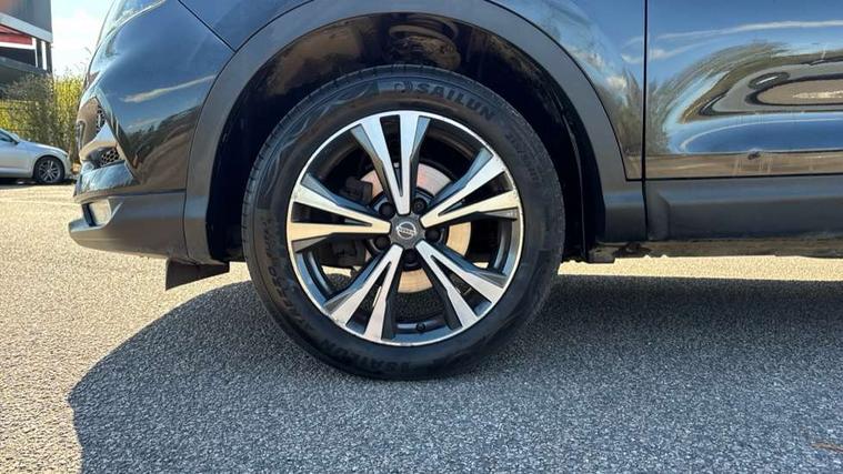 Piano black interior trim, 18" Bi-colour alloy wheels, Tyre puncture repair kit, Alarm, Immobiliser, Intelligent Key, Remote central locking, 'Shark fin' mobile antenna, 6 speakers, DAB Digital radio, Radio/CD, Smartphone apps, Steering wheel mounted audio controls, USB/aux input socket, ABS, brake assist and EBD, Child locks on rear doors, Curtain airbags, Driver/front passenger airbag, Electronic parking brake, ESP + traction control, Forward emergency braking, Front passenger airbag deactivation, Height adjustable front seatbelts, Hill start assist, Seatbelt warning, Side airbags, Three 3 point rear seatbelts, Tyre pressure monitoring system, Automatic headlamp activation, Body colour bumpers, Body colour door handles, Body colour door mirrors, Chrome window surround, Electric folding and heated door mirrors, Front fog lights, High beam assist, Interior mirror with auto anti dazzle, LED indicators in door mirrors, Matt silver roof rails, One touch electric front/rear windows, Privacy glass, Rain sensor windscreen wipers, Rear roof spoiler, Rear wiper, 2 X front 12v power sockets, 60/40 split folding rear seat, Ambient interior lighting, Centre console with armrest, Chrome interior door handles, Cloth upholstery, Configurable luggage board system, Driver + front passenger lumbar support, Dual zone climate control, Front and rear door pockets with bottle holders, Front headrests, Front seat belt pre-tensioners with load limiters, Height adjustable driver's seat, Height adjustable passenger seat, Illuminated electric window switch, Isofix child seat preparation, Leather gearknob, Leather interior door handles, Leather knee rest, Leather steering wheel, Luggage compartment lighting, Parcel shelf, Pollen filter, Rake/reach adjustable steering wheel, Rear armrest with 2 cupholders, Rear headrests, 5" TFT driver information centre, Around View Monitor, Bluetooth phone integration system, Cruise control, Electric speed sensitive power steering, Front and rear parking sensors, Lane departure warning system, Nissan connect sat nav system, Outside temperature display, Push button starter, Rear view camera, Service interval indicator, Speed limiter, Traffic sign recognition, Trip computer,