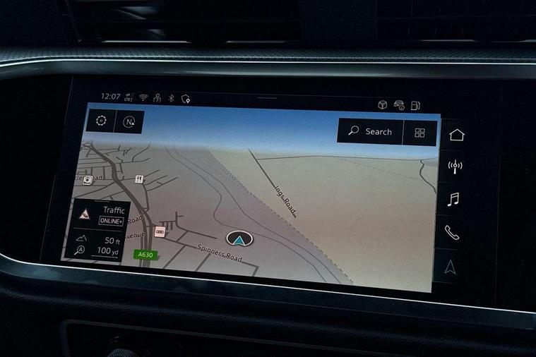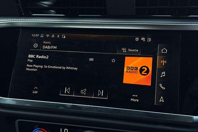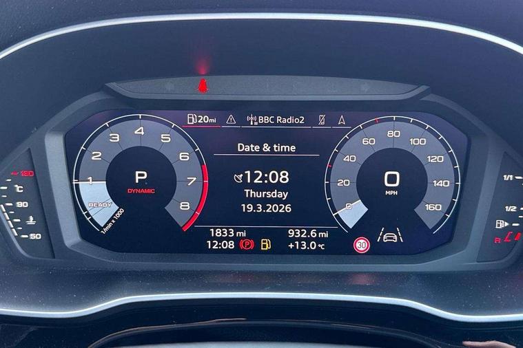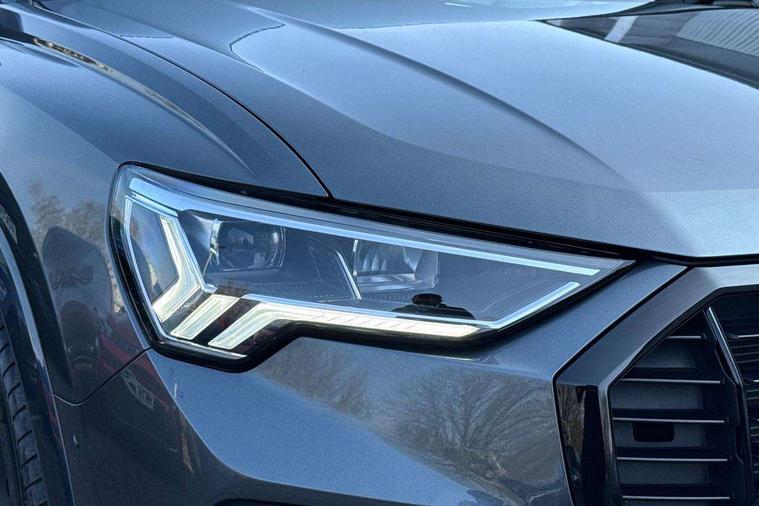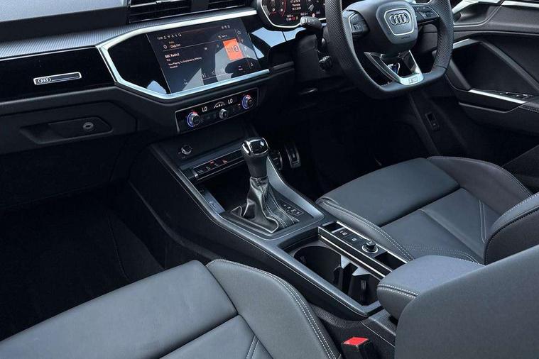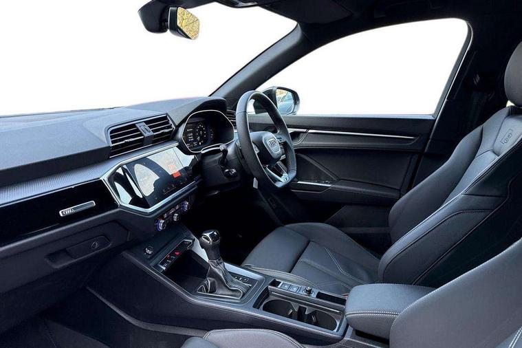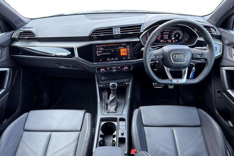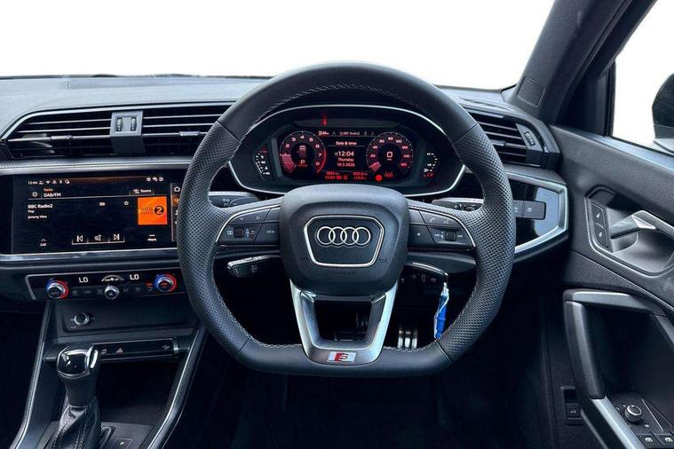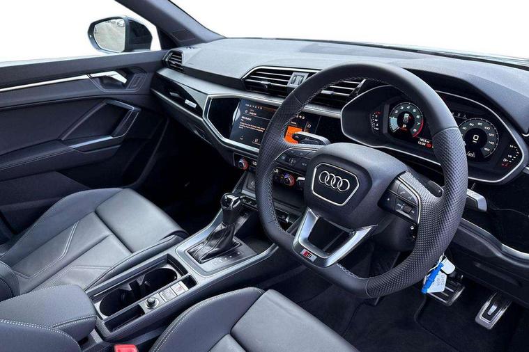 Amazon alexa Integration, Audi connect safety and service, Audi drive select, Audi lane departure warning, Audi Virtual Cockpit - 10.25" display, Bluetooth interface, Camera based traffic sign recognition, Distraction and Fatigue warning, Legal emergency call, MMI Navigation Plus with high resolution 10.1 inch touchscreen colour display, Power operated tailgate, Progressive steering, Service interval indicator, Smartphone interface includes wireless Apple carplay/Android Auto, Start stop system with recuperation, Voice control system with natural language interaction, Sports suspension, 2 USB-C ports with charge and data functions, 6 passive loudspeakers, DAB digital radio module, Acoustic windscreen, Anthracite black radiator grille, Audi Beam uses LEDs to project the Audi logo onto the ground as you exit your Q3, Auto dimming door mirrors, Auto dimming frameless rear view mirror, Black roof rails, Electrically folding, adjustable and heated door mirrors with integrated LED side indicators and kerb view function for passenger side, Front and rear electric windows, Front fog lights, Grille vertical bars in aluminium silver/Matt, High gloss black finish B and C pillars, LED Dynamic rear indicators, LED headlights with LED daytime running lights, LED rear lights, LED third brake light, Privacy glass dark tinted rear and rear-side windows (from B-pillar backwards), Rain and light sensors, Rear diffuser grille in grained matt black, Rear diffuser strip in matt anthracite black, Rear side wing doors, Rear wiper, S line bumpers in contrasting Manhattan grey, Variable front intermittent wipers, 12V socket in rear centre console, 3 seat bench in 2nd row, 40:20:40 folding with manual adjustment for 60:40 forwards/backwards position and backrest angle, Adjustable rear seat bench/backrest with centre armrest and cupholder, Black carpet mats, Black cloth headlining, Dual zone electronic climate control, Electric lumbar support, Front and rear black floor mats with contrast stitching in rock grey, Front and rear headrests, Front centre armrest, Height and reach adjustable steering wheel, Illuminated door sill trims with S logo, ISOFIX child seat mounting for front passenger with airbag deactivation and outer rear seat including top tether attachment point for outer rear seats, Luggage compartment sill protection in stainless steel, Manual front seats with height adjustment, Perforated leather gearknob, Single front passenger seat, Stainless steel pedals, Twin leather upholstery with front sport seats + S embossing, Black styling pack - Q3, Non smoking pack - Q3, 3x3 point rear seatbelts, 6 airbags - Driver, front passenger, curtain and side windows, Audi pre-sense front with pedestrain and cyclist recognition, Electrically operated child locks on rear doors, Electromechanical parking brake, Electronic stabilisation control including ABS, ASR and EDL, Front seatbelt reminder, Hill descent control, Hill hold assist, Pre sense basic, Seatbelt monitoring, Tyre pressure warning, Warning triangle and first aid kit, Anti theft wheel bolts, Immobiliser, Remote central locking, Thatcham approved category 1 anti theft alarm, Aluminium look interior elements, Detail dashboard around MMI touch colour display in glass look, black with surround in aluminium look, Leatherette door armrest, Piano black inlay,
