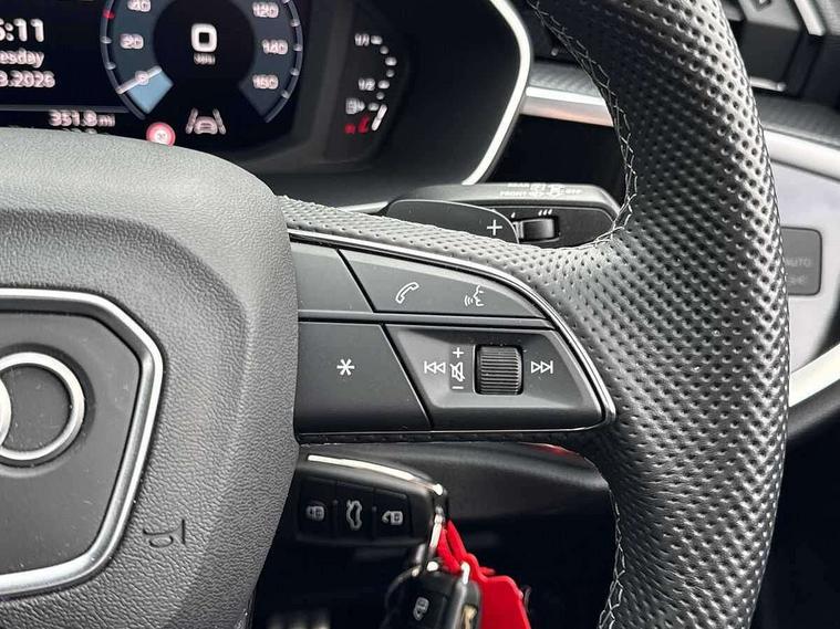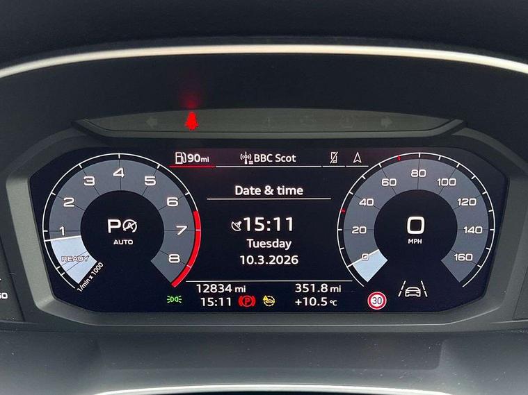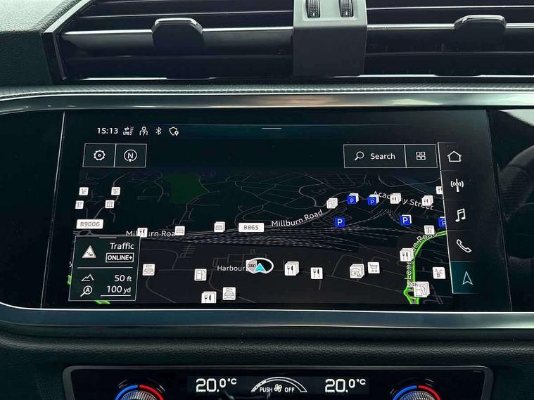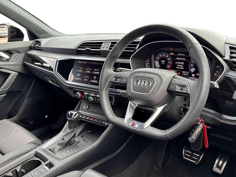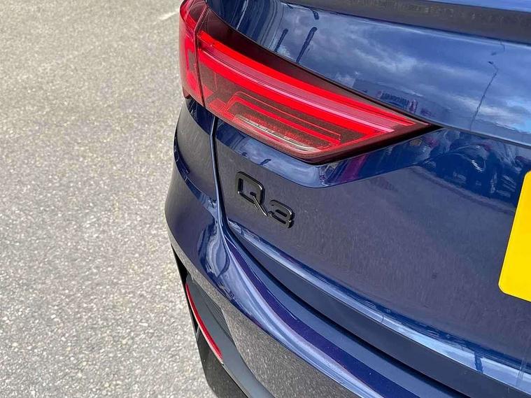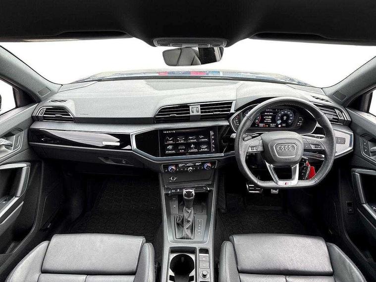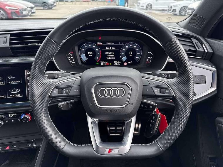Audi drive select, Audi lane departure warning, Audi Virtual Cockpit - 10.25" display, Bluetooth interface, Camera based traffic sign recognition, Legal emergency call, MMI Navigation Plus with high resolution 10.1 inch touchscreen colour display, Power operated tailgate, Progressive steering, Service interval indicator, Smartphone interface includes wireless Apple carplay/Android Auto, Start stop system with recuperation, Voice control system with natural language interaction, Sports suspension, 2 USB-C ports with charge and data functions, 6 passive loudspeakers, DAB digital radio module, Acoustic windscreen, Auto dimming frameless rear view mirror, Diffuser grille in grained matt black, Diffuser trim in selenite silver, Electrically folding, adjustable and heated door mirrors with integrated LED side indicators and kerb view function for passenger side, Front and rear electric windows, Front fog lights, Front underbody protection in manhattan grey paint finish, High gloss black finish B and C pillars, LED Dynamic rear indicators, LED headlights with LED daytime running lights, LED rear lights, LED third brake light, Privacy glass dark tinted rear and rear-side windows (from B-pillar backwards), Rain and light sensors, Rear side wing doors, Rear underbody protection in matt black, Rear wiper, Variable front intermittent wipers, 12V socket in rear centre console, 3 seat bench in 2nd row, 40:20:40 folding with manual adjustment for 60:40 forwards/backwards position and backrest angle, Adjustable rear seat bench/backrest with centre armrest and cupholder, Black cloth headlining, Dual zone electronic climate control, Front and rear black floor mats with contrast stitching, Front and rear headrests, Front and rear roof module including reading lights, Front centre armrest, Glove compartment lighting, Height and reach adjustable steering wheel, Illuminated door sill trims with S logo, ISOFIX child seat mounting for front passenger with airbag deactivation and outer rear seat including top tether attachment point for outer rear seats, Luggage compartment light right in white, Luggage compartment sill protection in stainless steel, Manual front seats with height adjustment, Perforated leather gearknob, Single front passenger seat, Stainless steel pedals, Ambient lighting pack - Q3, Black styling pack - Q3, Non smoking pack - Q3, 3x3 point rear seatbelts, 6 airbags - Driver, front passenger, curtain and side windows, Audi pre-sense front with pedestrain and cyclist recognition, Electrically operated child locks on rear doors, Electromechanical parking brake, Electronic stabilisation control including ABS, ASR and EDL, Front seatbelt reminder, Hill descent control, Hill hold assist, Pre sense basic, Seatbelt monitoring, Tyre pressure warning, Warning triangle and first aid kit, Anti theft alarm, Anti theft wheel bolts, Immobiliser, Remote central locking, Aluminium look interior elements, Black dashboard, Detail dashboard around MMI touch colour display in glass look, black with surround in aluminium look, Leatherette door armrest, Piano black inlay, 19" 5 twin arm design diamond cut audi sport alloy wheels in matt grey look,