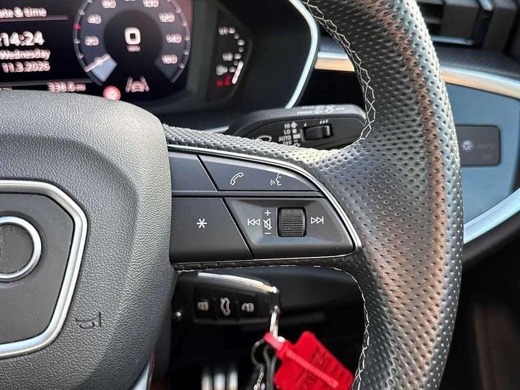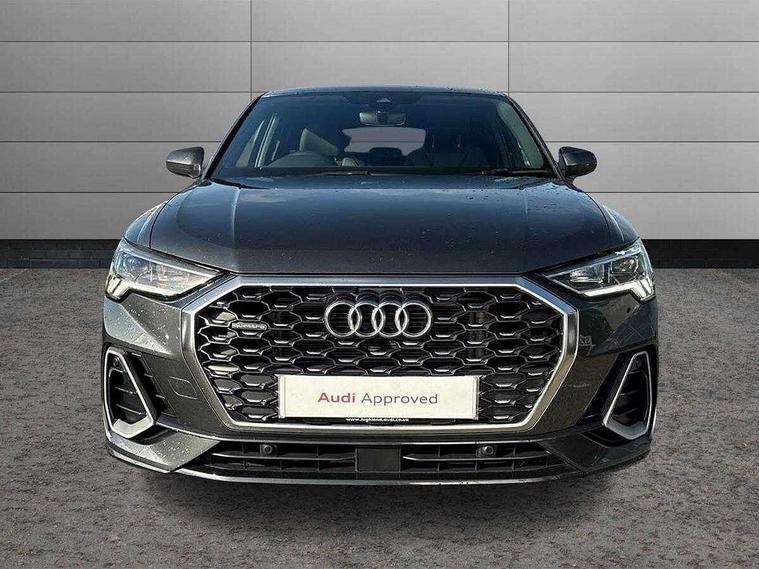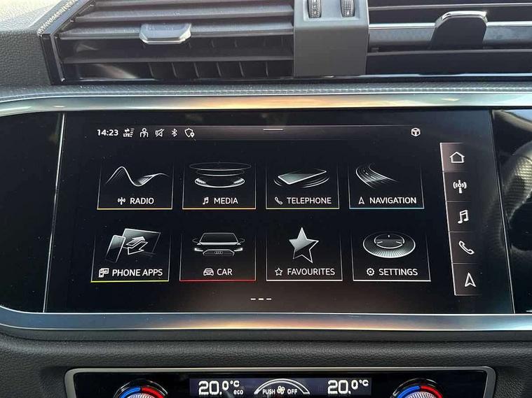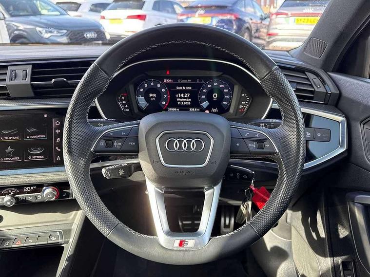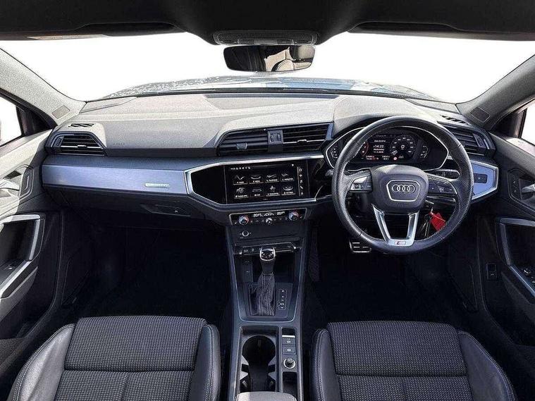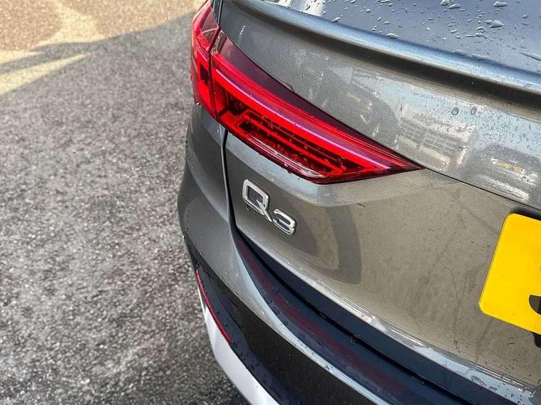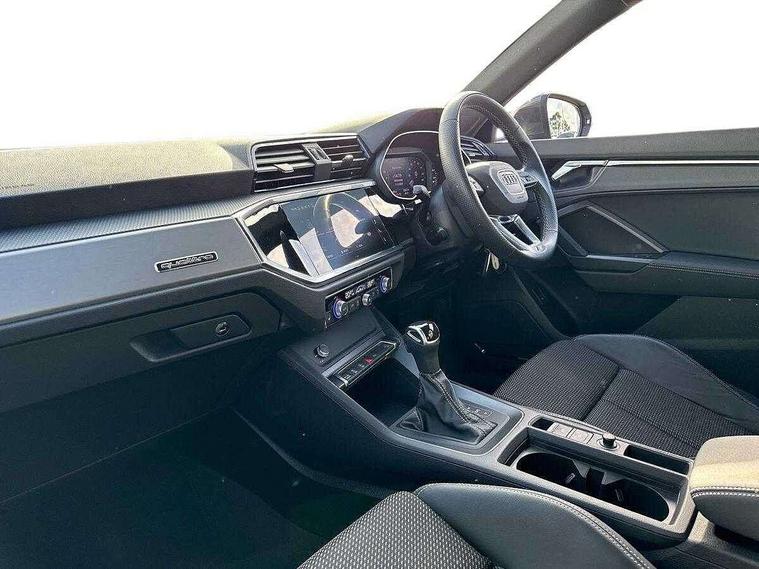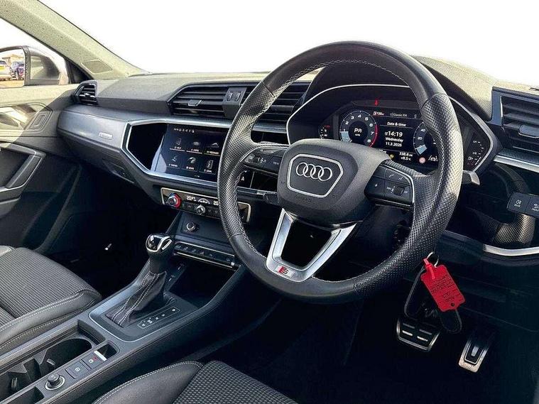 Audi drive select, Audi lane departure warning, Audi Virtual Cockpit - 10.25" display, Bluetooth interface, Camera based traffic sign recognition, Legal emergency call, MMI Navigation Plus with high resolution 10.1 inch touchscreen colour display, Power operated tailgate, Progressive steering, Service interval indicator, Smartphone interface includes wireless Apple carplay/Android Auto, Start stop system with recuperation, Voice control system with natural language interaction, Sports suspension, 2 USB-C ports with charge and data functions, 6 passive loudspeakers, DAB digital radio module, Acoustic windscreen, Aluminium window trim, Auto dimming frameless rear view mirror, Diffuser grille in grained matt black, Diffuser trim in selenite silver, Electrically folding, adjustable and heated door mirrors with integrated LED side indicators and kerb view function for passenger side, Front and rear electric windows, Front fog lights, Front side air inlets in selenite silver, Front underbody protection in manhattan grey paint finish, Grille surround in aluminium silver matt, High gloss black finish B and C pillars, LED Dynamic rear indicators, LED headlights with LED daytime running lights, LED rear lights, LED third brake light, Privacy glass dark tinted rear and rear-side windows (from B-pillar backwards), Radiator grille in anthracite black with inlay in matt aluminium silver, Rain and light sensors, Rear side wing doors, Rear underbody protection in matt black, Rear wiper, S line badges on front wings, S line front and rear bumpers and side skirts in contrasting Manhattan grey paint finish, Side skirt insert in matt Platinium grey, Variable front intermittent wipers, 12V socket in rear centre console, 3 seat bench in 2nd row, 3 spoke leather multifunction steering wheel features S badging and grips in perforated leather with contrast stitching, 40:20:40 folding with manual adjustment for 60:40 forwards/backwards position and backrest angle, Adjustable rear seat bench/backrest with centre armrest and cupholder, Black cloth headlining, Dual zone electronic climate control, Front and rear black floor mats with contrast stitching, Front and rear headrests, Front and rear roof module including reading lights, Front centre armrest, Glove compartment lighting, Height and reach adjustable steering wheel, Illuminated door sill trims with S logo, ISOFIX child seat mounting for front passenger with airbag deactivation and outer rear seat including top tether attachment point for outer rear seats, Luggage compartment light right in white, Luggage compartment sill protection in stainless steel, Manual front seats with height adjustment, Perforated leather gearknob, Single front passenger seat, Stainless steel pedals, Ambient lighting pack - Q3, Non smoking pack - Q3, 3x3 point rear seatbelts, 6 airbags - Driver, front passenger, curtain and side windows, Audi pre-sense front with pedestrain and cyclist recognition, Electrically operated child locks on rear doors, Electromechanical parking brake, Electronic stabilisation control including ABS, ASR and EDL, Front seatbelt reminder, Hill descent control, Hill hold assist, Pre sense basic, Seatbelt monitoring, Tyre pressure warning, Warning triangle and first aid kit, Anti theft alarm, Anti theft wheel bolts, Immobiliser, Remote central locking, Aluminium look interior elements, Black dashboard, Dark matt brushed aluminium inlay, Detail dashboard around MMI touch colour display in glass look, black with surround in aluminium look, Leatherette door armrest,