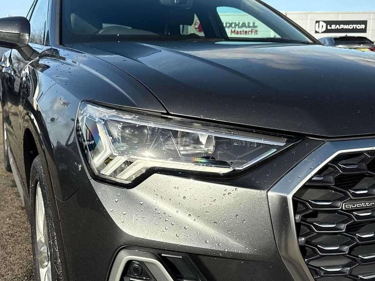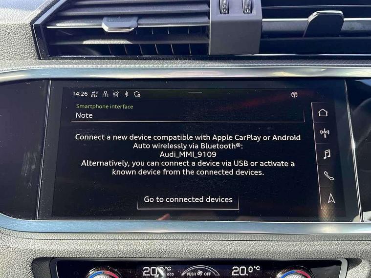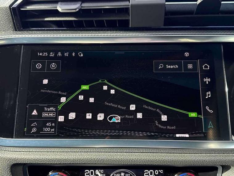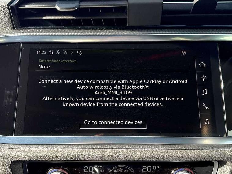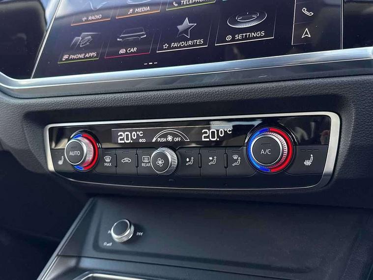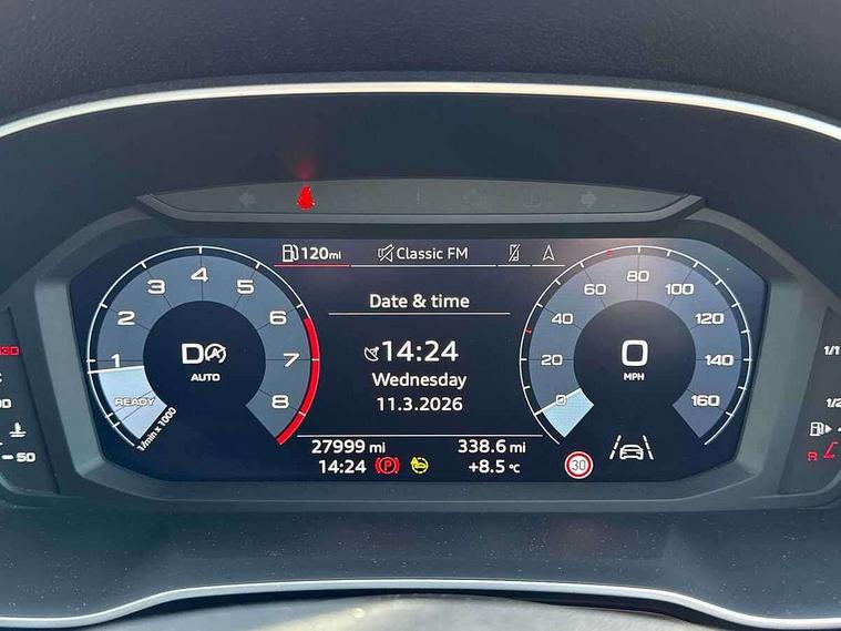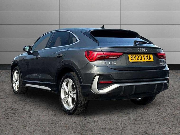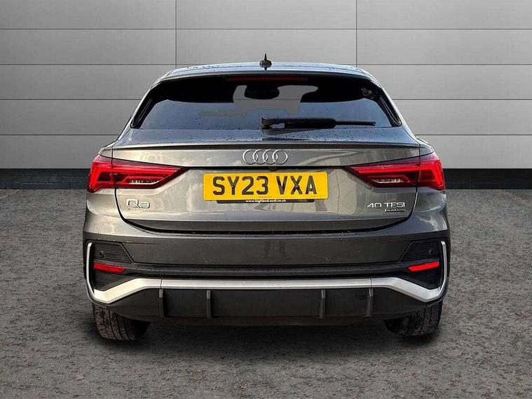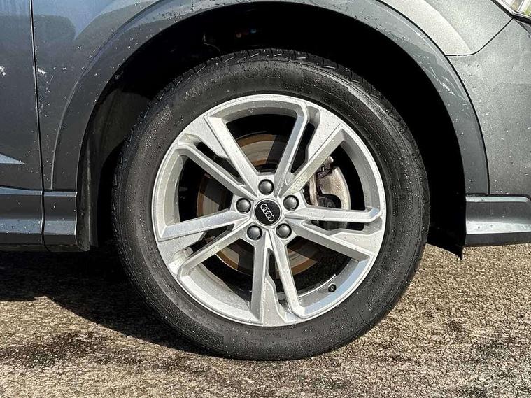 Audi drive select, Audi lane departure warning, Audi Virtual Cockpit - 10.25" display, Bluetooth interface, Camera based traffic sign recognition, Legal emergency call, MMI Navigation Plus with high resolution 10.1 inch touchscreen colour display, Power operated tailgate, Progressive steering, Service interval indicator, Smartphone interface includes wireless Apple carplay/Android Auto, Start stop system with recuperation, Voice control system with natural language interaction, Sports suspension, 2 USB-C ports with charge and data functions, 6 passive loudspeakers, DAB digital radio module, Acoustic windscreen, Aluminium window trim, Auto dimming frameless rear view mirror, Diffuser grille in grained matt black, Diffuser trim in selenite silver, Electrically folding, adjustable and heated door mirrors with integrated LED side indicators and kerb view function for passenger side, Front and rear electric windows, Front fog lights, Front side air inlets in selenite silver, Front underbody protection in manhattan grey paint finish, Grille surround in aluminium silver matt, High gloss black finish B and C pillars, LED Dynamic rear indicators, LED headlights with LED daytime running lights, LED rear lights, LED third brake light, Privacy glass dark tinted rear and rear-side windows (from B-pillar backwards), Radiator grille in anthracite black with inlay in matt aluminium silver, Rain and light sensors, Rear side wing doors, Rear underbody protection in matt black, Rear wiper, S line badges on front wings, S line front and rear bumpers and side skirts in contrasting Manhattan grey paint finish, Side skirt insert in matt Platinium grey, Variable front intermittent wipers, 12V socket in rear centre console, 3 seat bench in 2nd row, 3 spoke leather multifunction steering wheel features S badging and grips in perforated leather with contrast stitching, 40:20:40 folding with manual adjustment for 60:40 forwards/backwards position and backrest angle, Adjustable rear seat bench/backrest with centre armrest and cupholder, Black cloth headlining, Dual zone electronic climate control, Front and rear black floor mats with contrast stitching, Front and rear headrests, Front and rear roof module including reading lights, Front centre armrest, Glove compartment lighting, Height and reach adjustable steering wheel, Illuminated door sill trims with S logo, ISOFIX child seat mounting for front passenger with airbag deactivation and outer rear seat including top tether attachment point for outer rear seats, Luggage compartment light right in white, Luggage compartment sill protection in stainless steel, Manual front seats with height adjustment, Perforated leather gearknob, Single front passenger seat, Stainless steel pedals, Ambient lighting pack - Q3, Non smoking pack - Q3, 3x3 point rear seatbelts, 6 airbags - Driver, front passenger, curtain and side windows, Audi pre-sense front with pedestrain and cyclist recognition, Electrically operated child locks on rear doors, Electromechanical parking brake, Electronic stabilisation control including ABS, ASR and EDL, Front seatbelt reminder, Hill descent control, Hill hold assist, Pre sense basic, Seatbelt monitoring, Tyre pressure warning, Warning triangle and first aid kit, Anti theft alarm, Anti theft wheel bolts, Immobiliser, Remote central locking, Aluminium look interior elements, Black dashboard, Dark matt brushed aluminium inlay, Detail dashboard around MMI touch colour display in glass look, black with surround in aluminium look, Leatherette door armrest,