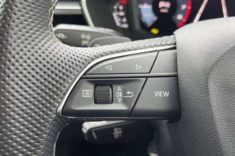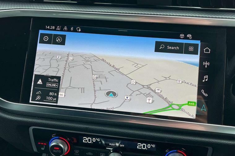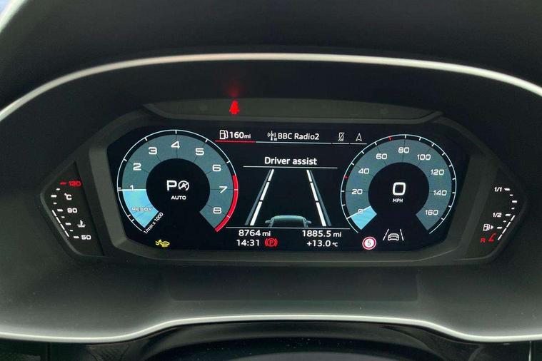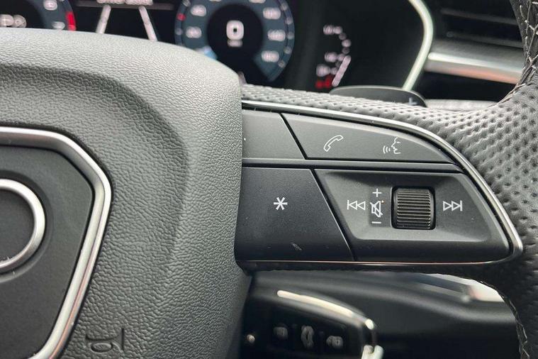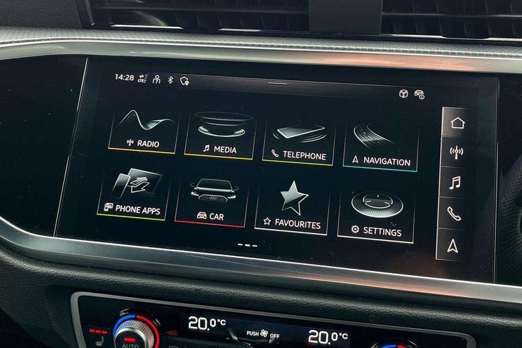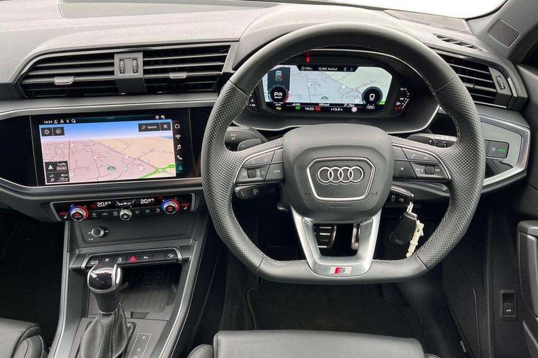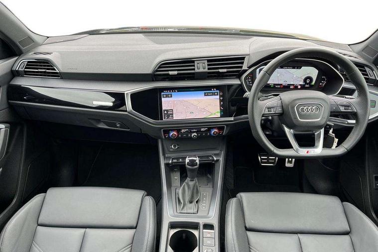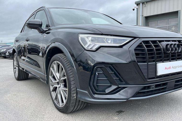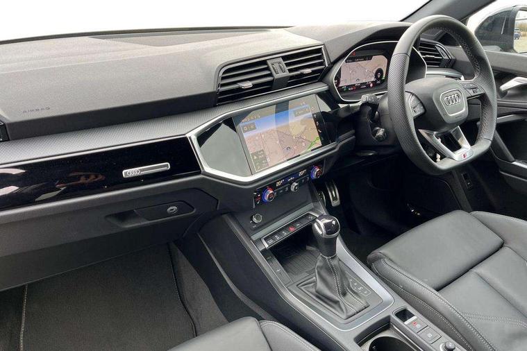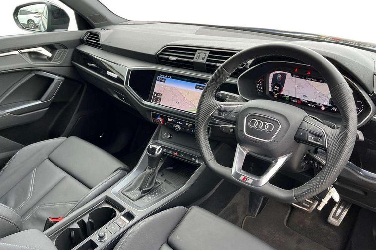Amazon alexa Integration, Audi connect safety and service, Audi drive select, Audi lane departure warning, Audi Virtual Cockpit - 10.25" display, Bluetooth interface, Camera based traffic sign recognition, Distraction and Fatigue warning, Legal emergency call, MMI Navigation Plus with high resolution 10.1 inch touchscreen colour display, Power operated tailgate, Progressive steering, Service interval indicator, Smartphone interface includes wireless Apple carplay/Android Auto, Start stop system with recuperation, Voice control system with natural language interaction, Sports suspension, 2 USB-C ports with charge and data functions, 6 passive loudspeakers, DAB digital radio module, Acoustic windscreen, Anthracite black radiator grille, Audi Beam uses LEDs to project the Audi logo onto the ground as you exit your Q3, Auto dimming door mirrors, Auto dimming frameless rear view mirror, Black roof rails, Electrically folding, adjustable and heated door mirrors with integrated LED side indicators and kerb view function for passenger side, Front and rear electric windows, Front fog lights, Grille vertical bars in aluminium silver/Matt, High gloss black finish B and C pillars, LED Dynamic rear indicators, LED headlights with LED daytime running lights, LED rear lights, LED third brake light, Privacy glass dark tinted rear and rear-side windows (from B-pillar backwards), Rain and light sensors, Rear diffuser grille in grained matt black, Rear diffuser strip in matt anthracite black, Rear side wing doors, Rear wiper, S line bumpers in contrasting Manhattan grey, Variable front intermittent wipers, 12V socket in rear centre console, 3 seat bench in 2nd row, 40:20:40 folding with manual adjustment for 60:40 forwards/backwards position and backrest angle, Adjustable rear seat bench/backrest with centre armrest and cupholder, Black carpet mats, Black cloth headlining, Dual zone electronic climate control, Electric lumbar support, Front and rear black floor mats with contrast stitching in rock grey, Front and rear headrests, Front centre armrest, Height and reach adjustable steering wheel, Illuminated door sill trims with S logo, ISOFIX child seat mounting for front passenger with airbag deactivation and outer rear seat including top tether attachment point for outer rear seats, Luggage compartment sill protection in stainless steel, Manual front seats with height adjustment, Perforated leather gearknob, Single front passenger seat, Stainless steel pedals, Twin leather upholstery with front sport seats + S embossing, Black styling pack - Q3, Non smoking pack - Q3, 3x3 point rear seatbelts, 6 airbags - Driver, front passenger, curtain and side windows, Audi pre-sense front with pedestrain and cyclist recognition, Electrically operated child locks on rear doors, Electromechanical parking brake, Electronic stabilisation control including ABS, ASR and EDL, Front seatbelt reminder, Hill descent control, Hill hold assist, Pre sense basic, Seatbelt monitoring, Tyre pressure warning, Warning triangle and first aid kit, Anti theft wheel bolts, Immobiliser, Remote central locking, Thatcham approved category 1 anti theft alarm, Aluminium look interior elements, Detail dashboard around MMI touch colour display in glass look, black with surround in aluminium look, Leatherette door armrest, Piano black inlay,
