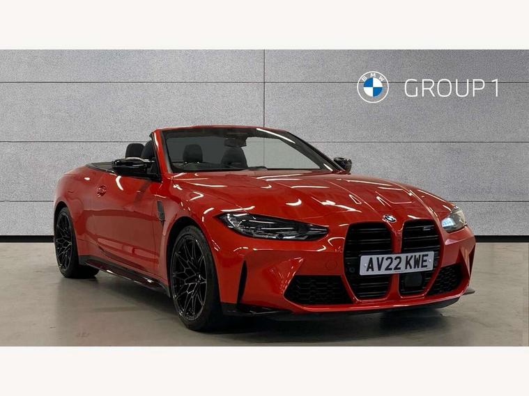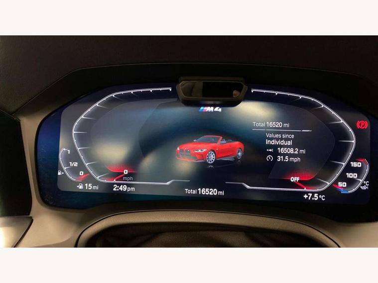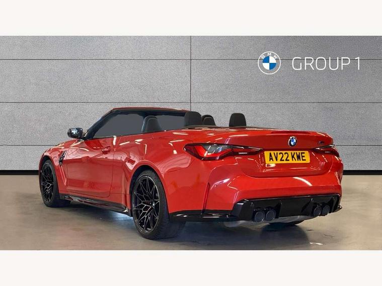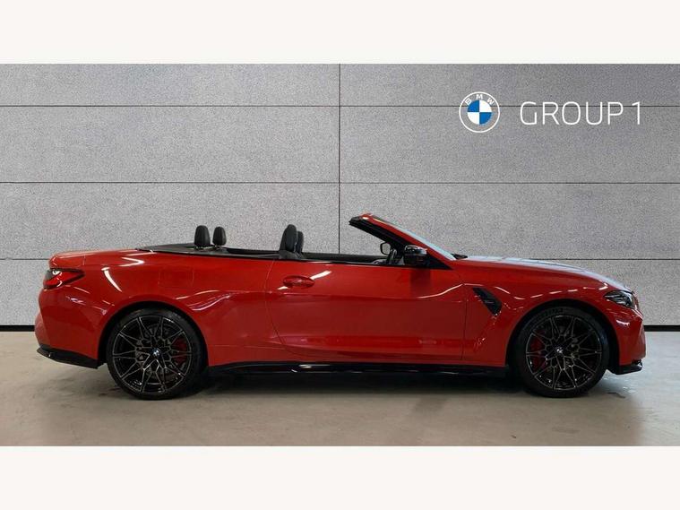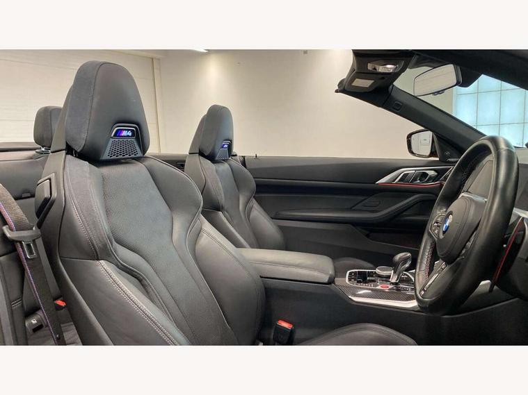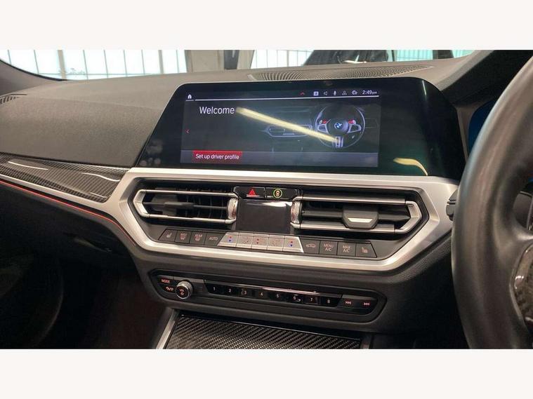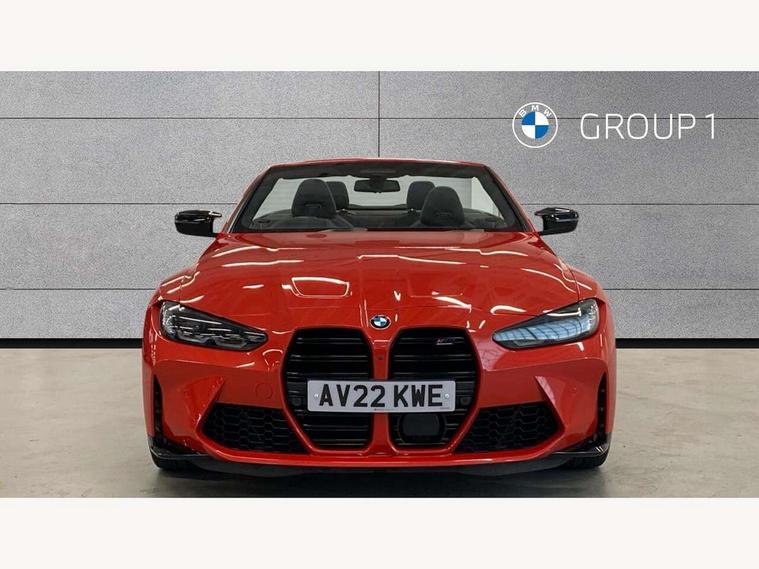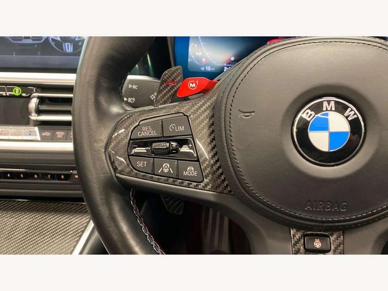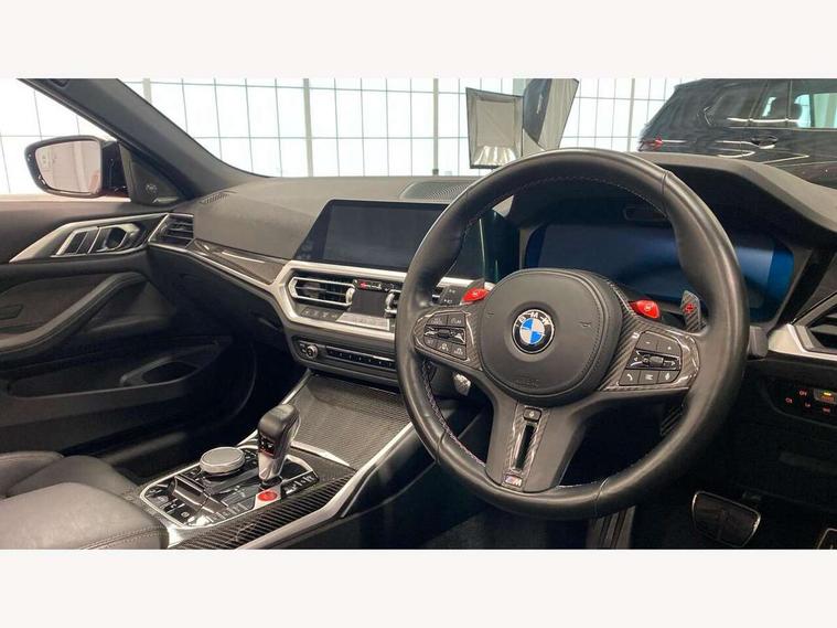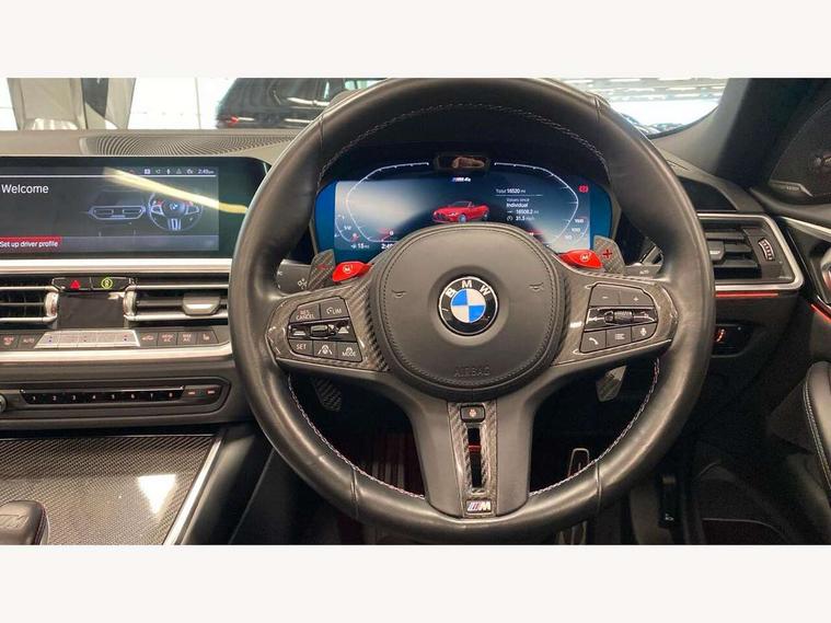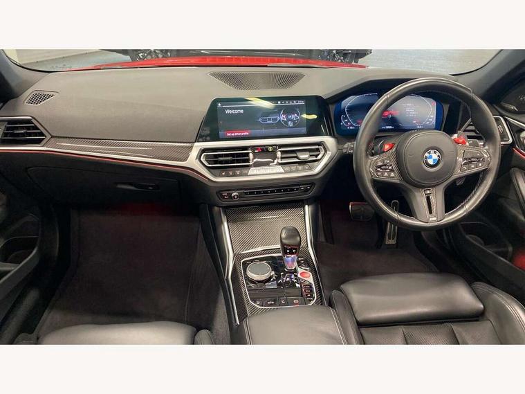 Active guard plus, Automatic start/stop system, BMW iDrive controller on centre console, BMW legal emergency call, BMW Live Cockpit Professional sat nav system with 12.3" instrument display and high resolution control display, BMW Online services, BMW Teleservices, Brake pad wear indicator warning light, Condition based service, Connected drive services, Door/boot open warning light, Driving experience switch, Electric Power Steering (EPS) with Servotronic, Enhanced bluetooth with wireless charging, Head up Display, Instrument cluster with extended contents, Lights on warning, M drive buttons, Oil sensor for level and grade, warning by check control system, Oil temperature gauge, On board computer, On board diagnostics, Optimum shift indicator, Outside temperature display, Pull away assistant, Run flat indicator, Service interval indicator, Speed limiter, Adaptive M Sport suspension, Double joint spring strut front axle, Electronic differential lock control (EDLC), M Drive Professional including track mode, laptimer, traction control & Drift analyser, M Sport differential, M steptronic sport transmission with drivelogic, Safety battery terminal clamp, 8 programmable favourite buttons, Auxiliary point for auxiliary devices, BMW professional radio/CD/MP3, DAB Digital radio, Harman/Kardon loudspeaker system, Acoustic laminated side glass, Auto dimming driver's door mirror, Auto dimming rear view mirror, Automatic headlights + automatic windscreen wipers, Black chrome exhaust tailpipes, Black model designation badges, BMW high gloss shadow line with extended contents, BMW Individual shadowline lights, Body colour bumpers, Body colour door handles, Carbon fibre reinforced plastic (CFRP) roof, Day time running light, Door mirror integrated indicators, Door sill finishers with aluminium inserts, Dynamic brake lights, Electric adjustable heated door mirrors, Electric folding door mirrors, Follow me home headlights, Front and rear bumper system, Front electric windows with open and close fingertip control, anti trap facility and comfort closing, Headlight beam throw control, High beam assistant, High gloss black frameless kidney grille with M badge, LED number plate light, LED tail lights with 3D L-shaped LED light design, M designation, Mirror glass aspheric on driver's side, convex on passenger side, Rain sensor, Rear boot, Rear fog lights, Rear reflectors, Reversing light, Shark fin roof aerial, Third brake light, Visible VIN plate, Welcome lighting, Windscreen wipers with integrated washing jets, 2 cupholders in front centre console, 2 rear head restraints, 2 x 12 V Power sockets (luggage compartment and front centre console), 2 x USB Type C ports for charging and data transmission in front centre console, 2 x USB Type C ports for charging in rear centre console, 40:20:40 split folding rear 2 seat bench with loading system, Ambient lighting, Anthracite headlining, Battery in luggage compartment, Carbon fibre centre console incl. cover for cupholders, Carbon fibre decorative steering wheel finishers, Carbon fibre shift paddles, Carbon fibre strip in instrument panel on front passenger side, Centre console armrest with storage compartment, Compartment in front of cupholder, Driver/passenger sunvisors with illuminated vanity mirrors + covers, Electric front seats + driver memory, English handbook, Floor mats in velour, Footwell lighting, Front and rear door exit lights, Front door storage bins with bottle holder, Front interior light, Front isofix attachment + airbag deactivation, Front seat backrest width adjustment, Front seats lumbar support, Front/rear door armrests, Gearshift lever with embossed M badge, Heated front seats, Height adjustable front headrests, Interior mirror lighting, Isofix on 2nd row seats, Lockable/illuminated glovebox, Luggage compartment lighting, Rake/reach adjustable steering wheel, Single front passenger seat, Storage compartment in rear doors, Storage tray and compartment with cover in centre console, Three zone automatic air conditioning, Toolkit located in luggage compartment, Warm air collar, Additional storage compartment pack - M4, Connected package professional - M4, High gloss shadowline exterior trim pack - M4, 4 x 3 point seatbelts, ABS/EBD, Automatic Stability Control (ASC), Brake energy regeneration, Brake fade compensation, Compound structure brake discs, Cornering brake control (CBC), Crash sensor, Driver/Front Passenger airbags, Dry braking, Dynamic brake control, Dynamic Stability Control with M Dynamic mode, Dynamic Traction Control - DTC, Electromechanical parking brake, Front and rear head airbags, Front seat side impact airbags, Front seatbelt pretensioners + load limiters, Hill start assist, M Sport seat belts, Seatbelt warning, Side impact protection, Two tone horn, Tyre pressure sensor, Warning triangle and first aid kit, Digital key, Electronic immobiliser, Remote central locking, Thatcham cat 1 remote alarm, Vehicle Key with 4 buttons including the integrated key, Galvanic finish to control surrounds, High gloss black interior trim, Tyre repair kit,