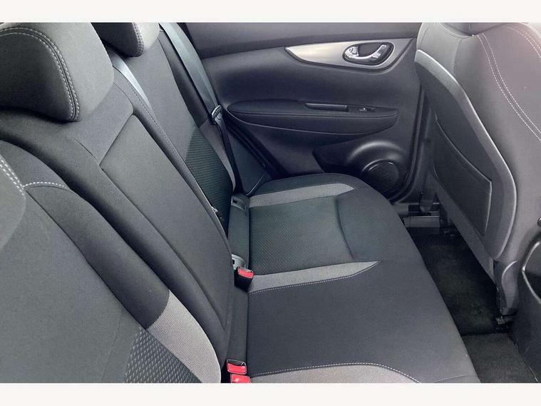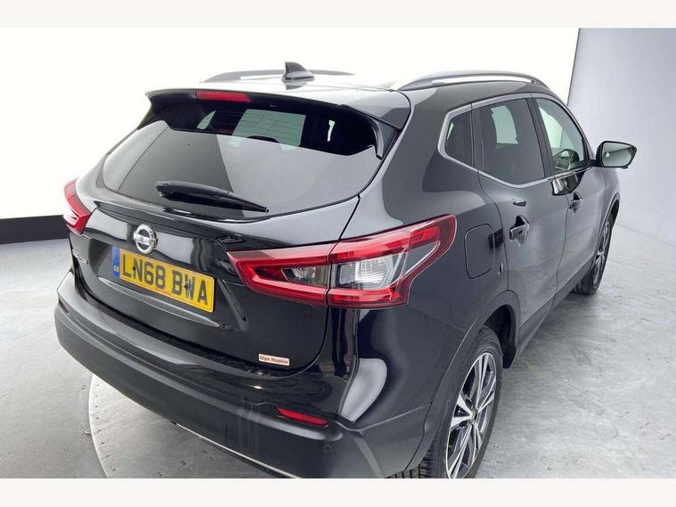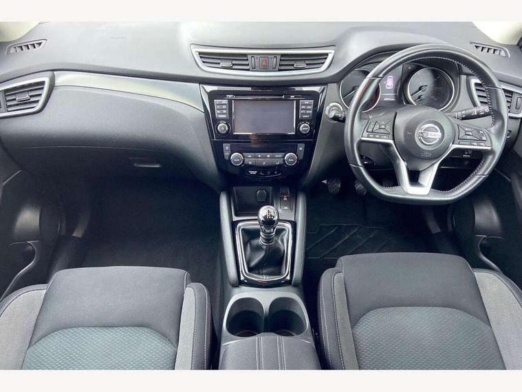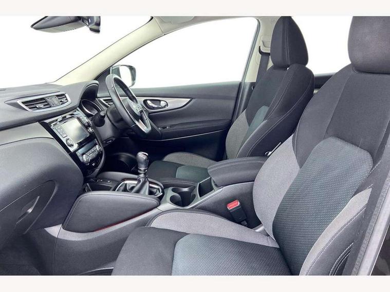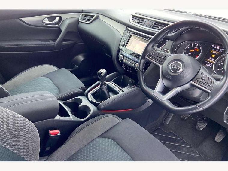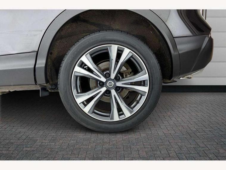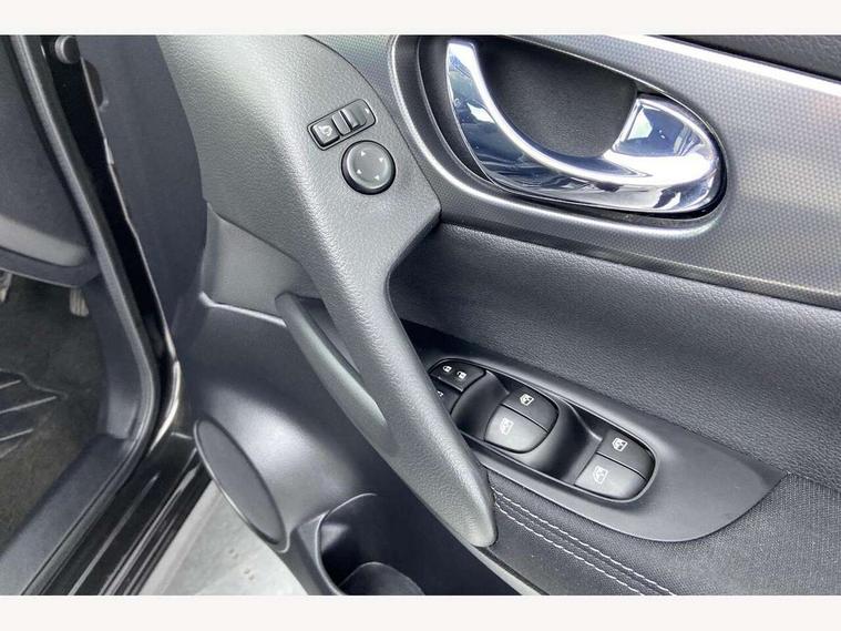 5" TFT driver information centre, Around View Monitor, Bluetooth phone integration system, Cruise control, Electric speed sensitive power steering, Front and rear parking sensors, Lane departure warning system, Nissan connect sat nav system, Outside temperature display, Push button starter, Rear view camera, Service interval indicator, Speed limiter, Traffic sign recognition, Trip computer, 'Shark fin' mobile antenna, 6 speakers, DAB Digital radio, Radio/CD, Smartphone apps, Steering wheel mounted audio controls, USB/aux input socket, Automatic headlamp activation, Body colour bumpers, Body colour door handles, Body colour door mirrors, Chrome window surround, Electric folding and heated door mirrors, Front fog lights, High beam assist, Interior mirror with auto anti dazzle, LED indicators in door mirrors, Matt silver roof rails, One touch electric front/rear windows, Privacy glass, Rain sensor windscreen wipers, Rear roof spoiler, Rear wiper, 2 X front 12v power sockets, 60/40 split folding rear seat, Ambient interior lighting, Centre console with armrest, Chrome interior door handles, Cloth upholstery, Configurable luggage board system, Driver + front passenger lumbar support, Dual zone climate control, Front and rear door pockets with bottle holders, Front headrests, Front seat belt pre-tensioners with load limiters, Height adjustable driver's seat, Height adjustable passenger seat, Illuminated electric window switch, Isofix child seat preparation, Leather gearknob, Leather interior door handles, Leather knee rest, Leather steering wheel, Luggage compartment lighting, Parcel shelf, Pollen filter, Rake/reach adjustable steering wheel, Rear armrest with 2 cupholders, Rear headrests, ABS, brake assist and EBD, Child locks on rear doors, Curtain airbags, Driver/front passenger airbag, Electronic parking brake, ESP + traction control, Forward emergency braking, Front passenger airbag deactivation, Height adjustable front seatbelts, Hill start assist, Seatbelt warning, Side airbags, Three 3 point rear seatbelts, Tyre pressure monitoring system, Alarm, Immobiliser, Intelligent Key, Remote central locking, Piano black interior trim, 18" Bi-colour alloy wheels, Tyre puncture repair kit,