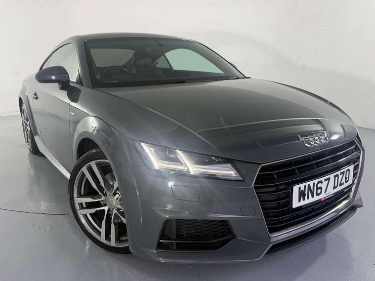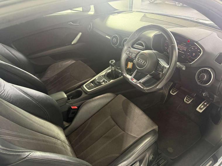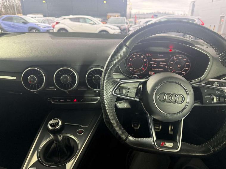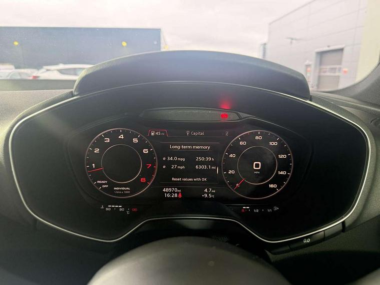 Audi drive select, Audi virtual cockpit - 12.3" high-resolution LCD display with fully customisable instrument cluster, Cruise control + speed limiter, MMI touch panel, Mobile phone preparation with bluetooth interface, Progressive power assisted steering, Service interval indicator, Audi music interface, Auxiliary input socket, Bluetooth audio streaming, DAB Digital radio, MMI Radio with CD player and SD/XC card slot, Auto headlight range control, Body colour bumpers, Body colour door mirrors, Electric front windows, Front fog lights, Green tinted heat insulating glass, High gloss black front grille, LED daytime running lights, LED rear lights, Rear diffuser, Retractable rear spoiler, S Line body styling, Sunband for windscreen, 3 spoke leather multifunction sports steering wheel, Aluminium door sill trims, Black headlining, Electric lumbar support, Extended aluminium look with stainless steel pedals, Front centre armrest, Front head restraints, Front passenger seat isofix location point, Height/reach adjust steering wheel, ISOFIX on outer rear seats, Perforated leather gearknob, Split folding rear seat, Top tether anchor plate for isofix child seat, Auto dimming rear view mirror with light and rain sensors pack - TT, Non smoking pack - TT/TT RS, 3 point front seat belts, ABS, ASR traction control, Curtain airbags, Driver/Front Passenger airbags, EDL traction control, Electromechanical parking brake, ESP, First aid kit, Front passenger airbag deactivation, Front side airbags, Head airbags, Seatbelt warning, Tyre pressure warning, Warning triangle, Anti theft alarm, Immobiliser, Keyless Start, Locking wheel bolts, Remote central locking, Matt brushed aluminium inlays, Tyre repair kit,