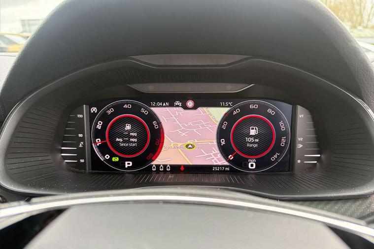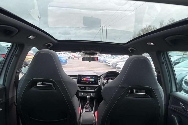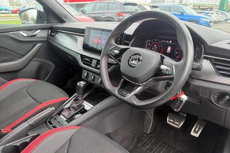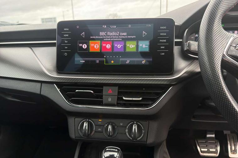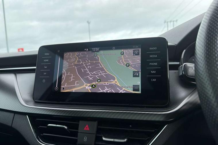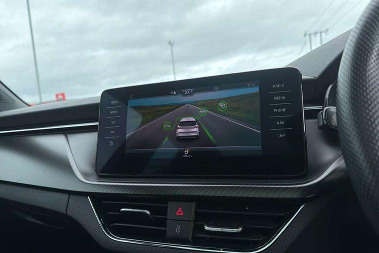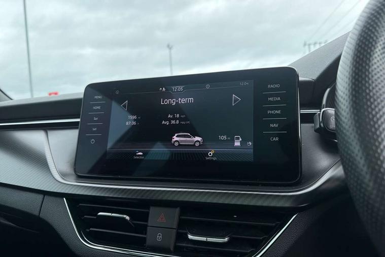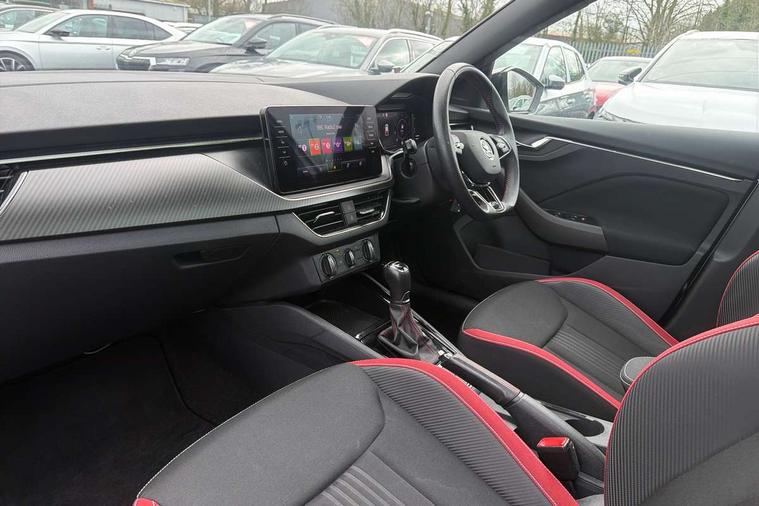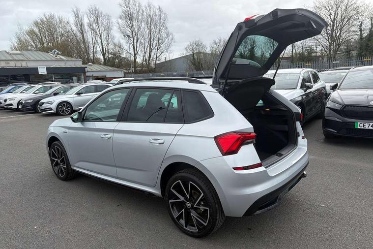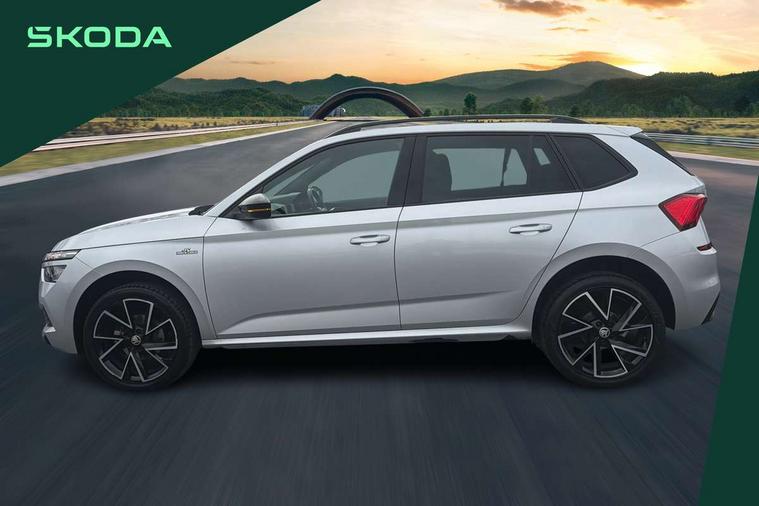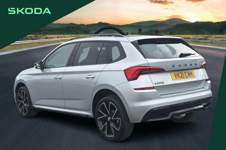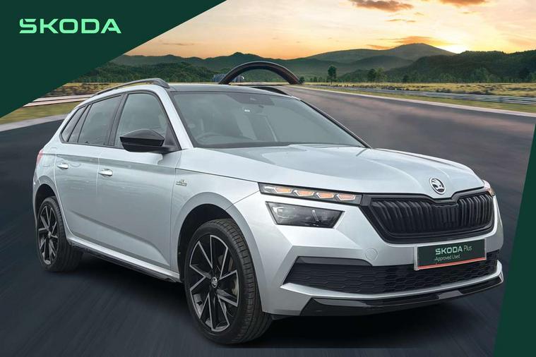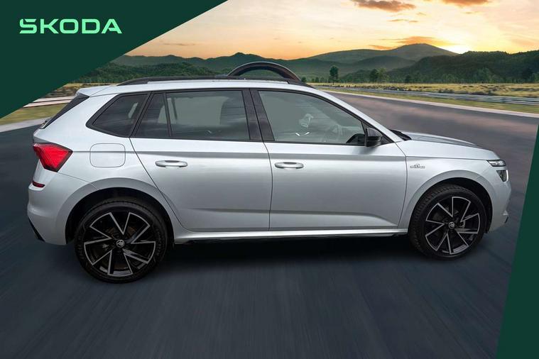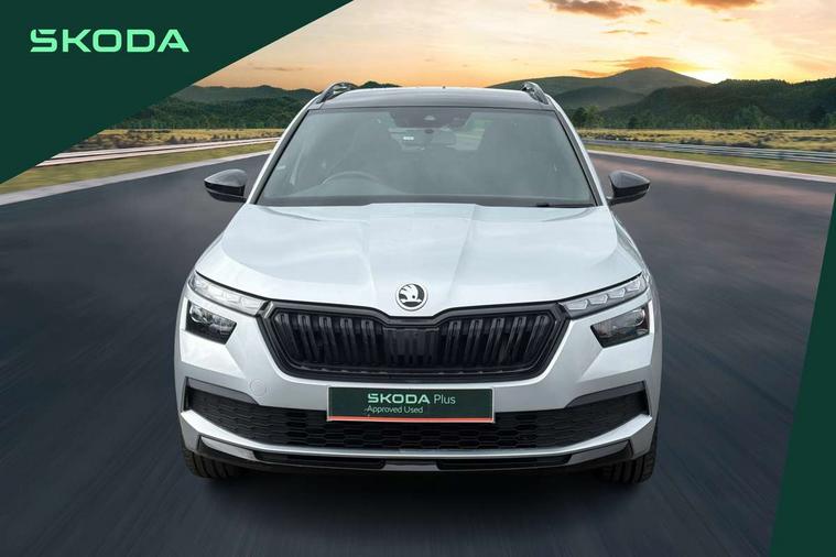 Amundsen satellite navigation with 9.2" touchscreen display, voice control, virtual cockpit and web radio, Bluetooth system, E-call, Front assist system, Lane assist, PAS, Service indicator, Speed limiter, Trip computer, Virtual cockpit with 10.25" display, Wireless SmartLink for apple car play, android auto and mirrorlink, 2 USB - C ports with 1x adaptor cable, Auxiliary input socket, DAB Digital radio, Auto dimming rear view mirror, Black door mirrors, Black radiator grille, Black rear diffuser, Body colour bumpers, Body colour roof spoiler, Boot lettering in black, Chrome grille surround, Electrically adjustable and heated door mirrors, Fixed panoramic sunroof with black roof rails, Front and rear electric windows, Front sport bumper, Full LED headlights with adaptive front light system, dynamic indicators, cornering function and fog lights, Headlight range control, Heated rear window, High functionality rear led lights with dynamic indicators, KAMIQ Door sills, Monte carlo plaque, Privacy glass, Rear fog lights, Rear wiper, 12V Accessory socket in centre console, Aluminium pedals, Black ceiling for black/beige interior, Chrome inner door handles, Cloth upholstery, Front gesture control, Front head restraints, Glove compartment with illumination, Height adjustable passenger seat, Ice scraper, Isofix child seat fittings on outer rear seats, ISOFIX on front passenger seat, Leather gear lever, Manual lumbar support for front seats, Rake/reach adjustable steering wheel, Reading lights for driver and front passenger, Sports seats, Sun visor with make up mirror for front passenger, Textile floor mats, Third rear headrest, Top tether for front passenger seat, Umbrella in driver's door, 3x3 point rear seatbelts, Airbags - driver and front passenger, ESP, Front passenger airbag deactivation switch, Front side airbags with curtain airbags, Hill hold control, Manual parking brake, One tone horn, Rear disc brakes, Seatbelt reminder for driver an co-driver, Traction control, Tyre pressure monitor, Alarm with interior monitoring, back up horn and tilt sensor with safe function and towing protection, Anti-theft wheel bolts, Immobiliser, Remote central locking with SAFE system, Chrome air vent surrounds, 18" Vega alloy wheels in black,