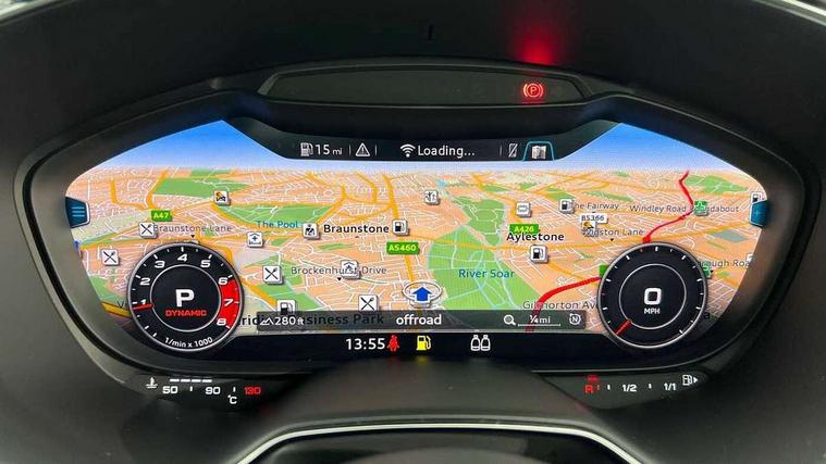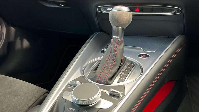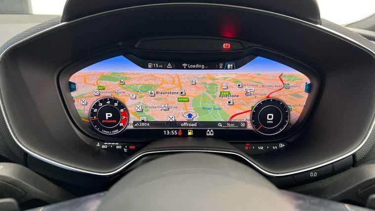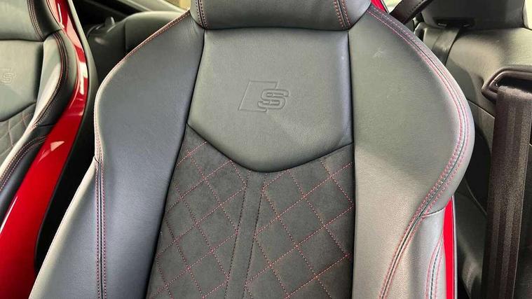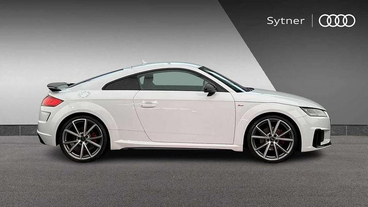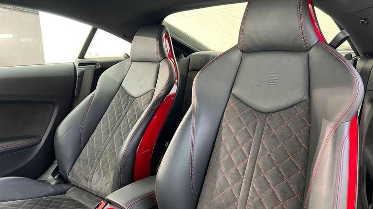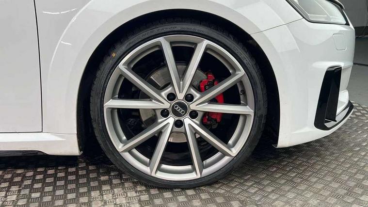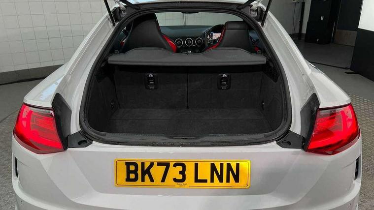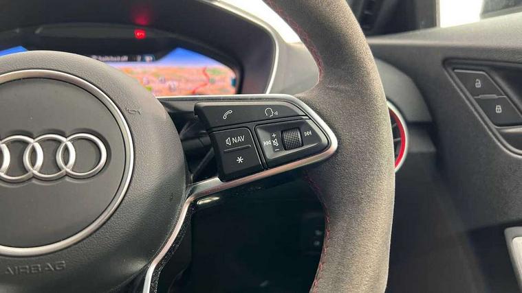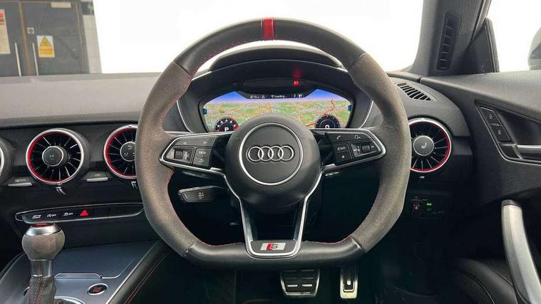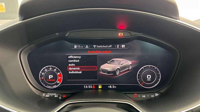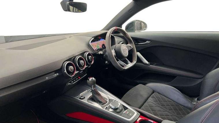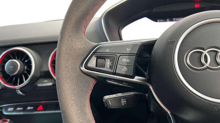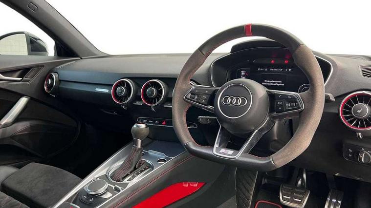 Audi drive select with 4 Pre configured modes, Audi smartphone interface, Audi virtual cockpit - 12.3" high-resolution LCD display with fully customisable instrument cluster, Cruise control + speed limiter, Emergency call service, Mobile phone preparation with bluetooth interface, Progressive power assisted steering, Rear parking sensors, Service interval indicator, Start/Stop system with energy recuperation, TP memo, Sports suspension, 8 Speakers, AM/FM radio, Bluetooth audio streaming, DAB Digital radio, Audi Beam uses LEDs to project the Audi Sport logo, Audi rings decals, Auto dimming rear view mirror, Auto headlight range control, Black chrome tailpipe, Black door mirrors, Dark privacy glass from B-pillar backwards, Electric folding door mirrors, Electric front windows, Electrically adjustable and heated door mirrors with integrated LED side indicators, Heat insulating glass in windshield, Heat reflecting windows, LED 3rd brake light, LED daytime running lights, LED headlights with LED rear lights + dynamic rear indicators, Light and rain sensors, Rear boot, 12V socket, 2 rear seats, 3 spoke flat bottomed high multi-function leather sport steering wheel with gearshift paddles, 4 way electric lumbar support for driver and front passenger, Alcantara leather with 12o'clock marker and express red contrast stitching in steering wheel, Alcantara/leather upholstery with S embossing + contrasting express red stitching on upholstery, Steering wheel and gear knob gaiter, Black headlining, Door sill trims, Extended aluminium look with stainless steel pedals, Front centre armrest, Front passenger seat, Front super sports seats, Heated front seats, Integrated head restraints, ISOFIX child seat mounting for front passenger seat with airbag deactivation, Manual adjustment of seat height, fore/aft position, seat angle, seat depth and backrest angle, Rear head restraints, Rear top tether child seat ISOFIX attachment, Red piped floor mats, Split folding rear seat, Black styling package - TT, Leather pack - TT, LED interior light pack - TT/TTS, Non smoking pack - TT/TT RS, Technology pack without Audi phone box - TT, 3 point front seat belts, ABS, ASR traction control, Curtain airbags, Driver and front passenger airbag with front passenger airbag deactivation, EDL traction control, Electromechanical parking brake, ESP, First aid kit, Front side airbags, Head airbags, Hill hold assist, Red brake callipers, Seatbelt warning, Tyre pressure loss indicator, Warning triangle, Anti theft alarm, Anti theft wheel bolts, Immobiliser, Keyless Go, Remote central locking, Matt brushed aluminium inlays, Tool kit, Tyre repair kit,