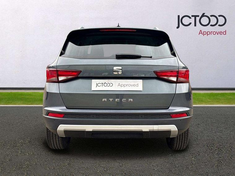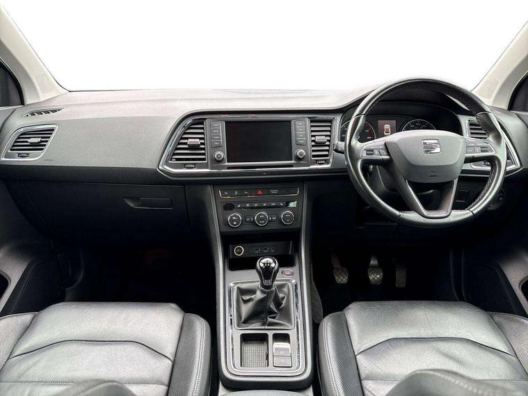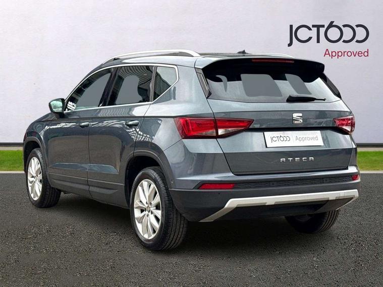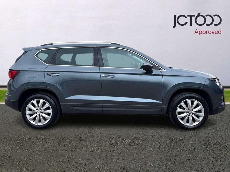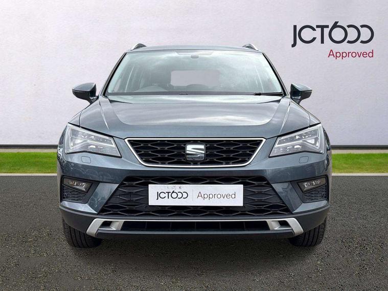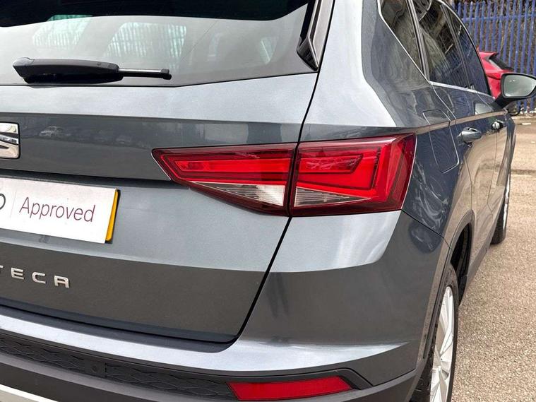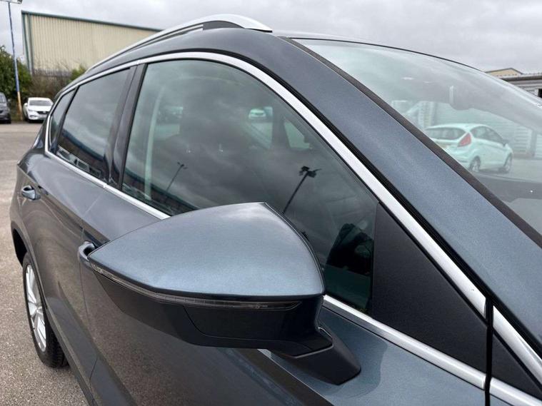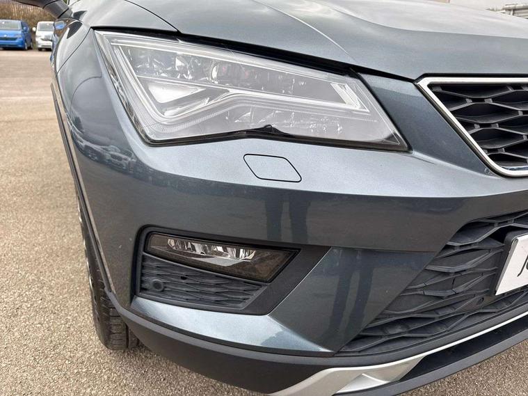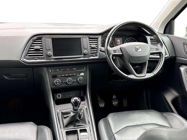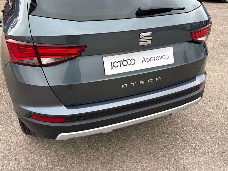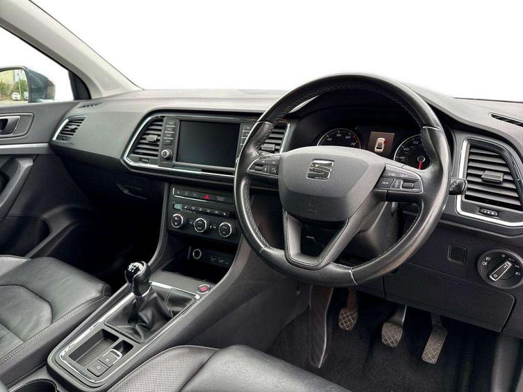 'Lights On' Reminder warning buzzer, 3.5" driver's display, 8.0" colour touchscreen with proximity sensor, Cruise control, Digital clock, Driver alert system, Electric speed sensitive power steering, Full Link Smartphone Integration with Mirror Link, Apple Car Play, Google Android Auto, Low fuel warning light, Multi function display, Outside temperature gauge, Park assist system with steering assist, Remote fuel flap release, RPM counter, Satellite navigation system, SEAT logo boot release, Self parking functionality (includes front and rear parking sensors), Trip computer, Wireless Smartphone charger, Comfort suspension, XDS electronic differential lock, Steering wheel mounted audio/phone controls, Auto dimming rear view mirror, Automatic headlights, Black wheel arch extensions, Body colour bumpers, Body colour door handles, Body colour door mirrors, Chrome headlight surround, Chrome roof rails, Chrome side window trim, Chromed centre radiator grille surround, Dark tinted rear windows, Electric folding door mirrors, Electrically adjustable and heated door mirrors, Front and rear electric windows, Hidden exhaust pipe, LED daytime running lights, LED front fog lights with static cornering light function, LED Headlights, LED tail lights, Matt black radiator grille, Rear fog lights, Rear spoiler, Rear wash/wipe, Welcome lighting, 12V power point front, 3 height adjustable rear headrests, 4 Lashing eyes in boot, 60/40 split folding rear seat, Active head restraints, Adjustable front armrest with storage compartment, Ambient lighting, Black leather upholstery, Driver sunvisor with covered mirror + card holder, Driver/passenger lumbar adjustment, Driver/passenger sunvisors with illuminated vanity mirrors, Dual zone climate control, Footwell illumination, Front courtesy lights, Front cupholders, Front reading lights, Front seat back storage pockets, Gear shift indicator, Height adjustable driver's seat, Height adjustable front headrests, Height adjustable passenger seat, Illuminated boot, Illuminated glovebox, Instrument lighting with brightness control, Isofix child seat preparation, Leather steering wheel and gear knob, Rear armrest, Rear central air outlet, Rear reading lights, Sports seats, Storage box under drivers seat, Convenience pack - Ateca, Navigation system pack - Ateca, Winter Pack - Ateca, 3x3 point rear seatbelts, ABS, Auto hold function, Automatic post collision braking, Driver/Front Passenger airbags, Drivers knee airbag, Electronic parking brake, Electronic stability control, ESP+EBA, Front and rear seatbelt reminder, Front assist including city emergency braking, Front passenger airbag deactivation, Front side airbags, Hill hold control, Predictive pedestrian protection, Tiredness recognition system, Traction control, Twin curtain airbags, Tyre pressure monitoring system, 2 folding remote keys with window open/close function, Immobiliser, Keyless entry and start, Locking wheel bolts, Remote central locking, Volumetric alarm with back up horn, Chrome effect dashboard facia, 17" Dynamic alloy wheels,
