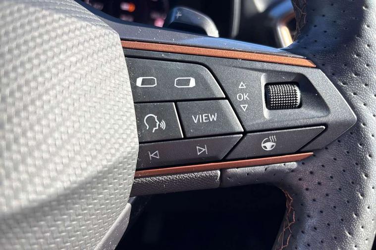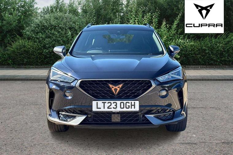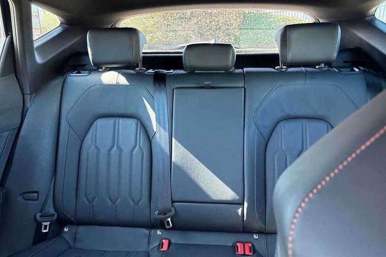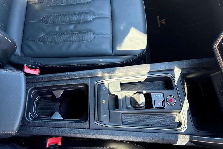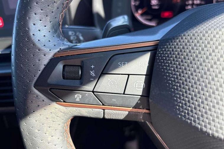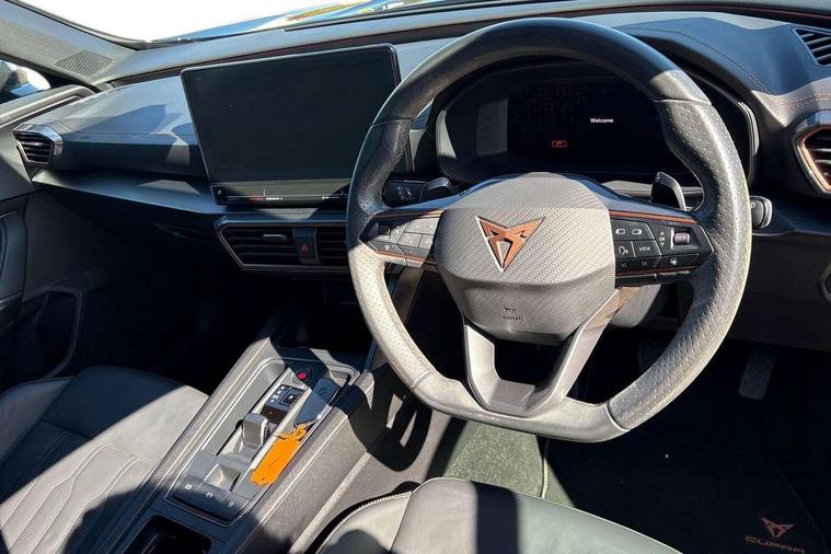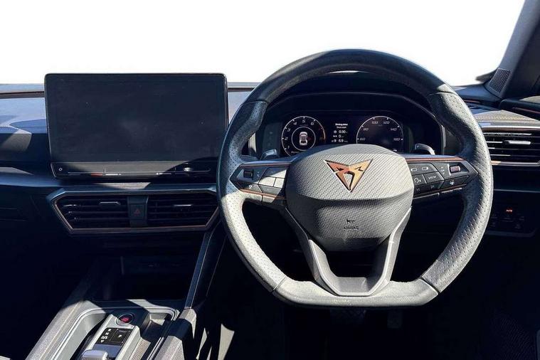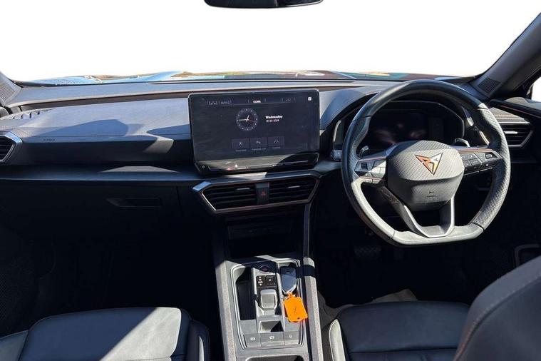 Digital cockpit and configurable dashboard, Driver alert system, Driving profile selection, Forward collision warning with automatic braking, Lane assist, Navigation system with 12'' Touchscreen Display, Park assist (inc front/rear parking sensors), PAS, Predictive adaptive cruise control with speed limiter, Rear view camera, RPM, trip computer, outside temp gauge, instrument light brightness, low fuel warning light, lights on reminder, gearshift indicator, Service interval indicator, Start/stop system with regenerative braking, Voice control system, Wireless apple carplay, Wireless phone charger, Electronic locking differential and dynamic traction support, Standard suspension, 2 front and 2 rear USB type C sockets, Auxiliary input socket, DAB radio, Auto dimming rear view mirror, Body colour door handles, Body coloured bumpers, Dark grey wing mirror, Daytime running light with automatic headlight control and coming home feature, Dynamic headlight range control, Electric front/rear windows, Electrically adjustable heated and folding door mirrors with memory function, Front fog lamps with cornering function, Gloss black roof rails and window surrounds, LED Headlights, LED Taillights with dynamic indicator, Rain sensing wipers, Rear diffuser with black simulated exhaust pipes, Rear side wing doors, Rear wash/wipe, Third brake light, Tinted rear windows, Welcome lights, 12v power supply in centre console, 12V socket, 12v socket in loadspace, 2 front and 2 rear reading lights, 230V socket, 3 seat bench in 2nd row, 60/40 split rear bench seat with armrest and mechanical seat release, Black headlining, Dust/pollen filter, Front and rear head restraints, Front centre armrest, Height/reach adjust steering wheel, Illuminated interior front door sills, Illuminated sunvisor with mirror, Isofix, Leather multi function heated steering wheel with gear shift paddles, Luggage tie-down hooks, Single front passenger seat, Three zone climate control with control panel in rear, Variable luggage/load compartment floor, Wraparound lighting, Genuine Nappa leather Pack - Cupra, 3 point seatbelts on all rear seats, ABS, Brake control system - ESC and brake booster, Child proof door locks, Driver and front passenger airbags with front passenger airbag de-activation, Electronic parking brake, Front and rear disc brakes, Front side curtain airbags, Hill hold control, Public e-call, Seat belt reminder for front and rear seats, Tyre pressure monitoring system, Anti theft alarm system, Keyless entry and start system (KESSY), Locking wheel bolts, Copper and aluminium interior detailing, 19" 'Exclusive' machined sport matte black and silver alloy wheels,