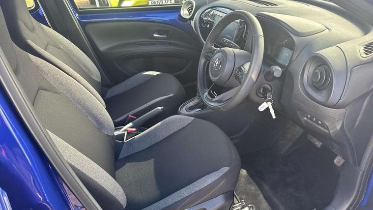 4.2" TFT colour screen, Adjustable speed limiter, Analogue speedometer, Bluetooth connectivity, Digital tachograph, Driver attention alert system, eCall emergency call system, ECO-driving indicator, Electric power steering, Intersection turn assist, Key reminder warning, Noise reduction kit, Pre collision system with emergency steering assist, Reversing camera with static guide lines, Smart phone integration with Apple car play/Android Auto, Speed limit display, Start and stop, Vehicle Stability Control (VSC), 4 speakers, 9" HD multimedia display touch screen with Toyota smart connect, DAB digital audio broadcast, USB connector, Auto headlights, Automatic headlights cut-off, Bicycle towing hook, Black lower front grille, Black rear bumper, Black side protection mouldings, Black upper front grille, Black wheel arch mouldings, Body colour door handles, Body coloured front bumper, Boot door scuff plate, Electric heated door mirrors, Follow me home headlights, Front power windows, Gloss black door mirrors, Headlight cut-off reminder, LED daytime running lights, LED front light guide, LED High mounted stop lamp, Manual day/night rear view mirror, Manual headlight levelling, Pagoda roof, Power adjustable door mirrors, Power back door, Projector halogen headlights, Rain sensor, Rear combination lights LED bulb type, Rear side wing doors, Rear windscreen defogger, Rear windscreen wiper, Short antenna, Variable intermittent windscreen wipers, 12v power outlet - front, 2 seat bench in 2nd row, 3 spoke leather steering wheel, 50/50 split folding rear seat, Adhesive roof headlining, Adjustable speed limiter switch on steering wheel, Audio and telephone switches on steering wheel, Black insert on steering wheel, Boot light, Centre room light, Chrome interior door handles, Chrome surround on air conditioning buttons, Clean air filter, Fabric upholstery, Floor mats, Front and rear cup holders, Front head rest deco art, Front head restraints, Gear shift indicator, Height adjustable driver seat, Intelligent adaptive cruise control switch on steering wheel, ISOFIX child restraint system on rear seats, Lane departure alert switch on steering wheel, Leather gearshift knob, Light grey roof lining, Manual air conditioning, Manual tilt steering wheel, Manually reclining and sliding driver seat, Manually reclining and sliding front passenger seat, Multimedia switches on steering wheel, Pollen filter, Rear door pockets, Rear head restraints, Resin console box storage, Satin silver insert on gear shift knob, Silver stitching on gear shift knob, Single compartment glovebox with lights, Single front passenger seat, Soft tonneau cover, Sun visors with mirror on driver and passenger side, Voice recognition switch on steering wheel, Toyota safety sense pack - Aygo X, Anti lock braking system + Electronic brake force distribution, Child safety door lock, Emergency brake light signal (EBS), Hill start assist control (HAC), Passenger airbag on/off switch, Seat belt reminder for front and rear seats, Supplement restraints system (SRS) - 6 airbags, Traction control, Tyre pressure warning system, Immobiliser, Remote power door locks, Black air vent surround, Black wheel centre caps, Tyre repair kit,
