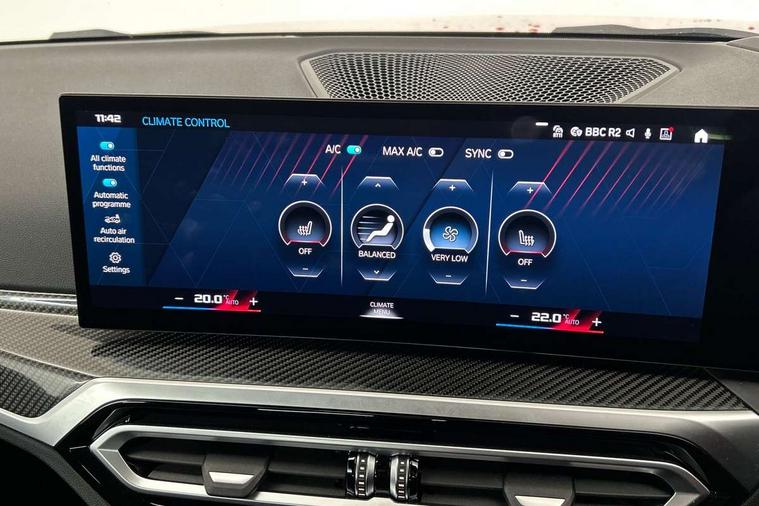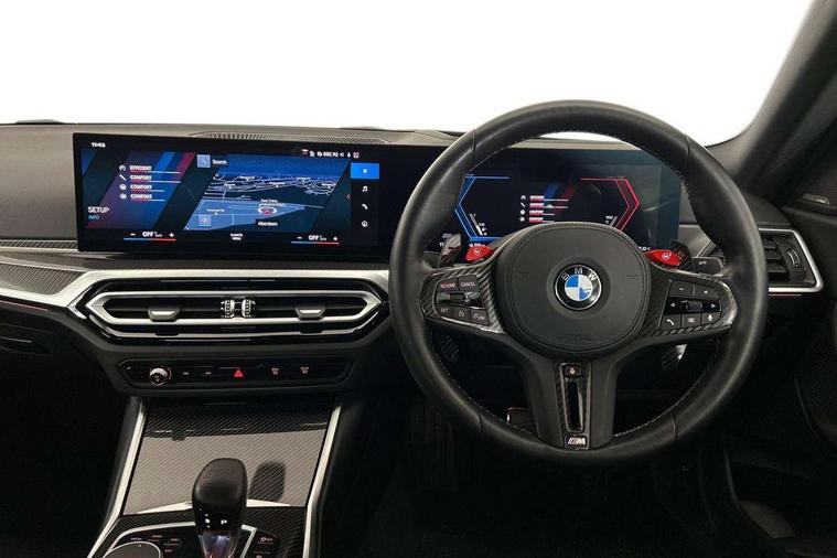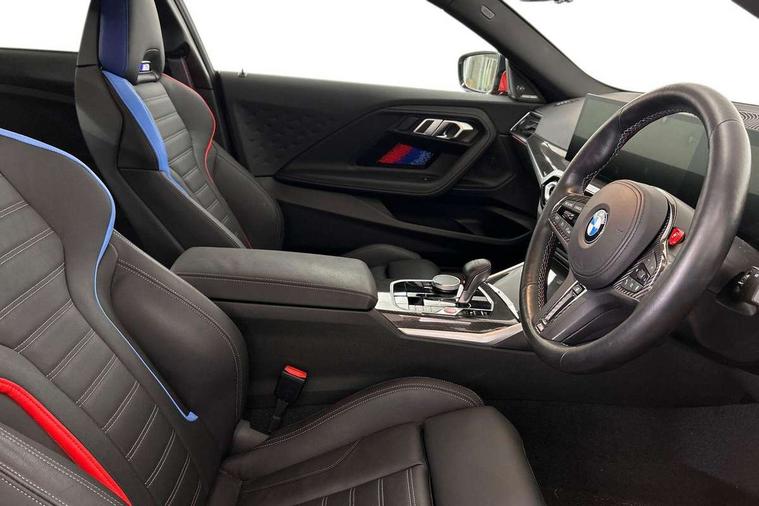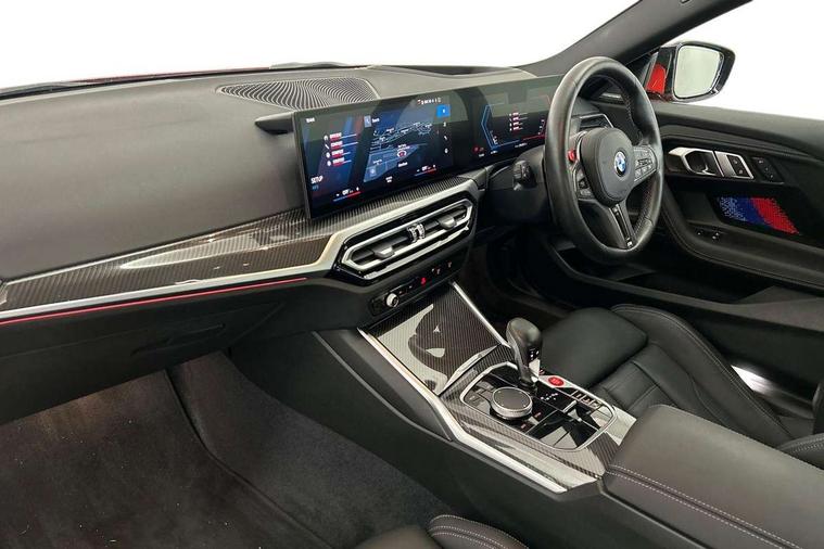 BMW ConnectedDrive online services, BMW legal emergency call, BMW Teleservices, Check control system, Configurable dashboard display, Digital owner's manual, Drive off assistant, Driver attention warning, Engine start button, Exterior temperature display, Live Cockpit Pro with head up display including 12.3" instrument cluster and 14.9" central display, M drive: DSC mode, engine characteristics, M Servotronic, M Drivelogic, adaptive M suspension, brake characteristics, M Sound Control, Oil sensor for level and grade, On board diagnostics, Parking assistant with reversing assistant, active PDC, lateral parking aid and rear view camera, PAS, Service interval indicator, Shifting point display, Speed limiter, Start/stop system, Travel data recorder, Trip computer, Voice control for audio, climate, telephone, navigation, Widescreen display, M Adaptive suspension, M Drive Professional including track mode, laptimer, traction control & Drift analyser, M Sport differential, M steptronic sport transmission with drivelogic, DAB tuner, Harman/Kardon surround sound system, USB port, Adaptive LED Headlights, Automatic headlamp activation, Automatic headlamp levelling, BMW Individual shadowline lights, Door mirror integrated indicators, Dynamic brake lights, Electric adjustable heated door mirrors, Extended High-gloss shadowline exterior trim: high-gloss black mirror caps and rear spoiler, tailpipe finishers in black chrome, Fading support, Follow me home headlights, Front and rear bumper system, Front electric windows, Headlight beam throw control, Heat protection, sun protection glazing, High beam assistant, Illuminated M highlighters, Interior rear view electrochromatic mirror with automatic anti dazzle function, LED 3rd brake light, LED daytime running lights, LED indicator lights, LED number plate light, LED rear lights, M carbon fibre roof, M high gloss shadowline exterior trim in mirror triangle cover, mirror cover panel, mirror bezel and window border, Mirror glass aspheric on driver's side, convex on passenger side, Rain sensor, Rear boot, Sun protection glass: darkened glass for rear screen and rear side windows, Variable front intermittent wipers, Welcome lighting, 12V power socket in front centre console with blanking plug, 2 cupholders, 2 rear head restraints, 2 rear seats, 3 spoke leather M multi-function steering wheel, Ambient lighting, Black velour front and rear floor mats, Carbon fibre interior trim including carbon applications on the steering wheel and carbon shift paddles, Compartment in front of cupholder, Driver/passenger electric lumbar adjustment, Electrically adjustable front seats - driver seat with memory, Folding rear seat head rests, Front and rear door exit lights, Front and rear footwell lights, Front centre armrest, Front door pockets with bottle holders, Front door sill strips with aluminium inlays and M2 labelling, Front interior light, Front M Sport seats, Front reading lights, Glove compartment, Glovebox light, Heated front seats, Height adjustable front headrests, Illuminated armrest storage compartment, Illuminated M accents in front door, Isofix child seat for two outer rear seats, Luggage compartment lighting, M Anthracite headlining, Manually adjustable steering column, Rear armrest, Single front passenger seat, Steering column rake adjustment, Storage compartment in rear doors, Storage tray and compartment with cover in centre console, Through loading system with 40/20/40 split folding rear seat, Two zone automatic air conditioning, Vanity mirror lights, Connected package professional - M2, Extended storage pack - M2, Interior and exterior mirror pack - M2, 4 x 3 point seatbelts, ABS/EBD, Automatic Stability Control (ASC), Cornering brake control (CBC), Crash sensor, Curtain airbags, Driver/Front Passenger airbags, Dry braking, DSC - Dynamic Stability Control, Dynamic brake control, Electromechanical parking brake, Emergency door unlock, Front passenger airbag deactivation, Height adjustable front seatbelts, M seat belts, Seatbelt load limiter, Seatbelt pretensioners with load limiters, Seatbelt reminder, Tyre pressure sensor, Alarm system, Central locking, Drive away door locking, Immobiliser, Remote central locking, Tyre repair kit,