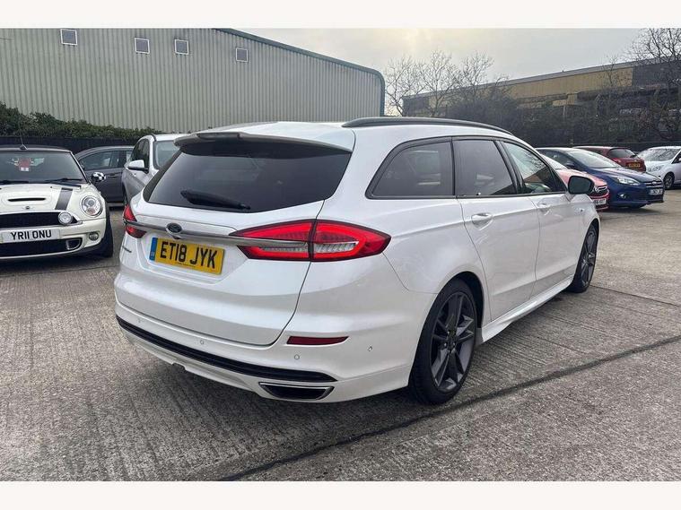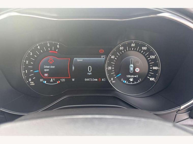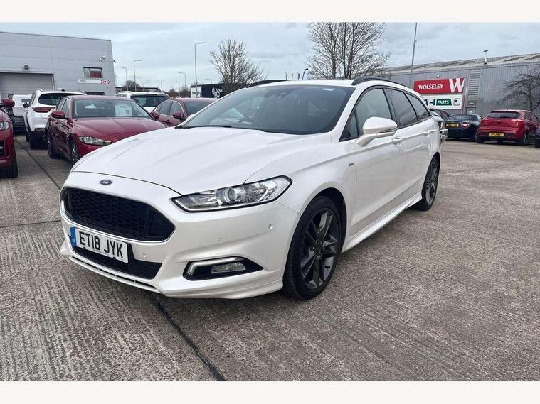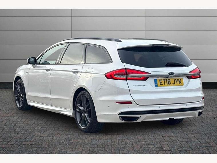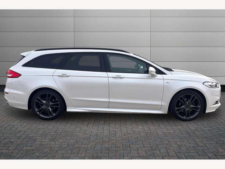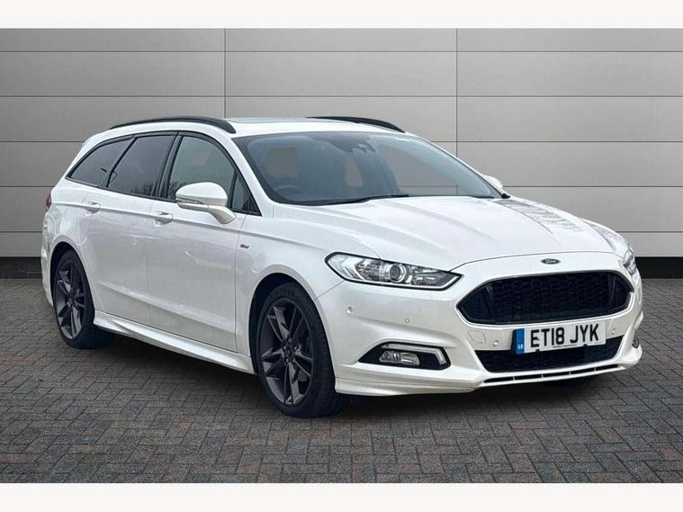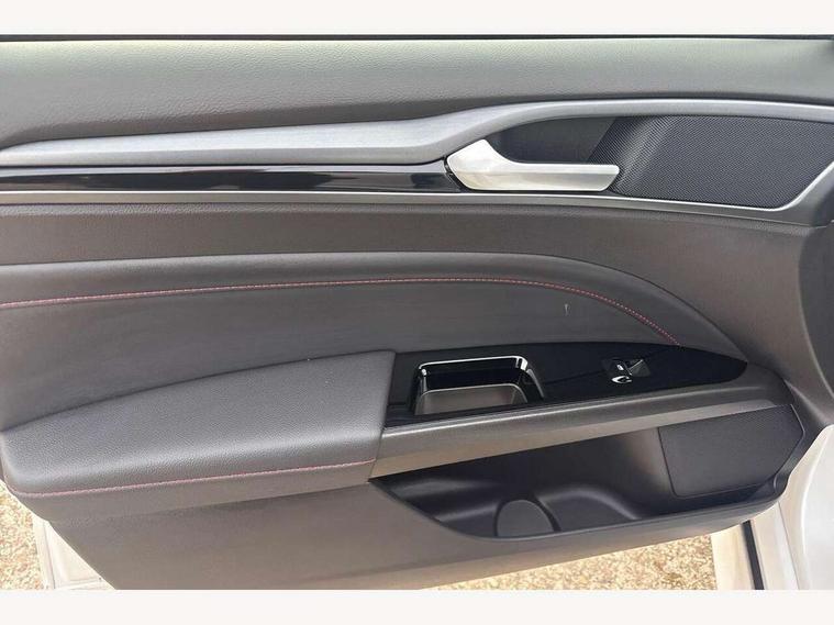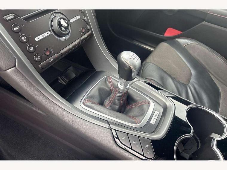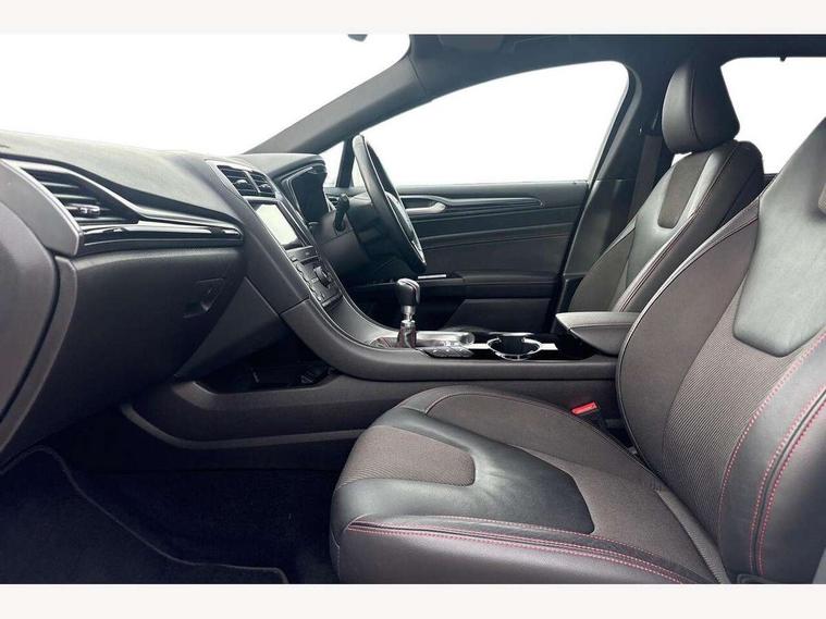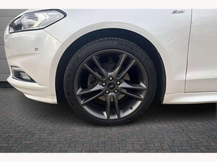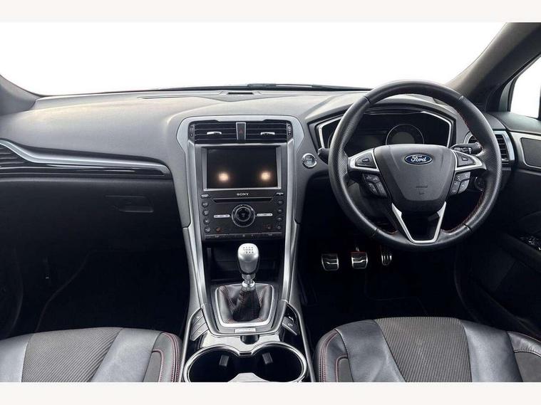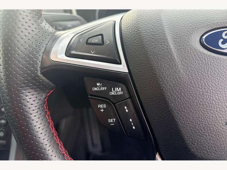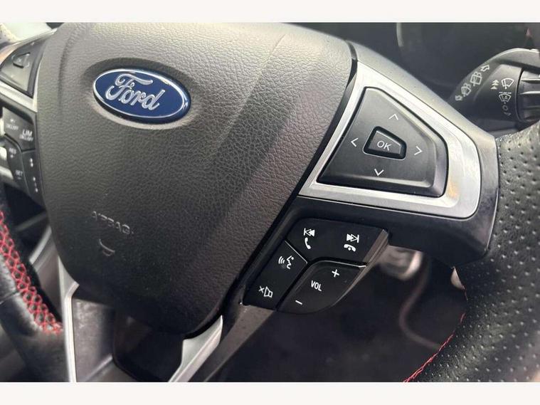 'Ford Power' starter button, Active TFT Crystal Display, Bluetooth connectivity with voice control, Easy fuel capless refuelling system, Ford SYNC 3 with 8" colour touch screen, Front and rear parking sensors, Lane keep assist with traffic sign recognition, auto dimming interior mirror, automatic headlights and wipers, PAS, Service indicator, SYNC Emergency Assistance, Trip computer, Diesel particulate filter, Sports suspension, Radio/CD, USB socket, 'Quickclear' heated windscreen/heated washer jets, Black roof rails, Body colour rocker mouldings, Body coloured bumpers, Bright front scuff plates with ST logo script, Chrome window surround, Electric adjustable door mirrors, Electric folding door mirrors, Electric front windows, Electric rear windows with global closing, Front fog lights with chrome surrounds, LED daytime running lights, LED tail lights, Puddle lights, Rear privacy glass, Rear spoiler, Rear wiper, 10 way electric adjustable drivers seat, Ambient lighting, Centre console with armrest, Dark headlining, Driver seat memory function, Driver's lumbar support, Dual zone automatic climate control, Folding rear seats, Front headrests, Heated front seats, Height adjustable passenger seat with lumbar support, Isofix on 2nd row rear seats, Leather gearknob, Part leather upholstery, Perforated leather steering wheel, Premium velour floor mats, Rake/reach adjustable steering wheel, Rear armrest, Rear headrests, Ski hatch, Sports seats, Tonneau cover, Bodystyling pack - Mondeo, 3x3 point rear seatbelts, ABS+EBA, Active city stop, Curtain airbags, Driver/front passenger airbag, Drivers knee airbag, Electronic parking brake, ESP + traction control, Hill start assist, Intelligent Protection System (IPS), Tyre pressure monitoring system, Immobiliser, Keyless entry and start, Remote central double locking, Thatcham Cat.1 alarm,