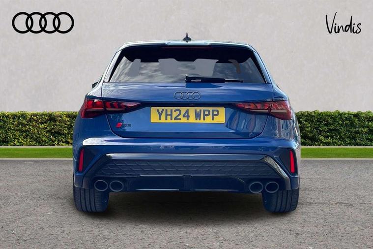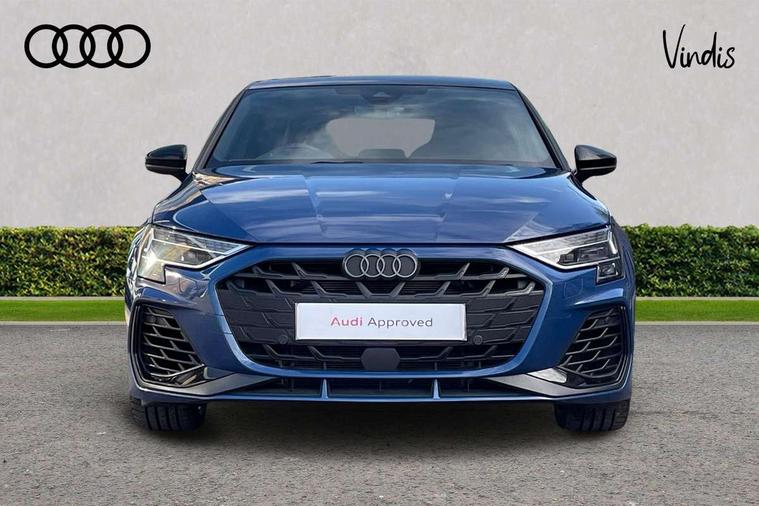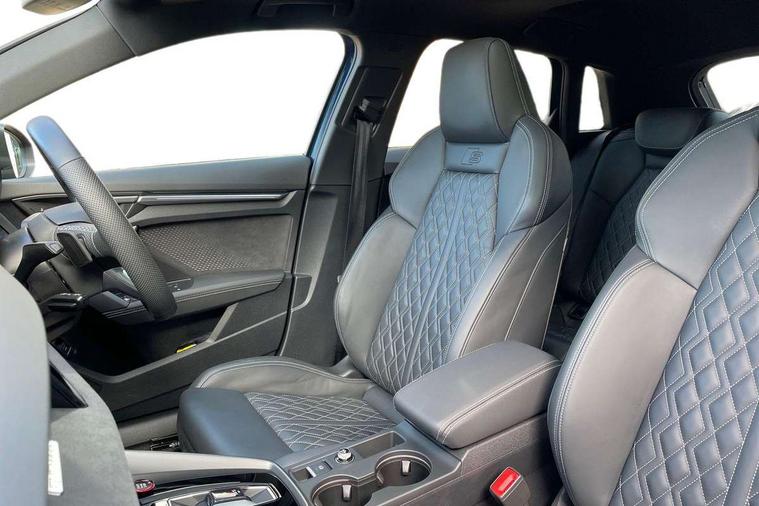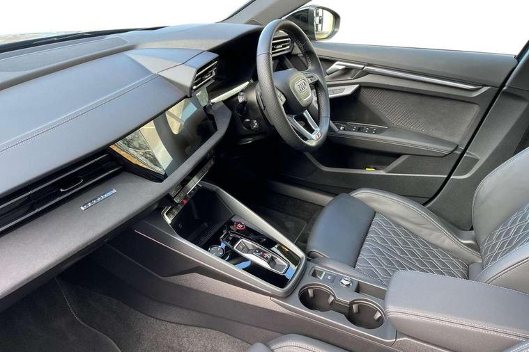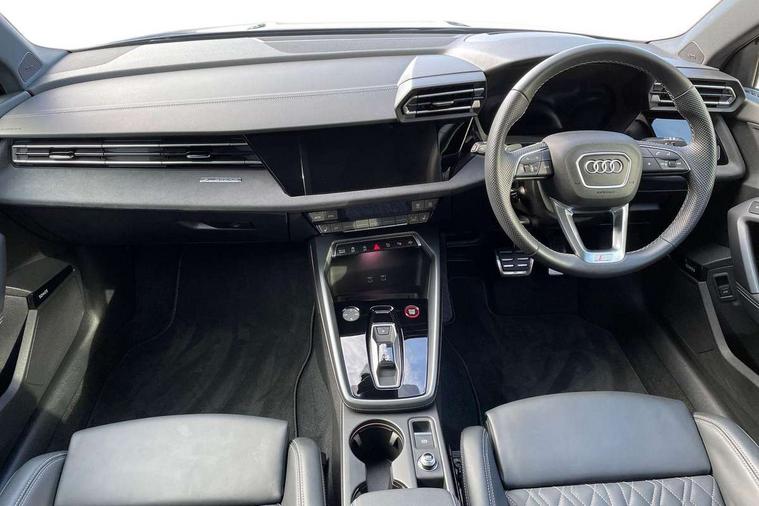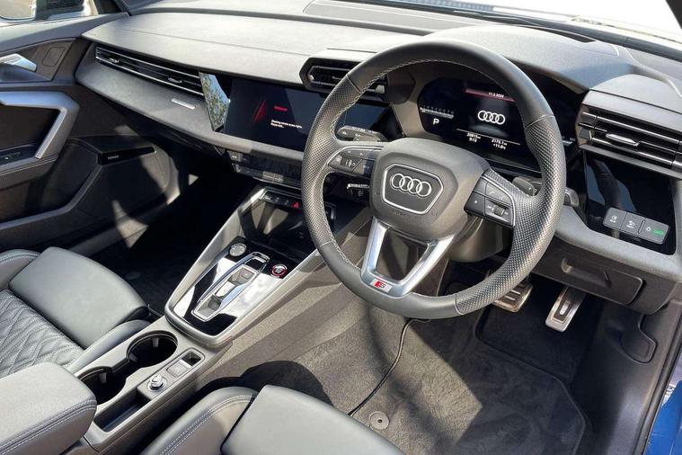 Adjustable speed limiter, Audi drive select, Audi smartphone interface with app store includes wireless Apple carplay, Android auto and Amazon alexa integration, Audi virtual cockpit plus - 12.3" full HD resolution dynamic digital instrument cluster, Automatic start/stop system with recuperation, Bluetooth interface, Camera based traffic sign recognition, Collision avoidance assistant, Distraction and Fatigue warning, e-Call (emergency call), Electromechanical power speed sensitive steering, Lane departure warning system, MMI Navigation Plus with high resolution 10.1" colour touch screen display, Park Assist with parking system Plus, Progressive steering, Service indicator, Tailgate, Trip computer, Voice control system with natural language interaction, S sport suspension with spring damper adjustment and lowering by 15mm, Audi Phonebox light with wireless charging, DAB Digital radio, USB ports with charging function in the rear, Anthracite grey Audi rings (front and rear), Audi Beam uses LEDs to project the rhombus S logo onto the ground as you exit your S3, Auto dimming frameless rear view mirror, Black accents front and rear bumpers including air inlets, Black accents in front grille and frame, Black accents window trims strips, Electrically adjustable/heated/folding/auto dimming door mirrors with integrated LED indications + kerb view function for passenger side, Exterior model badging, Front electric windows, Headlight washers, Heat insulating glass windscreen, Illuminated door sills with aluminium inserts at the front with S logo, LED 3rd brake light, LED daytime running lights, LED headlights with LED rear lights and dynamic rear indicators, Light and rain sensors, Privacy glass - dark tinted rear window, rear door and side windows, Rear electric windows, Rear side wing doors, Rear wiper, S grille, S3 front bumper with S specific air intake grilles, S3 roof spoiler, 12V socket and storage compartment in front centre console, 3 seat bench in 2nd row, 3 spoke flat bottomed leather multifunction sport steering wheel with gear shift paddles, 3-zone deluxe automatic air conditioning, 4 way electrically adjustable lumbar support for driver and front passenger, 40/20/40 split folding rear seat bench, Black cloth headlining, Fine Nappa leather upholstery with front sports seats S embossed logo, Front and rear centre armrest in artificial leather, Front and rear headrests, Front/rear floor mats, Heated front seats, Manual boot compartment lid, Manually adjustable front seats, S badging on the steering wheel, Seat side bolsters, Single front passenger seat, Stainless steel pedals and front footrest in black, Aluminium interior elements pack - A3 Sportback, Extended ambient lighting package Pro - S3 Black edition, Storage package - A3, Technology package - A3, 3x3 point rear seat belts, Driver and front passenger airbag with passenger airbag deactivation, Electronic Stabilisation Control (ESC) including ABS, ASR and EDL, First aid kit with warning triangle and 2 safety vests, Front side airbags with head airbags and interaction airbag, Hill hold assist, Pre-sense front with pedestrian and cyclist detection, Seatbelt monitoring, Tyre pressure loss indicator, Anti theft alarm, Anti-theft wheel bolts, Electronically operated child locks, Immobiliser, Remote control central locking, Inlays in black dynamica microfibre,