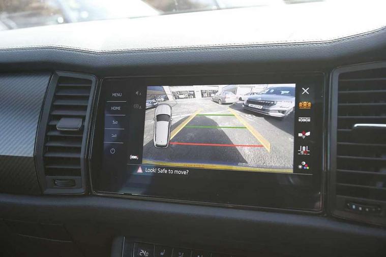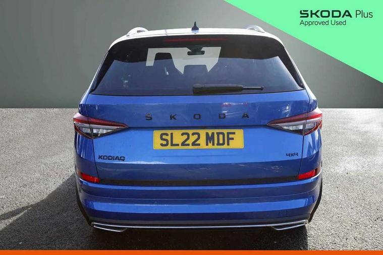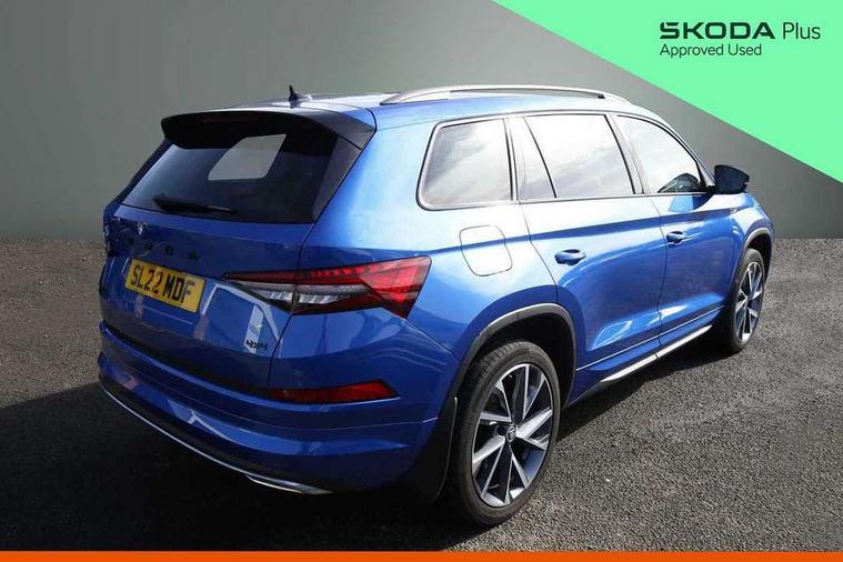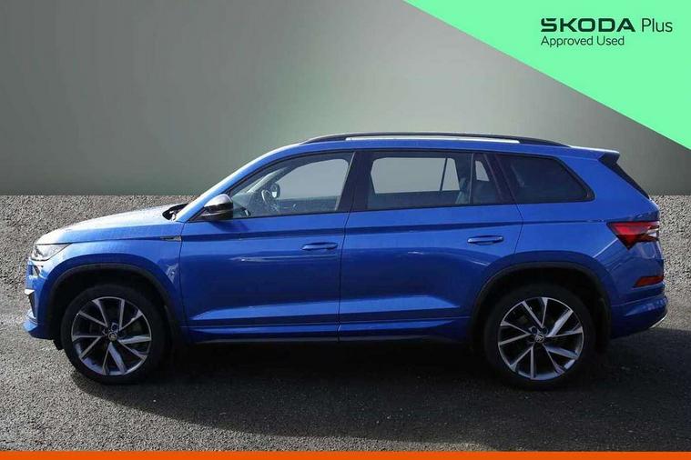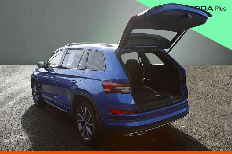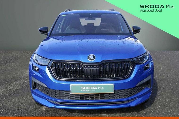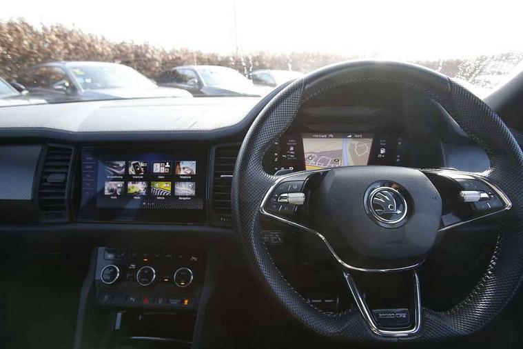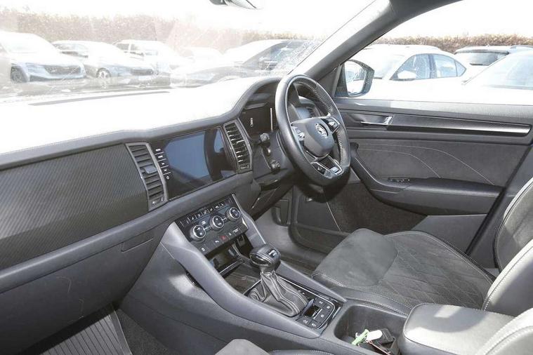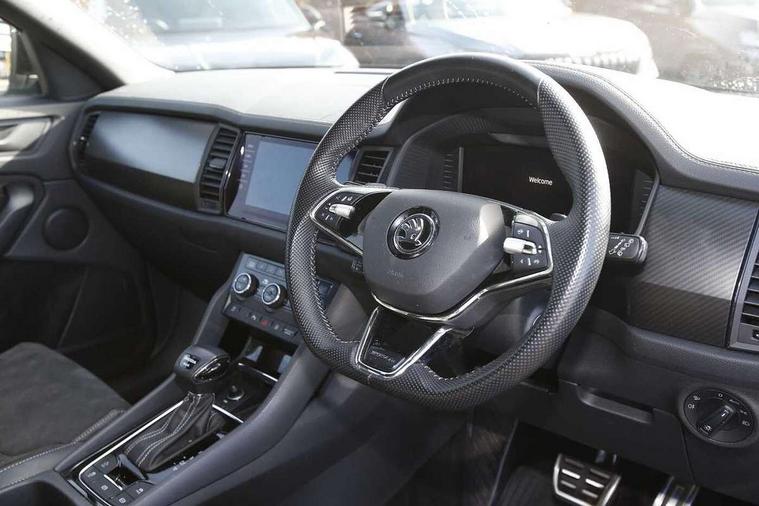 Bluetooth system, Columbus satellite navigation with 9.2" touchscreen, integrated Wi-Fi, web radio, Digital voice enhancement, E-call, ECO Stop/start function, Exterior temperature indicator, Progressive steering, Rear view camera, Smartlink wireless for apple carplay and wired for android auto, Speed limiter, Tailgate unlocking from outside, USB C Port x 2 in front centre console, Wireless charging, 8 Speakers, DAB Digital radio, Aero front windscreen wipers with intermittent function, Aero rear window wiper, Auto dimming rear view mirror, Black roof rails, Black sports styling including front grille and window surrounds, Black wheel arch surrounds, Body colour bumpers, Body colour door handles, Electric adjustable/heated/folding door mirrors, driver side auto dimming with boarding sports and memory function, Electric front and rear windows, Extended rear spoiler with finlets in gloss black, Front fog lights, Full LED matrix headlights with AFS (adaptive front light system), cornering function and AWL (all weather lighting system), Gloss black door mirrors, Headlight washers, Heated rear window, Invisible tailpipe, LED daytime running lights, LED rear fog light, LED third brake light in rear spoiler, Light assistant (coming/leaving home/tunnel light), Off-road style lower front bumper element, Privacy glass, Rain and light sensors, Rear diffuser, Rear LED lights (high functionality) with welcome effect and dynamic indicators, Rear side wing doors, Safety reflectors on front and rear doors, Sportline badge on front fender, Sports front and rear bumpers including lower rear chrome strip, Tailgate lettering in Black, Window control switches with black trim, Without engine designation, 12V socket in boot, 2 rails with 2 hooks, 2 seat bench in 3rd row, 3 seat bench in 2nd row, 4 foldable roof handles with rear coat hooks, 60:40 foldable rear seat with sliding adjustment and backrest angle adjustment, Aluminium pedals, Black roof headlining, Bottle holders in door panel in the 1.5 litre front and 1 litre rear, Cargo storage compartments, Chrome headlight control button, Chrome interior door handles, Coat hooks on B pillar, Covered storage compartment on driver side, Front centre armrest with storage compartment, cup holder and 12V socket, Front courtesy lights, Gear shift lever with chrome frame and black gloss insert, Grey stitching in front and rear armrests and door armrests + door inserts, Height adjustable front headrests, Illuminated and cooled glovebox, Illuminated luggage compartment, Isofix child seat fittings in outer rear seats with top tether, Manually adjustable steering column, Microsuede door panels, Net programme in boot (1x horizontal Net, 2x vertical Nets), Overhead glasses storage compartment, Pollen filter, Rear centre armrest with cupholders, Single front passenger seat, Sliding trunk cover, Small Bags on the inner sides of the front backrests, Sports seats, Sunvisors with illuminated vanity mirrors, Three rear height adjustable headrests, Ticket holder on A Pillar, Umbrella in door panel, Variable boot floor, LED Interior light pack - Kodiaq, Auto door release and activation of warning lights in the event of an accident, Child locks on rear doors, Driver and front passenger airbag with knee airbag and front passenger airbag deactivation, Electronic parking brake with hill start assist, Emergency rear braking signal, ESC (incl. ABS+MSR+ASR+EDS+HBA+DSR+RBS+MKB), Front assist with autonomous emergency braking, Front side airbags with curtain airbags, Fuel cut off safety device, Height adjustable front 3 point seatbelts + pretensioners, Hill hold control, Rear disc brakes, Safety vest holder in door, Seat belt reminder for all seats, Three point rear seat belts, Two tone horn, Tyre pressure monitor, Alarm with interior monitoring and tilt sensor with safe function, Anti-theft wheel bolts, Immobiliser, Keyless entry and start system (KESSY), Remote central locking with 2 keys, Black air vent surround, Carbon finish dashboard and door inserts, Grey stitching in dashboard, 20" Vega Anthracite alloy wheels, Temporary spare wheel (space saver),