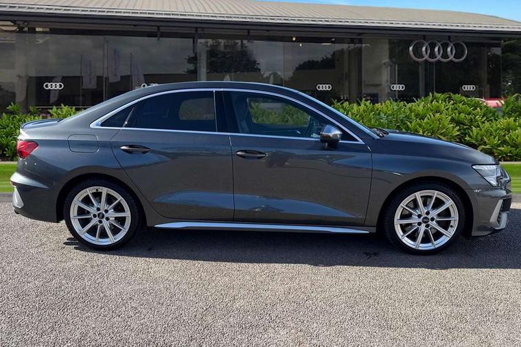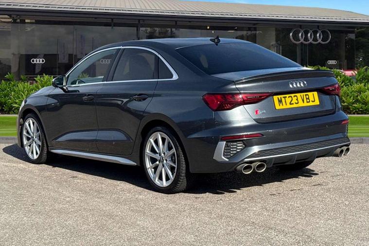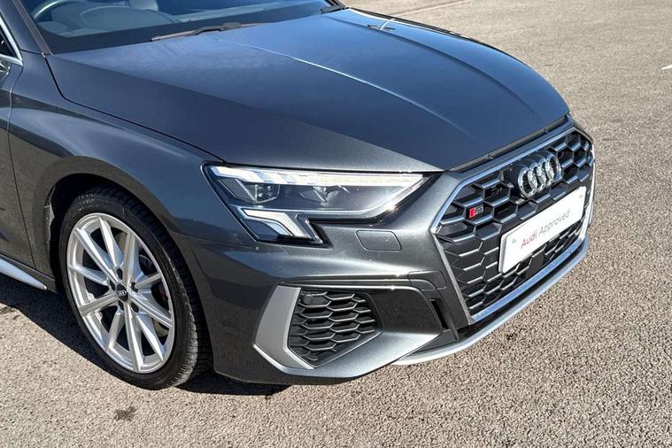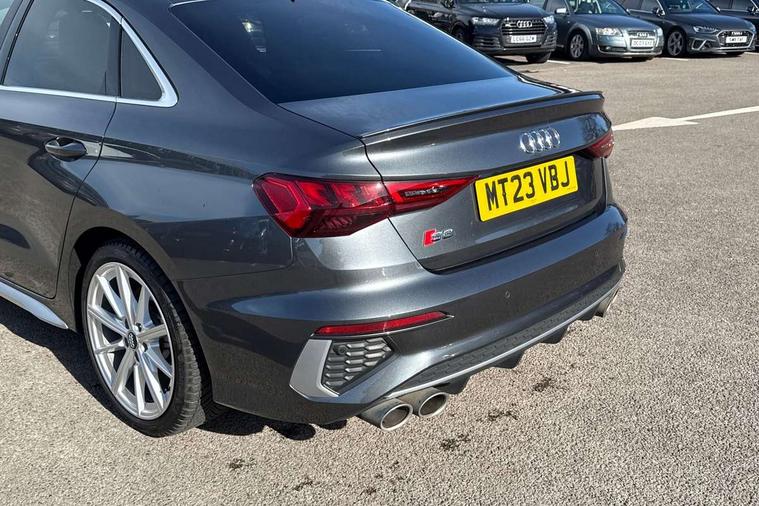 Audi connect emergency call and service, Audi drive select (Auto, Comfort, Dynamic, Efficiency and Individual), Audi smartphone interface, Audi Virtual Cockpit - 10.25" digital and colour instrument cluster, Automatic start/stop system with recuperation, Bluetooth interface, Collision avoidance assistant, Lane departure warning system, MMI Navigation Plus with high resolution 10.1" colour touch screen display, Progressive steering, Service indicator, Voice control system with natural language interaction, Quattro permanent all wheel drive, S sport suspension with spring damper adjustment and lowering by 15mm, 2x USB Type C ports (for charging and data transfer), 6 passive loudspeakers, CD player, DAB Digital radio, 3rd brake light, Acoustic glass windscreen, Audi Beam uses LEDs to project the Audi logo onto the ground as you exit your S3, Auto dimming frameless rear view mirror, Dual branch oval twin tailpipes in chrome plated finish, Electrically adjustable/heated/folding/dimming door mirrors with kerb view includes integrated LED indications + kerb view function for passenger side, Exterior mirror with aluminium look housing, Front electric windows, Headlight washers, Illuminated door sills with aluminium inserts at the front with S logo, LED daytime running lights, LED headlights with LED rear lights and dynamic rear indicators, Light and rain sensors, Model and engine designation badges at rear, Privacy glass - dark tinted rear window, rear door and side windows, Rear boot, Rear electric windows, Rear side wing doors, 12V socket and storage compartment in front centre console, 3 seat bench in 2nd row, 40/20/40 split folding rear seat bench with cupholder, Black cloth headlining, Dual zone electronic climate control, Fine Nappa leather upholstery with front sports seats S embossed logo, Front and rear centre armrest in leather, Front and rear headrests, Front/rear floor mats, Heated front seats, Height and reach adjustable steering wheel, Illuminated vanity mirror, Interior lighting - glove compartment light and right hand side, Luggage compartment floor covering, Manual boot compartment lid, Single front passenger seat, Stainless steel pedals and front footrest in black, Body styling design pack - S3, LED interior lighting pack - A3 Saloon, Storage pack - A3/S3 Saloon, 3x3 point rear seat belts, Driver and front passenger airbag with passenger airbag deactivation, Electronic Stabilisation Control (ESC) including ABS, ASR and EDL, First aid kit with warning triangle and 2 safety vests, Front side airbags with head airbags and interaction airbag, Hill hold assist, Pre-sense front with pedestrian and cyclist detection, Seatbelt monitoring, Tyre pressure loss indicator, Anti theft alarm, Anti-theft wheel bolts, Electronically operated child locks, Immobiliser, Remote control central locking, Aluminium air vent surrounds, Aluminium trim elements, Dark spectrum aluminium inlays, accent surfaces in the dashboard and centre console in platinum grey silk effect paint finish,