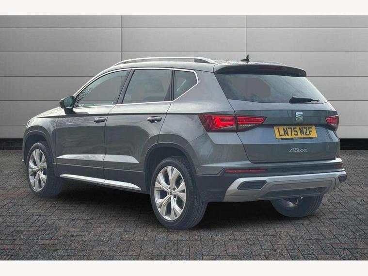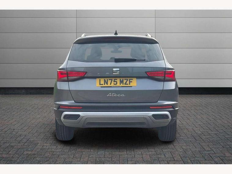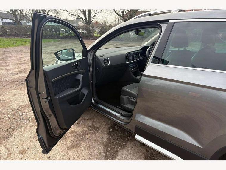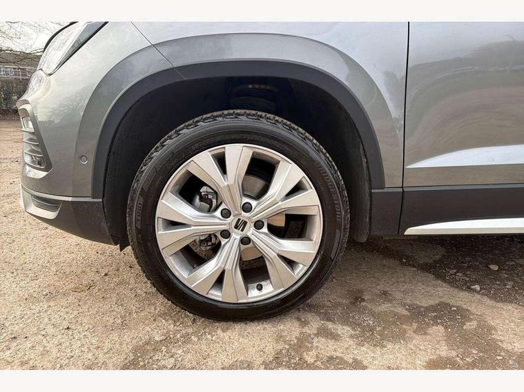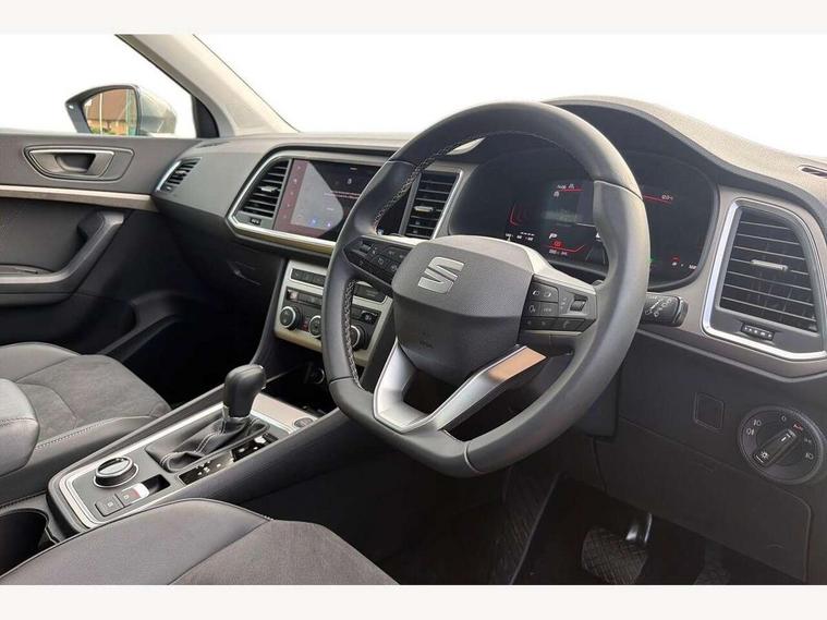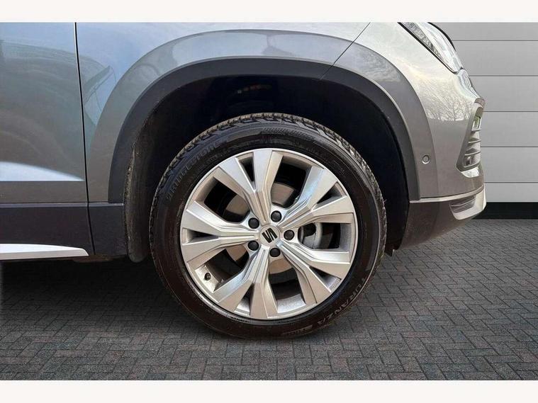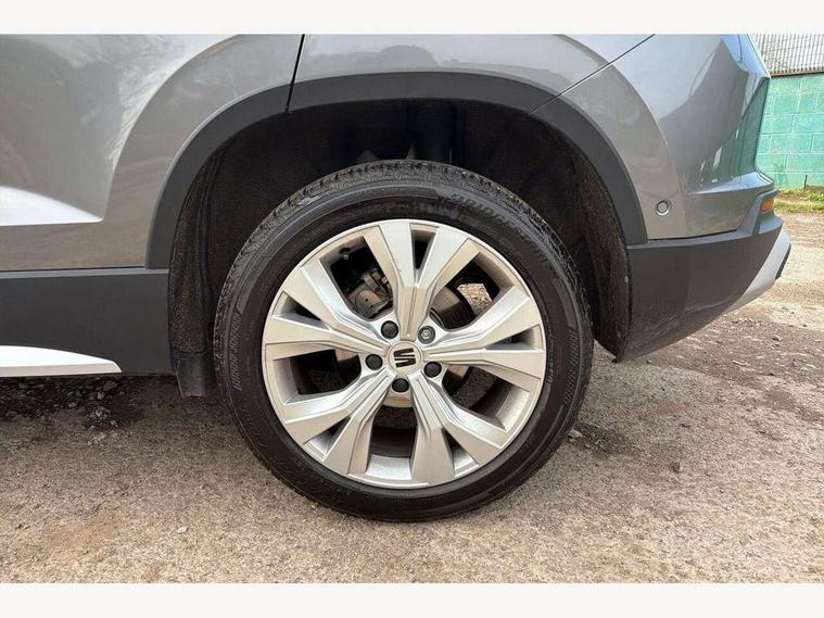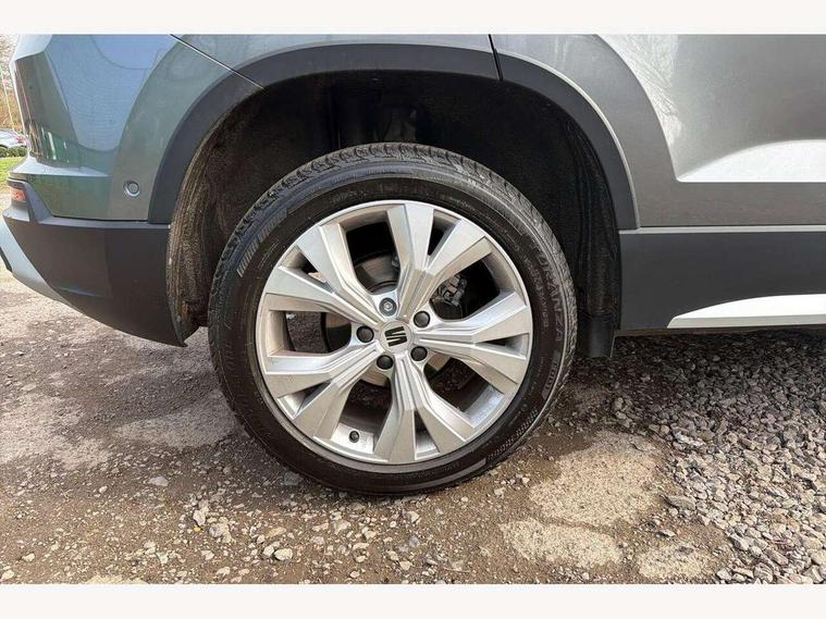8" Digital cockpit, Colour multi-function on board computer display, E-call, Electric tailgate, Outside temperature gauge, Progressive power assisted steering, Rear view camera, SEAT drive profile with driving experience button - Normal, Sport, Eco and Individual mode, gearshift, steering and throttle response, Self parking functionality (includes front and rear parking sensors), Start/stop system, Trip computer, wired and wireless full link smartphone integration, Wireless phone charger, Steering wheel mounted audio/phone controls, Black wheel arch surrounds, Body colour bumpers, Chrome front grille frame, Chrome roof rails, Chrome side window trim, Dark tinted rear windows, Daytime running lights, Door mirrors with welcome light silhouette, Dynamic headlight range control with self adjusting whilst driving, Electric adjustable/heated/folding door mirrors, Front and rear electric windows, Front grille hot stamping, Full LED headlamps with lens and LED front fog lamps with cornering function, Heat reflecting windscreen, Illuminated aluminium front door sill, LED 3rd brake light, LED rear tail lights with dynamic indicators, Rear exhaust tailpipe, Rear fog lights, Rear side wing doors, Rear wash/wipe, Reflex silver side mouldings, Variable front intermittent wipers, 12V socket in front, 3 seat bench in 2nd row, 60/40 split folding rear seat, Dinamica upholstery with front comfort seats, Drawer under right front seat, Dual zone climate control, Front and rear head restraints, Front centre armrest, Front seat back storage pockets, Height adjustable driver and passenger seat with lumbar adjustment, ISOFIX points in outer rear seats with top tether anchorage points, Leather sports steering wheel and gear knob, Rear armrest and easy back seat release mechanism from boot, Single front passenger seat, Steering wheel mounted gearshift paddles, Convenience pack - Ateca, Interior lighting pack - Ateca, Navigation system pack with DAB - Ateca, Safety and driving pack (M) - Ateca, Safety and driving pack with attention and drowsiness assist - Ateca, 3x3 point rear seatbelts, ABS, Traction control system (TCS), Electronic stability control (ESC) and Electronic differential lock system (XDS), Airbags - Driver and front passenger airbag with deactivation, front side, two curtain and driver's knee airbags, Electric parking brake with auto hold function, Front and rear seatbelt reminder, Hill hold control, Manual rear child locks, Single tone horn, Tiredness recognition system, Tyre pressure monitoring system, Alarm, Keyless entry, Locking wheel bolts, Remote central locking, Chrome interior detailing, 18" Brillaint silver alloy wheels,