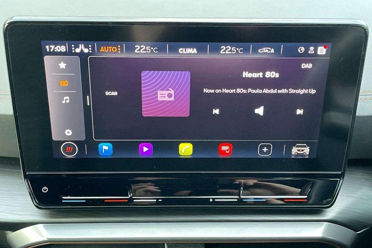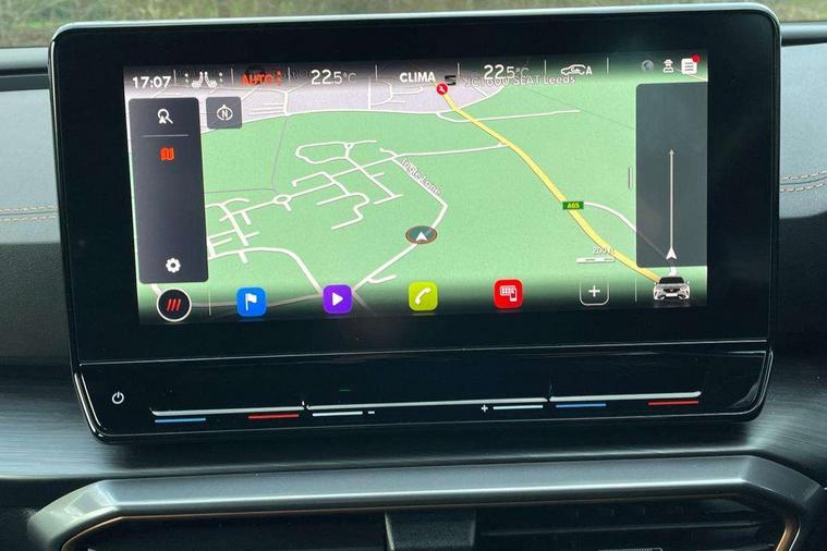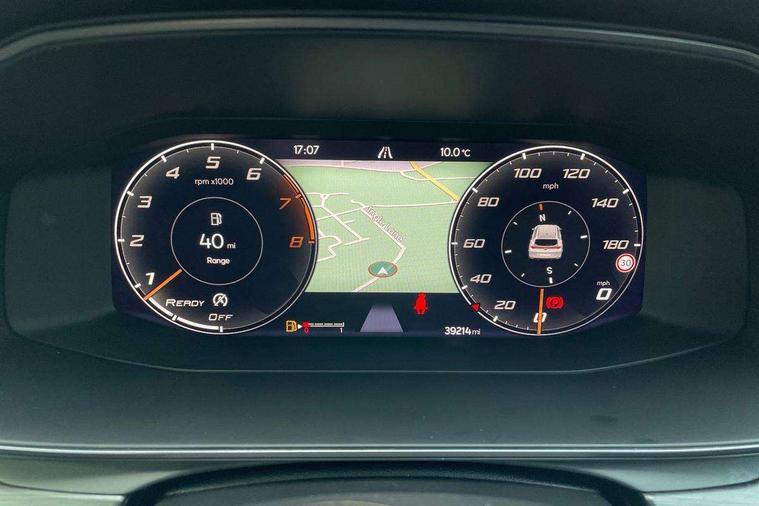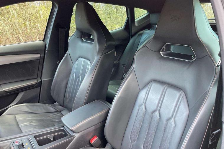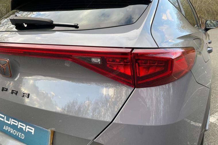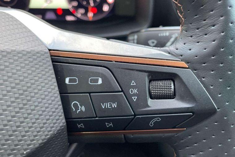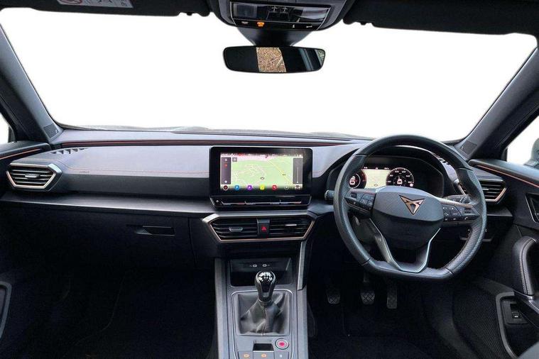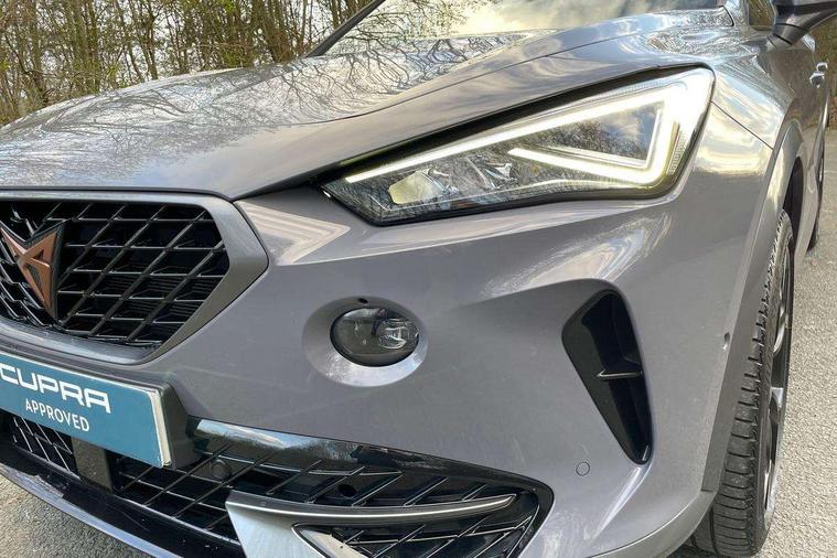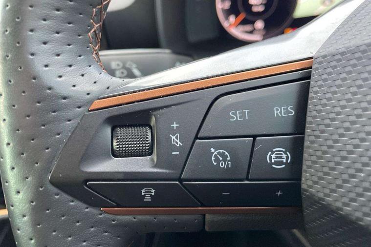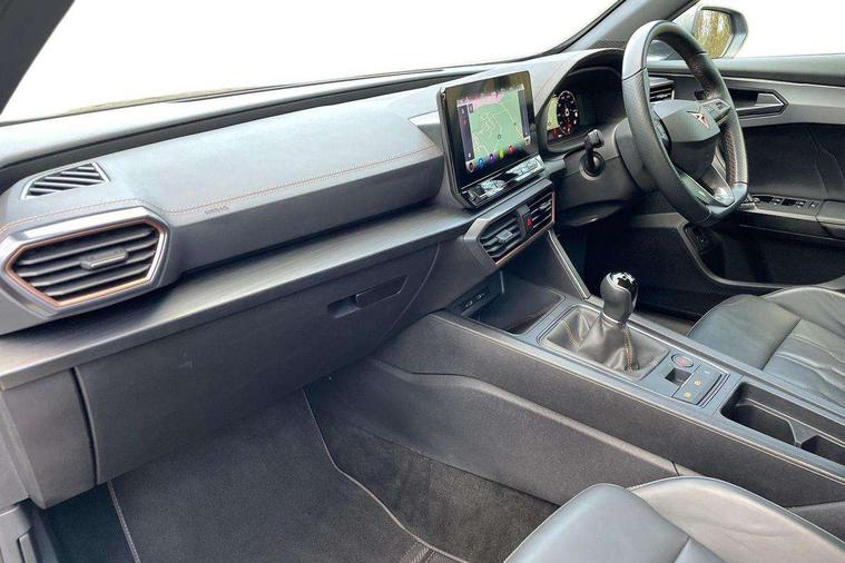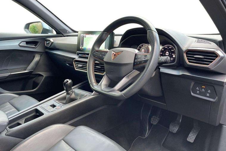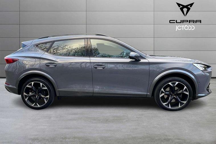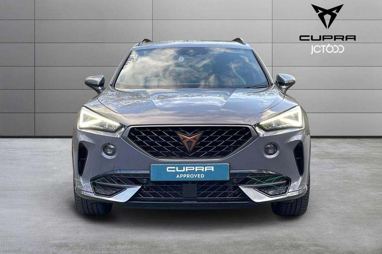 Digital cockpit and configurable dashboard, Driver alert system, Driving profile selection, E-call, Forward collision warning with automatic braking, Lane assist, Park assist (inc front/rear parking sensors), PAS, Predictive adaptive cruise control with speed limiter, Rear view camera, RPM, trip computer, outside temp gauge, instrument light brightness, low fuel warning light, lights on reminder, gearshift indicator, Service interval indicator, Start/stop system with regenerative braking, Wireless apple carplay, Wireless phone charger, Electronic locking differential and dynamic traction support, Standard suspension, 2 front and 2 rear USB type C sockets, Auxiliary input socket, DAB radio, Auto dimming rear view mirror, Body colour door handles, Body coloured bumpers, Dark grey wing mirror, Daytime running light with automatic headlight control and coming home feature, Dynamic headlight range control, Electric front/rear windows, Electrically adjustable heated and folding door mirrors with memory function, Front fog lamps with cornering function, Gloss black roof rails and window surrounds, LED Headlights, LED Taillights with dynamic indicator, Rain sensing wipers, Rear diffuser with black simulated exhaust pipes, Rear side wing doors, Rear wash/wipe, Third brake light, Tinted rear windows, Welcome lights, 12v power supply in centre console, 12V socket, 12v socket in loadspace, 2 front and 2 rear reading lights, 230V socket, 3 seat bench in 2nd row, 60/40 split rear bench seat with armrest and mechanical seat release, Dust/pollen filter, Front and rear head restraints, Front centre armrest, Height/reach adjust steering wheel, Illuminated interior front door sills, Illuminated sunvisor with mirror, Isofix, Leather multi function steering wheel, Luggage tie-down hooks, Single front passenger seat, Three zone climate control with control panel in rear, Variable luggage/load compartment floor, Wraparound lighting, Genuine Nappa leather Pack - Cupra, Navigation system pack with 10" navigation system - Formentor, Safety and driving pack (M) - Formentor, 3 point seatbelts on all rear seats, ABS, Brake control system - ESC and brake booster, Child proof door locks, Driver and front passenger airbags with front passenger airbag de-activation, Electronic parking brake, Front and rear disc brakes, Front side curtain airbags, Hill hold control, Seat belt reminder for front and rear seats, Tyre pressure monitoring system, Anti theft alarm system, Keyless entry and start system (KESSY), Locking wheel bolts, Copper and aluminium interior detailing, 19" 'Exclusive' machined sport matte black and silver alloy wheels,