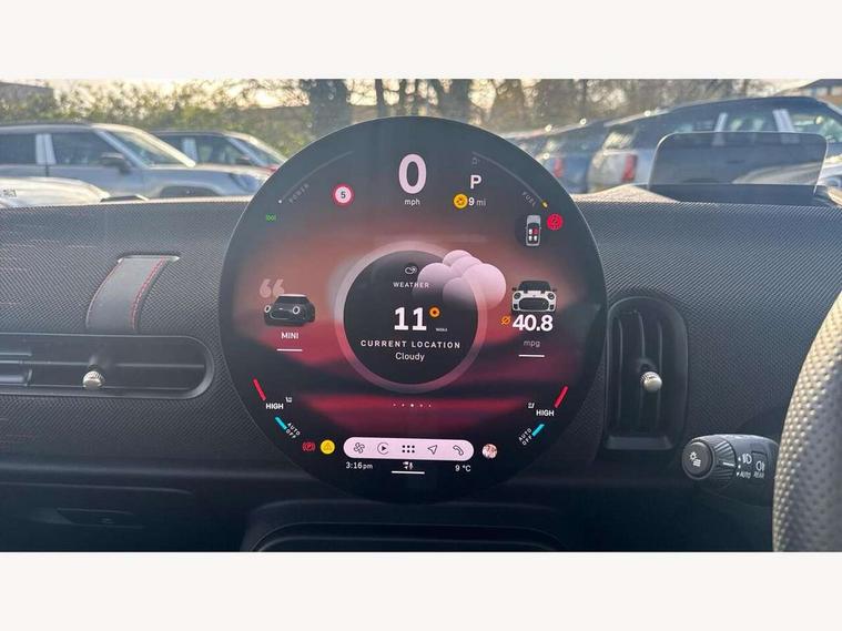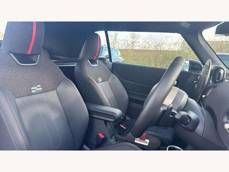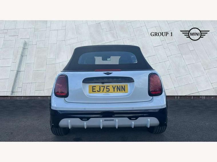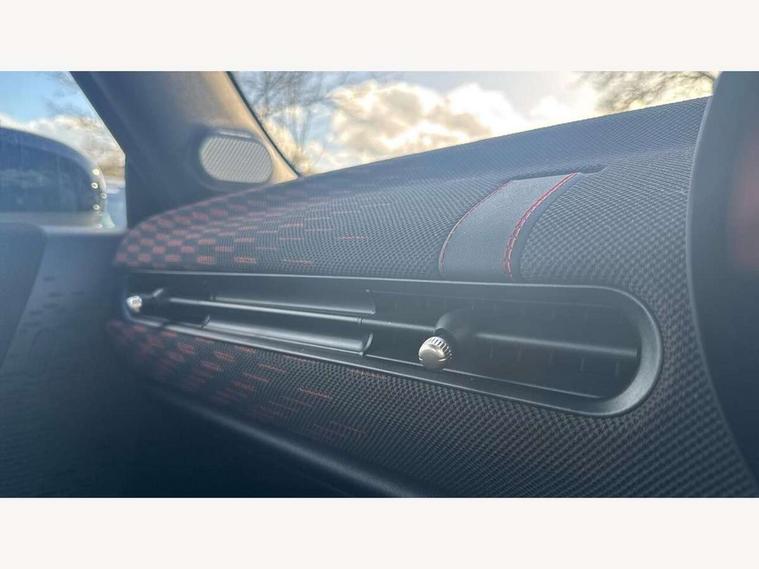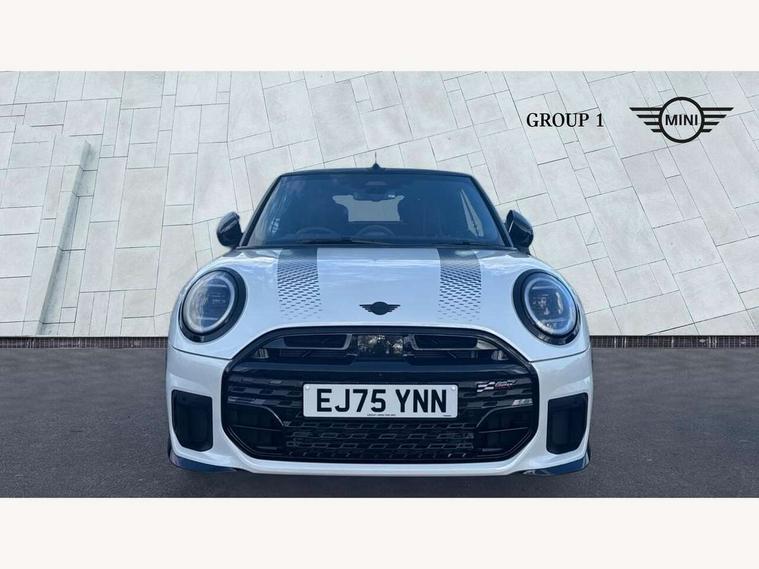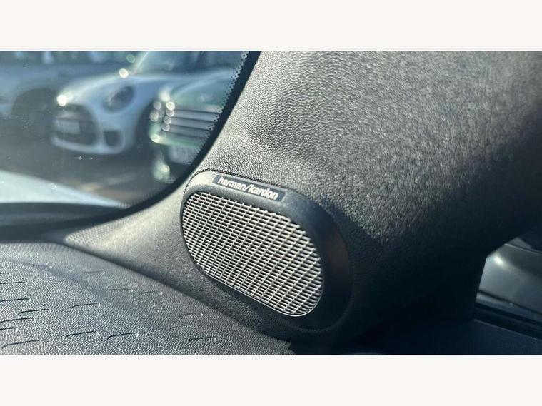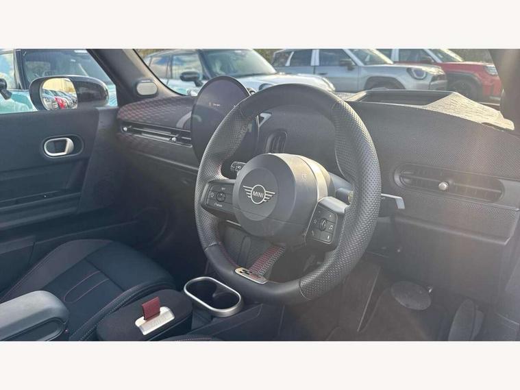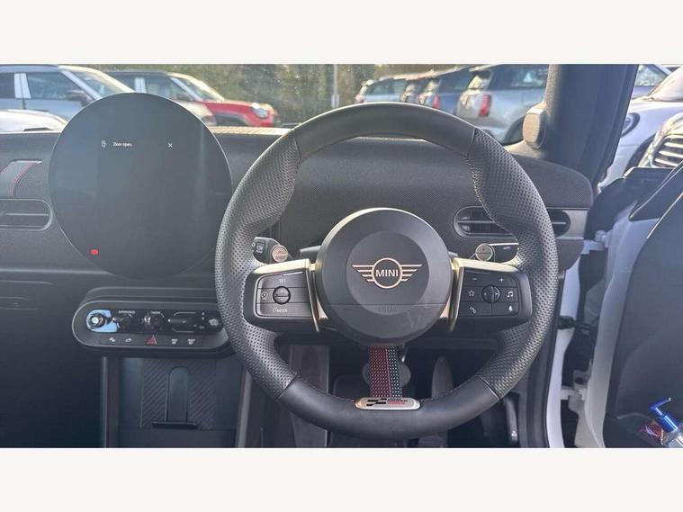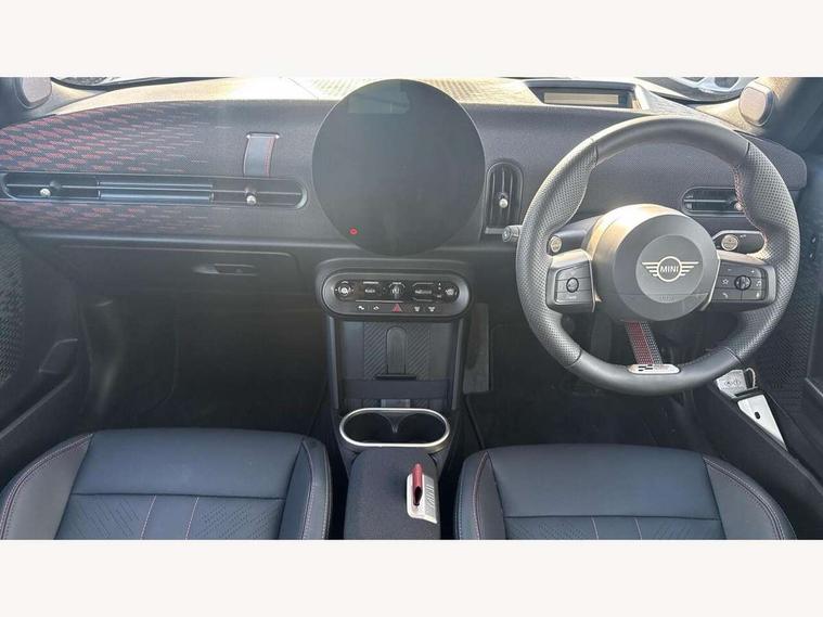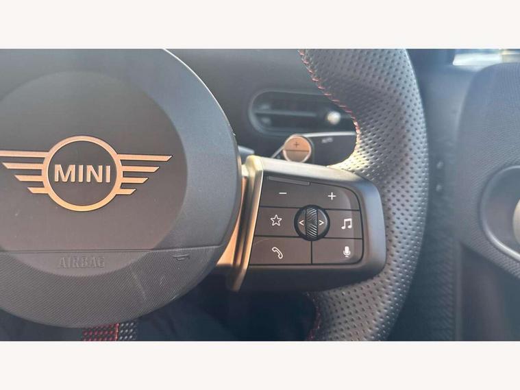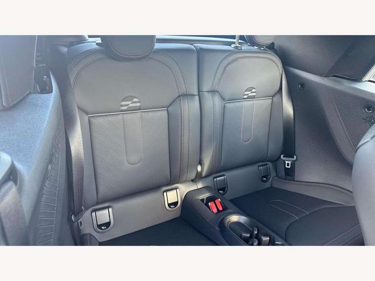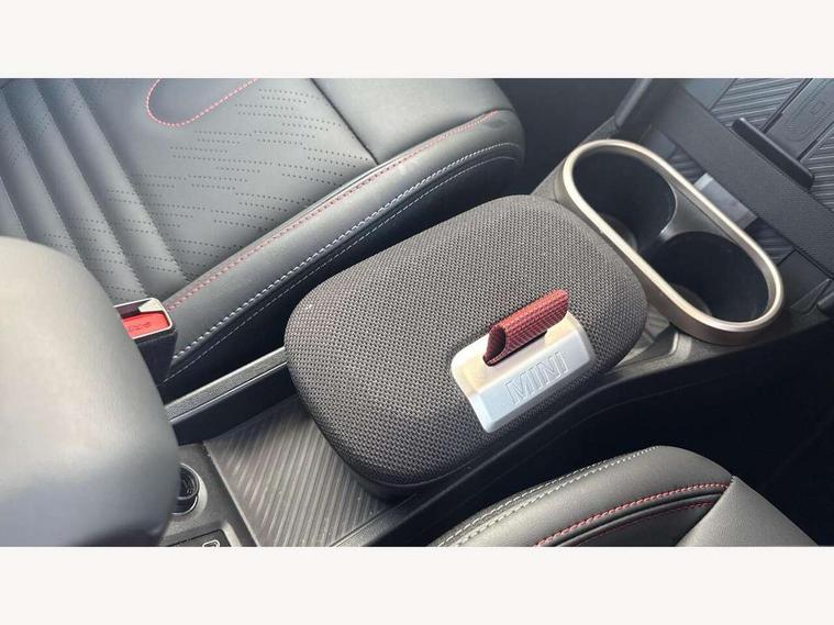 Always open timer, Central toggle bar, Circular OLED Screen, Compatible mobile phone bluetooth with audio streaming, Cruise control, Digital instrument cluster, e-Call (emergency call), MINI Experience Modes, Mini navigation system, On board computer, PAS, Service interval indicator, 7 speed steptronic transmission with double clutch, Adaptive suspension, DAB Digital radio, Personal eSim, Auto headlights, Electric front windows, Front and rear apron, High gloss hexagonal patterned grille surround, LED 3rd brake light, LED daytime running lights, LED Headlights, LED indicator lights, LED rear lights, Logos in Vibrant Silver, Rain sensor window wipers, Rear boot, Rear fog lights, Rear roof spoiler with airblades, Wind deflector, 2 seat bench in second row, 2 zone automatic air conditioning, 60/40 rear seat bench, Ambient lighting, Black lower band in high gloss, Floor mats, Front and rear head restraints, Front compact armrest, Heated steering wheel, Height adjustable passenger seat, Lidded storage box in Black/Red knit, Light headliner, Luggage compartment lighting, Partially perforated vescin steering wheel with red accent, black/red decorative strap, Single front passenger seat, Steering wheel paddle shift, Sunvisors with vanity mirrors, Driving assistant pack - Cooper Convertible, Park assistant pack - Cooper Convertible, 3 point seatbelts on all four seats, 6 Airbags - front, side, head and seat belt tensioners, Anti-lock braking system (ABS), Brake caliper in Black with JCW badge, DSC - Dynamic Stability Control, Electronic parking brake, Front and rear disc brakes, Front ISOFIX (iSize), Front passenger airbag deactivation, JCW Sport Brakes, Traction control, Tyre pressure monitoring system, Alarm, Immobiliser, Physical spare key (not digital), Remote central locking, Black/Red decorative dash strap, Tyre repair kit,