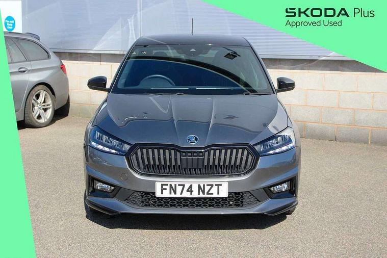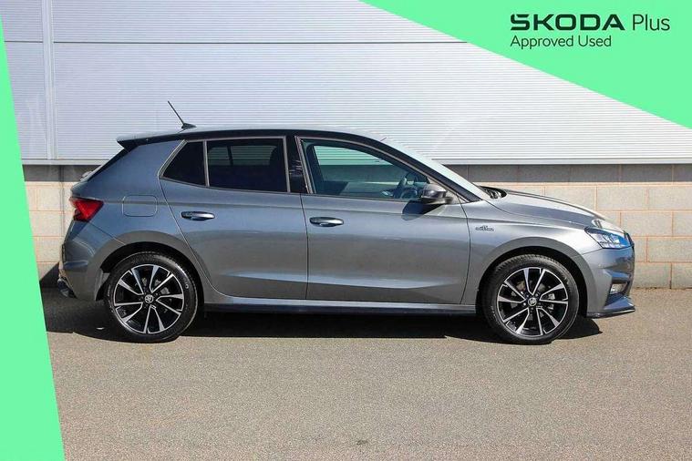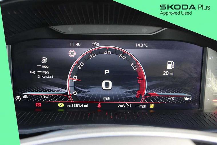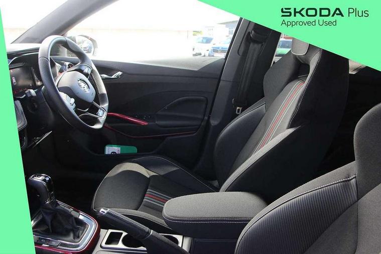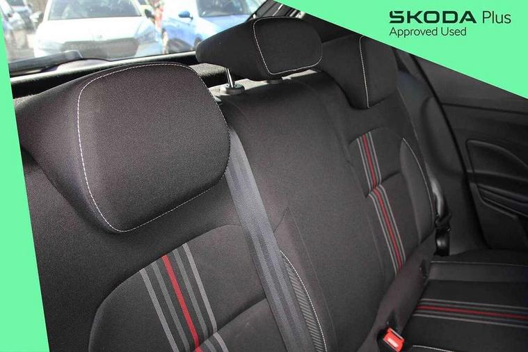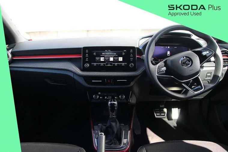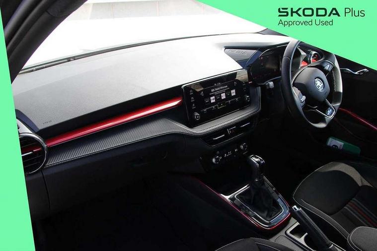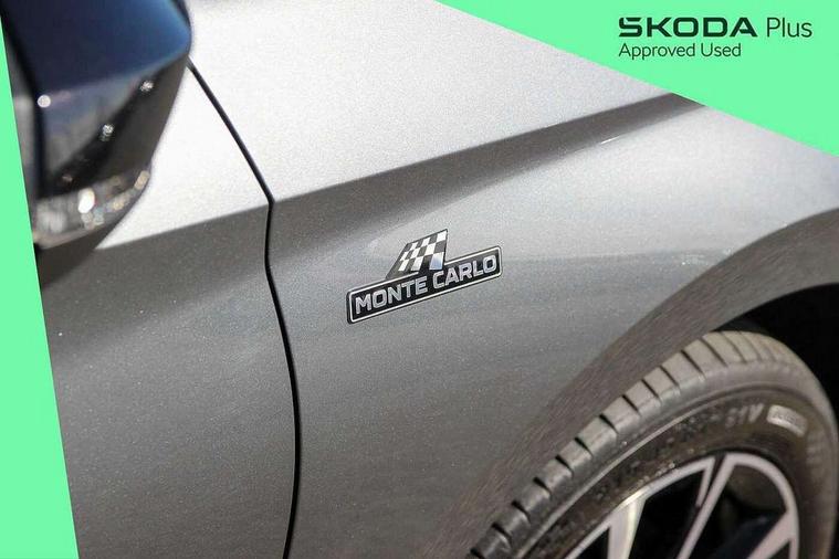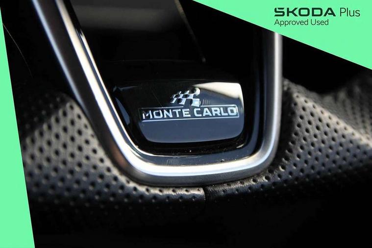 Advanced driver attention and drowsiness monitor, Bluetooth connection, Electromechanical power steering, Exterior temperature gauge, Service interval indicator, Traffic sign recognition, Virtual cockpit with 10.25" colour display, Wireless SmartLink for Apple CarPlay and Android Auto, 6 Speakers (4 in front and 2 in rear), Auxiliary socket for external MP3 player, DAB digital radio reception, Auto dimming rear view mirror, Black radiator grille, Body coloured bumpers, Door mirror integrated indicators, Front and rear electric windows, Front window wiper intermittent control, Headlight range control - Automatic, Ice scraper in fuel cap, LED daytime running lights with coming and leaving home feature, LED rear lights, Monte Carlo badging, Privacy glass, Rear LED fog light, Rear side wing doors, Rear window wiper with washing nozzles, Roof mounted spoiler, SKODA tailgate lettering in black, Sports bumpers, Third brake light, 2 reading lights in front and 2 reading lights in rear, 3 rear headrests, Aluminium pedals, Backrest split and folding, Black headlining, Central console with removable cup holder and storage box, Chrome handbrake release button, Door sills with fabia badging, Dual zone air conditioning with climatronic electronic control, Fabric/artificial leather upholstery, Front centre armrest, Front sports seats, Gearshift knob/handle in leather, Hand brake lever handle in leather, Height adjustable front headrests, Height adjustable front seats, Height adjustable steering wheel, ISOFIX and TopTether anchorage points to the outer rear seats, ISOFIX and TopTether on the front passenger seat, Luggage compartment lighting, Manually adjustable lumbar support in front seats, Metallic painted red central console cover, Metallic red interior door handles, Pollen filter, Rear seat bench unsplit, Single front passenger seat, Sun visors with mirror and airbag label on passenger side, Textile floor mats, Ticket holder, Umbrella in drivers door, 3-point height adjustable front seats belts with pretensioner and force limiter, Automatic warning lights in case of crash, Driver and passengers airbag with switch off function, e-Call+, ESC including ABS, MSR, ASR, EDS, HBA and XDS, Front and rear seat belt warning, FRONT ASSIST (AEB City and AEB Inter Urban), Front side airbags, Head airbags, Hill hold control, One tone horn, Pedestrian protection, Three rear 3-points safety seat belts with pretensioner and force limiter including stop function for outer rear seat belts, Tyre pressure monitoring system, Anti-theft alarm system including immobiliser, interior monitoring, backup horn, and towing protection, Central locking with radio remote control, interior controls, SAFE function and 2 foldable keys, Carbon effect door and side trim panels, Carbon effect lower decorative trim with white stitching, Monte carlo air vents, Red metallic upper decorative trim, Anti-theft wheel bolts protection, Super-low rolling resistance tyres,