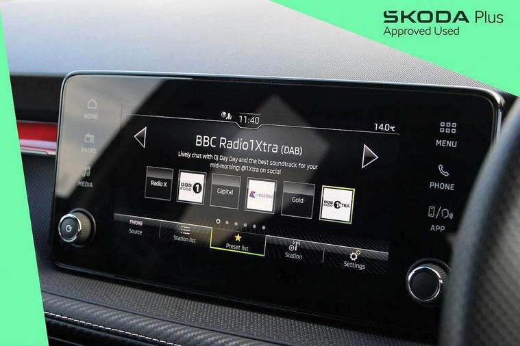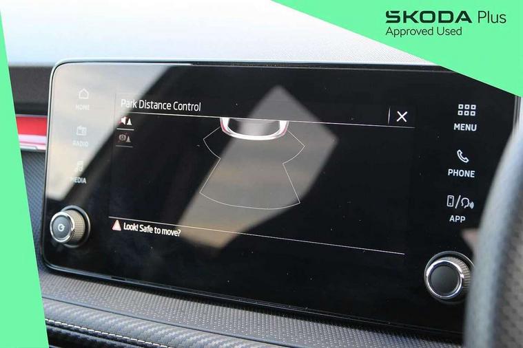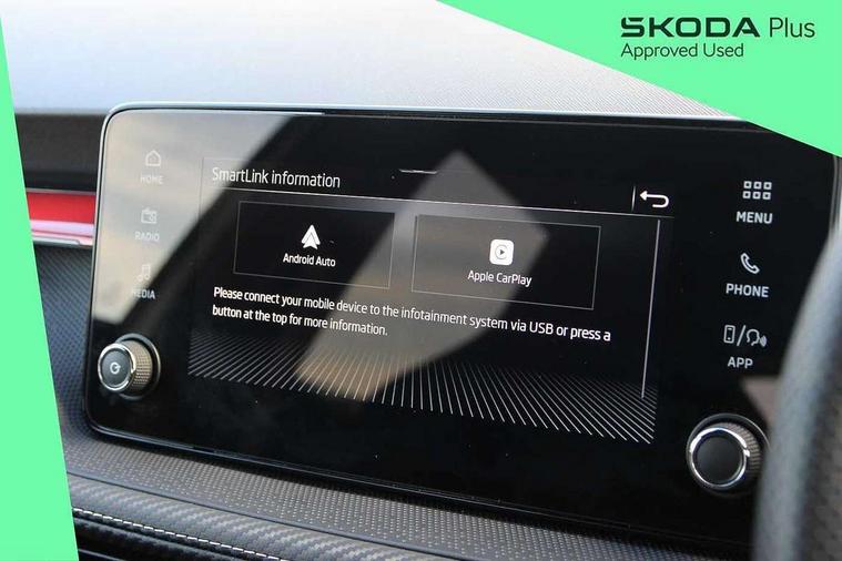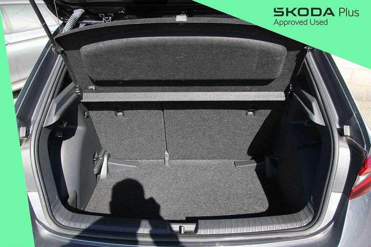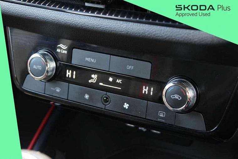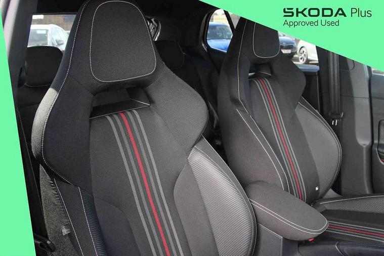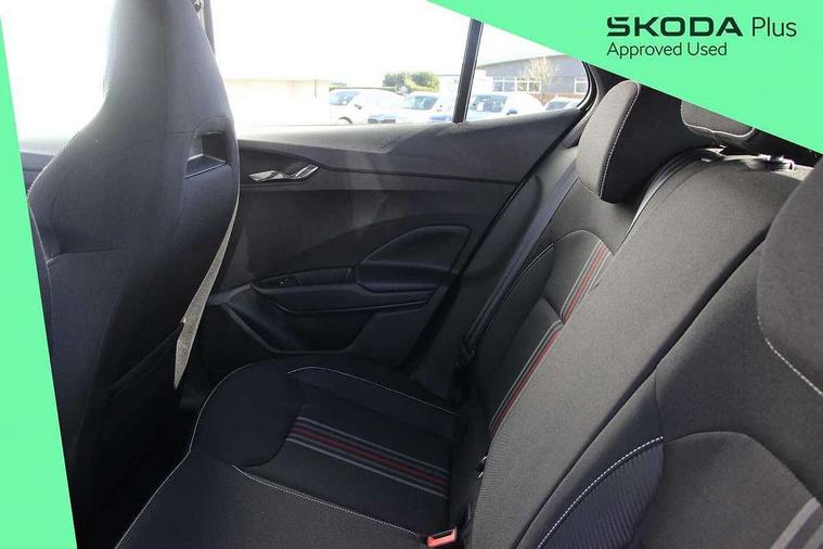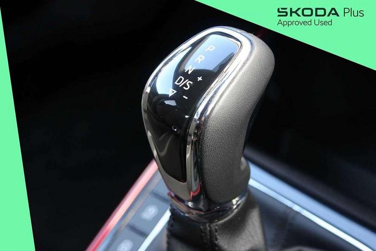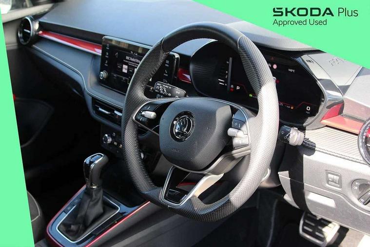 Advanced driver attention and drowsiness monitor, Bluetooth connection, Electromechanical power steering, Exterior temperature gauge, Service interval indicator, Traffic sign recognition, Virtual cockpit with 10.25" colour display, Wireless SmartLink for Apple CarPlay and Android Auto, 6 Speakers (4 in front and 2 in rear), Auxiliary socket for external MP3 player, DAB digital radio reception, Auto dimming rear view mirror, Black radiator grille, Body coloured bumpers, Door mirror integrated indicators, Front and rear electric windows, Front window wiper intermittent control, Headlight range control - Automatic, Ice scraper in fuel cap, LED daytime running lights with coming and leaving home feature, LED rear lights, Monte Carlo badging, Privacy glass, Rear LED fog light, Rear side wing doors, Rear window wiper with washing nozzles, Roof mounted spoiler, SKODA tailgate lettering in black, Sports bumpers, Third brake light, 2 reading lights in front and 2 reading lights in rear, 3 rear headrests, Aluminium pedals, Backrest split and folding, Black headlining, Central console with removable cup holder and storage box, Chrome handbrake release button, Door sills with fabia badging, Dual zone air conditioning with climatronic electronic control, Fabric/artificial leather upholstery, Front centre armrest, Front sports seats, Gearshift knob/handle in leather, Hand brake lever handle in leather, Height adjustable front headrests, Height adjustable front seats, Height adjustable steering wheel, ISOFIX and TopTether anchorage points to the outer rear seats, ISOFIX and TopTether on the front passenger seat, Luggage compartment lighting, Manually adjustable lumbar support in front seats, Metallic painted red central console cover, Metallic red interior door handles, Pollen filter, Rear seat bench unsplit, Single front passenger seat, Sun visors with mirror and airbag label on passenger side, Textile floor mats, Ticket holder, Umbrella in drivers door, 3-point height adjustable front seats belts with pretensioner and force limiter, Automatic warning lights in case of crash, Driver and passengers airbag with switch off function, e-Call+, ESC including ABS, MSR, ASR, EDS, HBA and XDS, Front and rear seat belt warning, FRONT ASSIST (AEB City and AEB Inter Urban), Front side airbags, Head airbags, Hill hold control, One tone horn, Pedestrian protection, Three rear 3-points safety seat belts with pretensioner and force limiter including stop function for outer rear seat belts, Tyre pressure monitoring system, Anti-theft alarm system including immobiliser, interior monitoring, backup horn, and towing protection, Central locking with radio remote control, interior controls, SAFE function and 2 foldable keys, Carbon effect door and side trim panels, Carbon effect lower decorative trim with white stitching, Monte carlo air vents, Red metallic upper decorative trim, Anti-theft wheel bolts protection, Super-low rolling resistance tyres,
