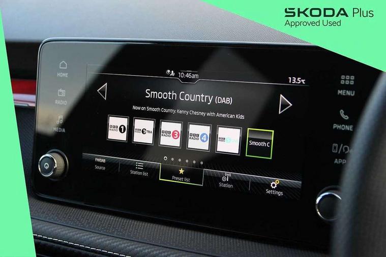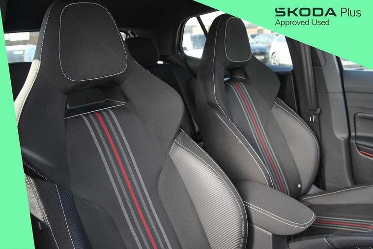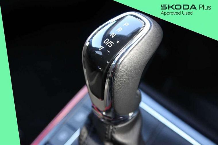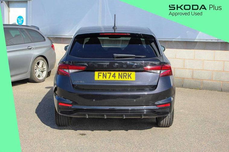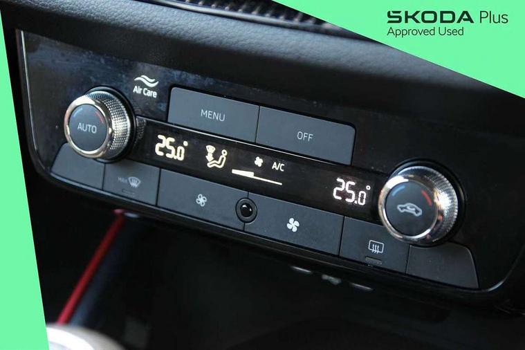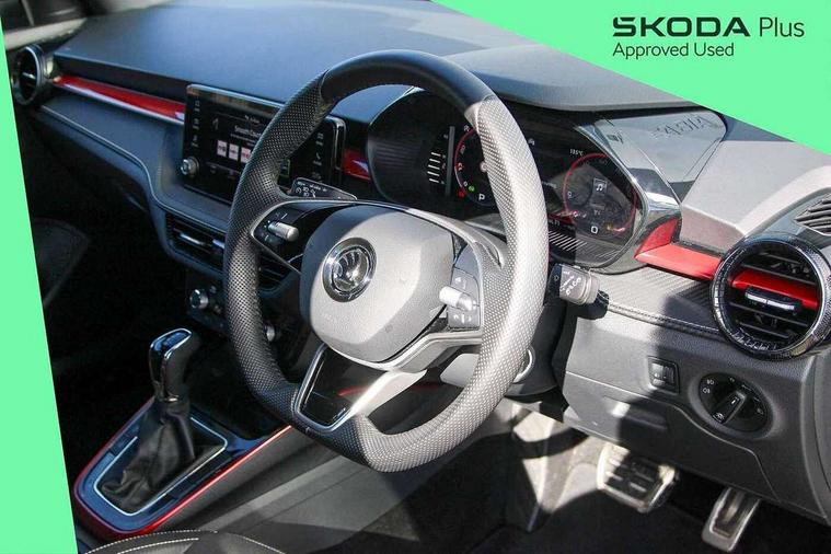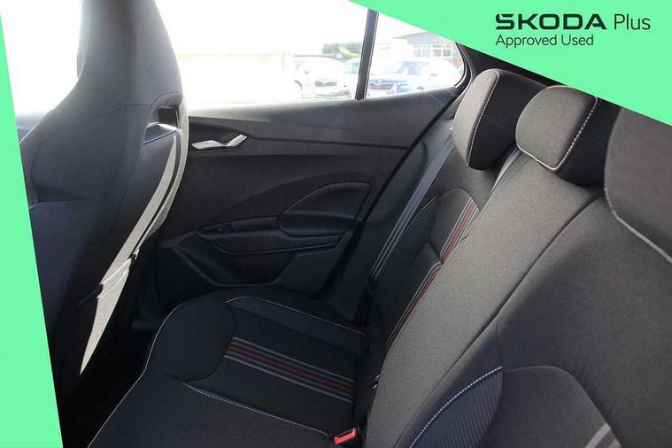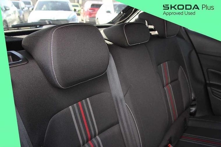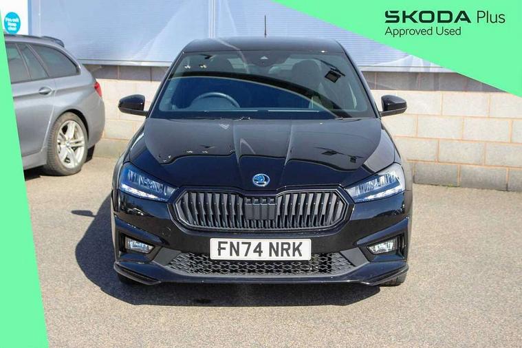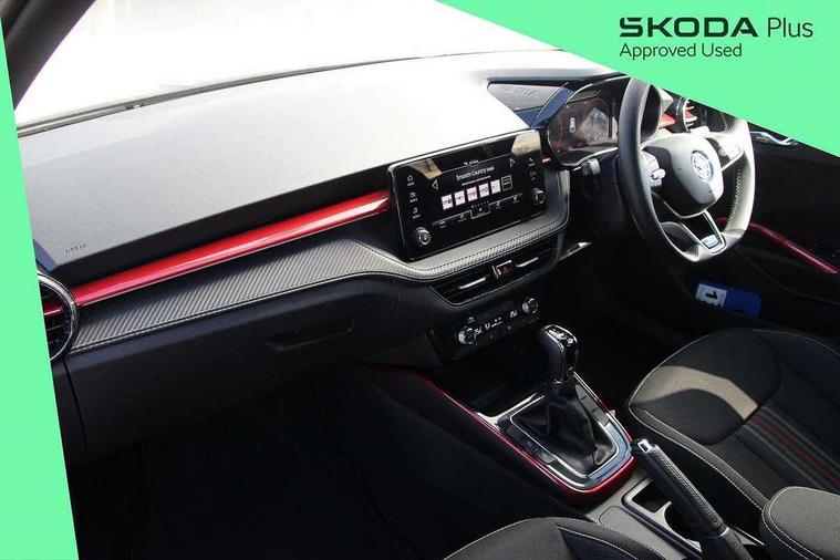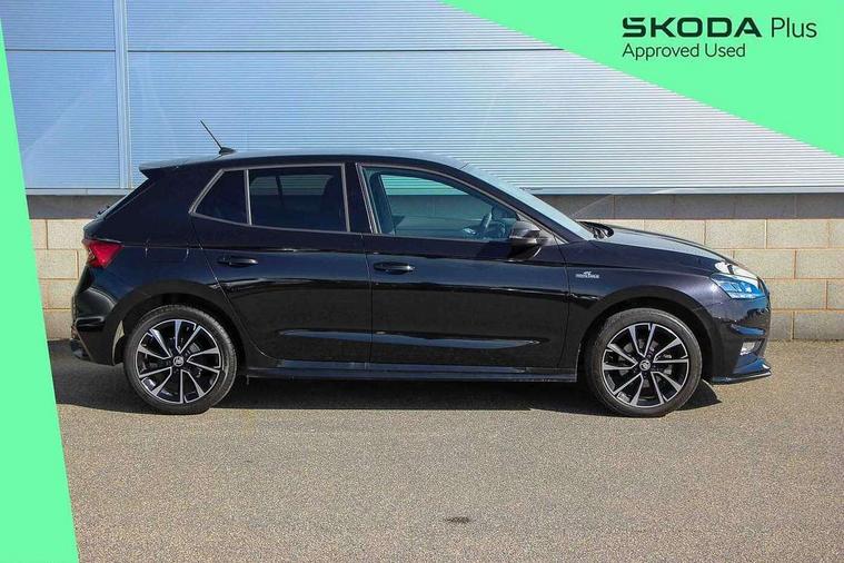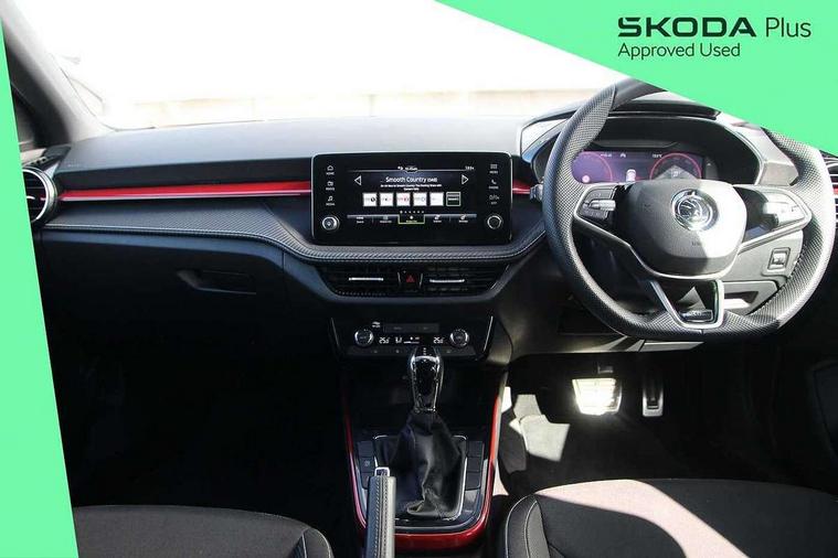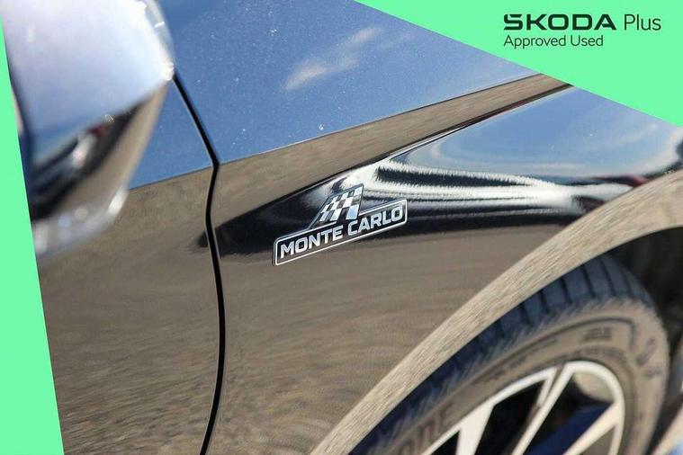 Advanced driver attention and drowsiness monitor, Bluetooth connection, Electromechanical power steering, Exterior temperature gauge, Service interval indicator, Traffic sign recognition, Virtual cockpit with 10.25" colour display, Wireless SmartLink for Apple CarPlay and Android Auto, 6 Speakers (4 in front and 2 in rear), Auxiliary socket for external MP3 player, DAB digital radio reception, Auto dimming rear view mirror, Black radiator grille, Body coloured bumpers, Door mirror integrated indicators, Front and rear electric windows, Front window wiper intermittent control, Headlight range control - Automatic, Ice scraper in fuel cap, LED daytime running lights with coming and leaving home feature, LED rear lights, Monte Carlo badging, Privacy glass, Rear LED fog light, Rear side wing doors, Rear window wiper with washing nozzles, Roof mounted spoiler, SKODA tailgate lettering in black, Sports bumpers, Third brake light, 2 reading lights in front and 2 reading lights in rear, 3 rear headrests, Aluminium pedals, Backrest split and folding, Black headlining, Central console with removable cup holder and storage box, Chrome handbrake release button, Door sills with fabia badging, Dual zone air conditioning with climatronic electronic control, Fabric/artificial leather upholstery, Front centre armrest, Front sports seats, Gearshift knob/handle in leather, Hand brake lever handle in leather, Height adjustable front headrests, Height adjustable front seats, Height adjustable steering wheel, ISOFIX and TopTether anchorage points to the outer rear seats, ISOFIX and TopTether on the front passenger seat, Luggage compartment lighting, Manually adjustable lumbar support in front seats, Metallic painted red central console cover, Metallic red interior door handles, Pollen filter, Rear seat bench unsplit, Single front passenger seat, Sun visors with mirror and airbag label on passenger side, Textile floor mats, Ticket holder, Umbrella in drivers door, 3-point height adjustable front seats belts with pretensioner and force limiter, Automatic warning lights in case of crash, Driver and passengers airbag with switch off function, e-Call+, ESC including ABS, MSR, ASR, EDS, HBA and XDS, Front and rear seat belt warning, FRONT ASSIST (AEB City and AEB Inter Urban), Front side airbags, Head airbags, Hill hold control, One tone horn, Pedestrian protection, Three rear 3-points safety seat belts with pretensioner and force limiter including stop function for outer rear seat belts, Tyre pressure monitoring system, Anti-theft alarm system including immobiliser, interior monitoring, backup horn, and towing protection, Central locking with radio remote control, interior controls, SAFE function and 2 foldable keys, Carbon effect door and side trim panels, Carbon effect lower decorative trim with white stitching, Monte carlo air vents, Red metallic upper decorative trim, Anti-theft wheel bolts protection, Super-low rolling resistance tyres,