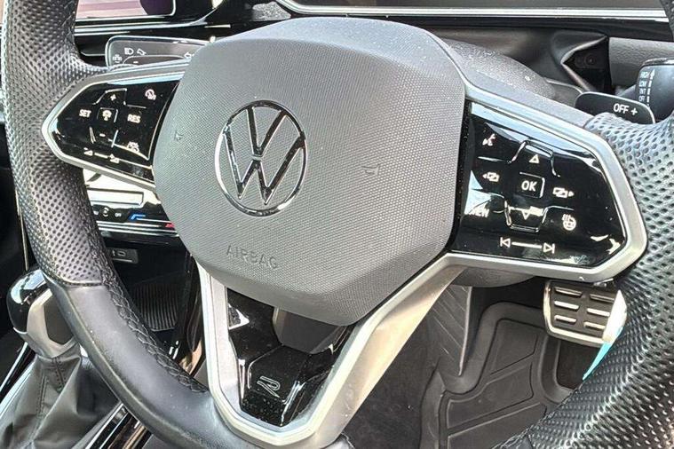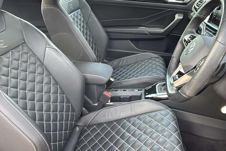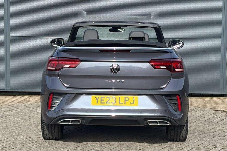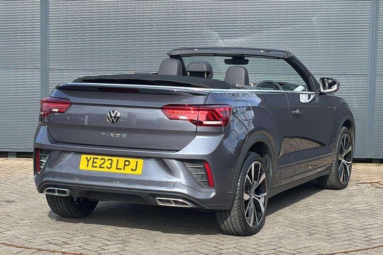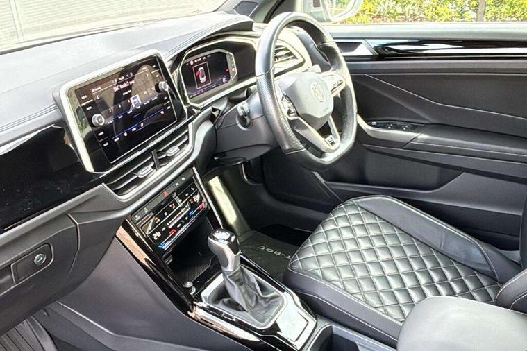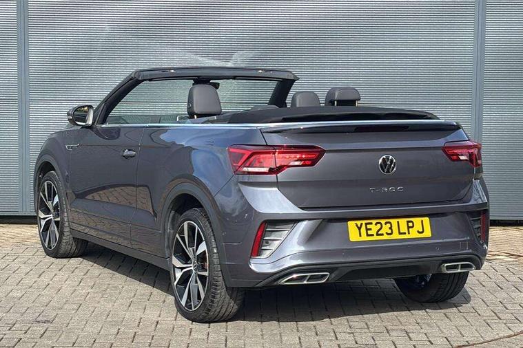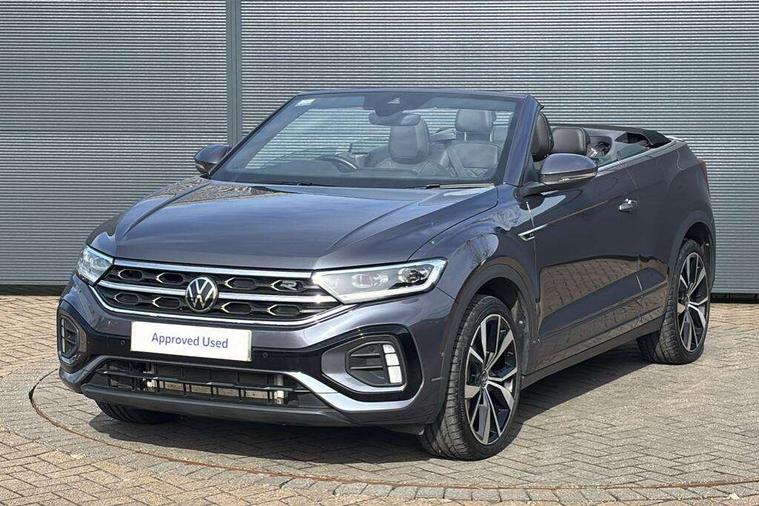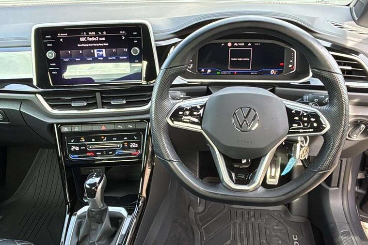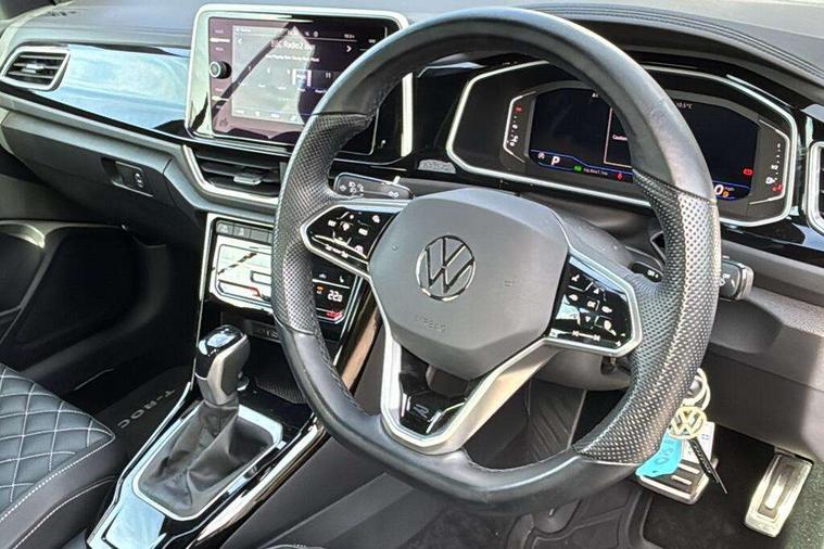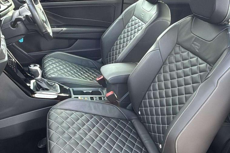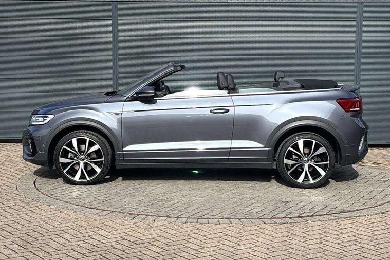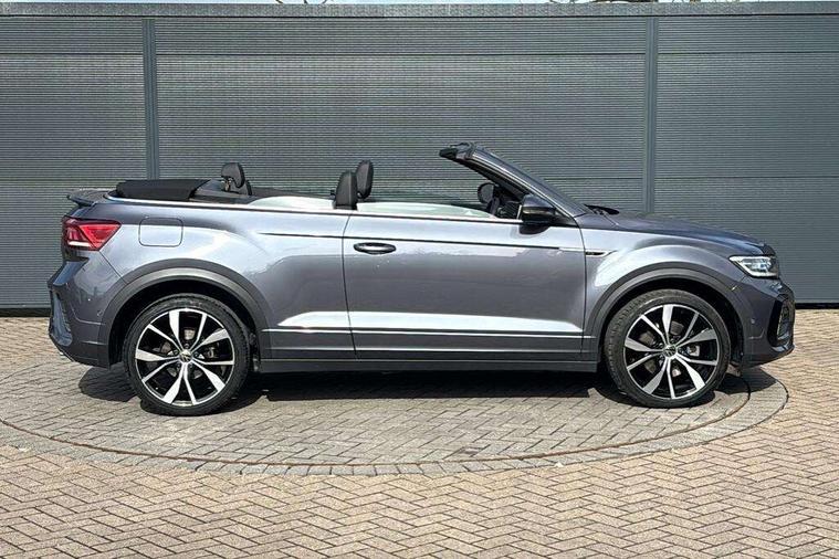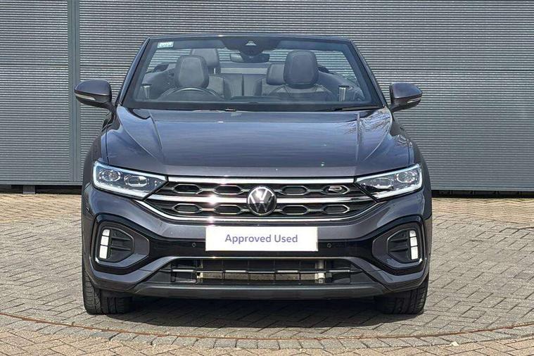 Adaptive cruise control and speed limiter, Bluetooth mobile phone interface, Brake pad wear indicator, Car information display, Digital Cockpit Pro with 10.25" Display, Driver alert system with fatigue detection, Driver tips and journey analysis, Emergency call service, Modified key software - reduce switch off time for key status change to Long no motion, Multifunction computer with visual gear change recommendation for fuel consumption, Multifunction front facing camera, Park assist including front and rear parking sensors, Speedo and rev counter, electronic odometer, trip, service interval display and exterior temperature gauge, Start/stop system with brake energy recovery, Tailgate/trunk lid release from outside, Warning sound and light for front seatbelts unfastened, Shock absorption in front, Diversity antenna for FM reception, Music playback - MP3, WMA and AAC files, SMS functionality - read, compose and send SMS messages using touch-screen display, Title and cover art display, USB-C Interface and USB charging socket, We Connect and We Connect Plus functionality, Ambient lighting with logo projection, Auto dimming interior rear view mirror, Automatic hazard lights activation under emergency braking, Automatic headlight control with LED separate daytime running lights with coming/leaving home function, Black roof, Body colour door handles, Body colour rear spoiler, Chrome effect left and right trapezoid exhaust tailpipe fascia surround, Chrome trim on upper and lower radiator grille, Dark red rear combination lamps in LED technology, Dusk sensor, Exterior mirrors aspherical on driver side, convex on front passenger side, Heat insulating glass windscreen, High level 3rd brake light, LED performance matrix headlights - dynamic range control, dynamic cornering light and turn signal + light mode for rain/fog/snow, LED rear number plate lights, Power operated canvas convertible top, Power windows with comfort operation and circuit breaker, R-Line design body coloured bumpers, Rain sensor, Rear boot, Rear exhaust tailpipe, Rear fog light on one side and reversing lights on both sides, Remote electrically foldable door mirrors, puddle lights and reverse activated passenger door mirror, Volkswagen roundel, Windscreen wiper with intermittent wipe light, Without exterior ambient lighting, 12V socket in centre console storage area, 2 LED front reading lights, 2 seat bench in 2nd row, 50:50 Split folding rear seat backrests with fixed rear seat bench, Air care climatronic air conditoning system with active combination filter and 2-zone temperature control, Black door lower parts with chrome trim, Chrome plated surround to light, mirror and window switch, Door and side trim panel with leatherette insert, Easy entry backrest release, Front and rear carpet mats with black stitching, Front centre armrest, Front cupholders x 2, Front door pockets, Front seat back storage pockets, Front sports comfort seats with manual height adjustment, Heated leather wrapped multi function sports steering wheel with tiptronic, Height/reach adjust steering wheel, Inserts of front seats and outer rear seats in ArtVelours titan black, Instrument lighting, white adjustable panel illumination, Interior light delay, Interior light in footwell, Interior lighting with switch off delay and contact switches on all doors, Interior white ambient lighting and surround lighting, Isofix child seat preparation, Lockable glove compartment with light, Luggage compartment lighting, Power adjustable lumbar support in front, Rear head restraints, Single front passenger seat, Stainless steel pedals, Sun visors with illuminated vanity mirrors, Unique R Line door sill protectors, Driver assistance pack without proactive passenger protection - T-Roc Cabriolet DSG, Sports pack - T-Roc cabriolet, 2 x 3-point seatbelts/outer rear seats with ECE label, Driver and front passenger airbag with front passenger airbag deactivation, Driver and front passenger safety-optimised head restraints, Drivers seatbelt reminder, Electronic parking brake, Electronic Stability Control (ESC) including ABS, ASR and EDL, Front and rear disc brakes, Front assist with autonomous emergency braking, Pedestrian monitoring, Predictive pedestrian protection, Rigid safety cell with front and rear crumple zones, Side airbag/thorax airbag system, for front passengers, Single tone horn, Three point height adjust front seatbelts + pretensioners, Tyre pressure loss indicator, Volkswagen roadside assistance, Anti-theft alarm system with interior protection and central locking system with SAFELOCK, radio remote control and 2 remote control folding keys, Electronic engine immobiliser, Trims for alloy wheels,
