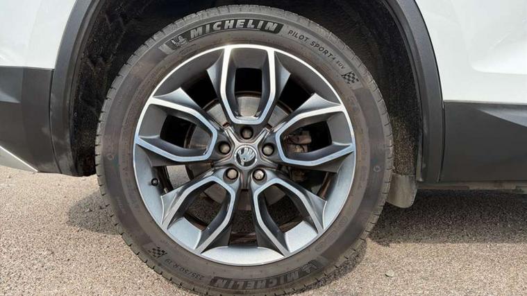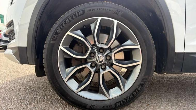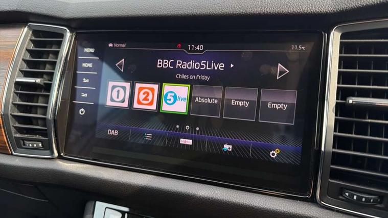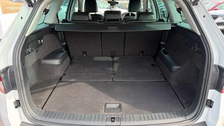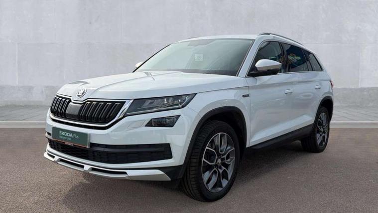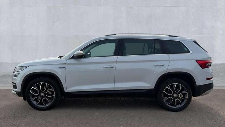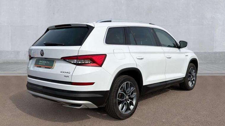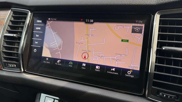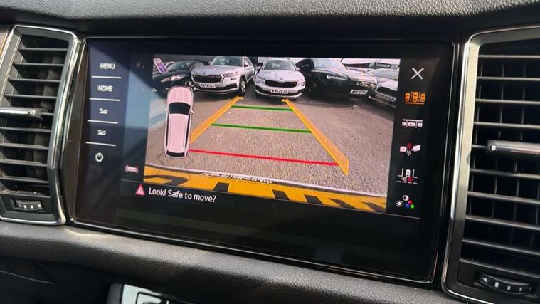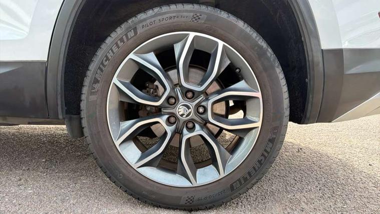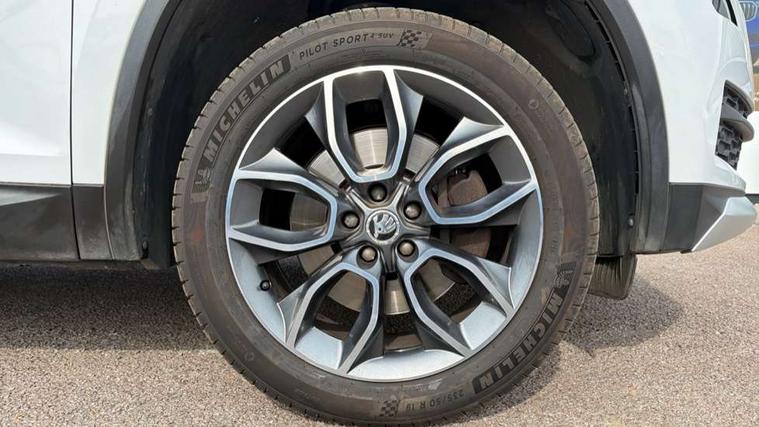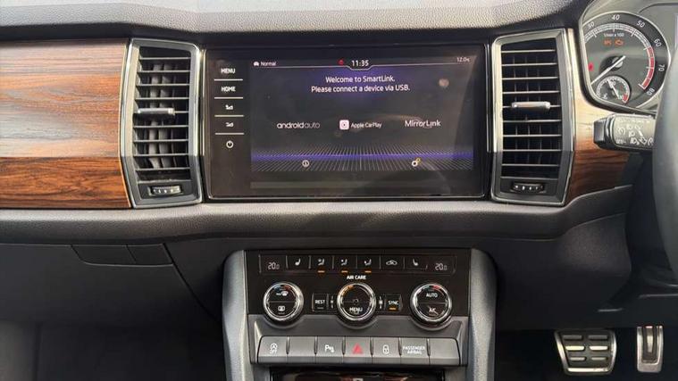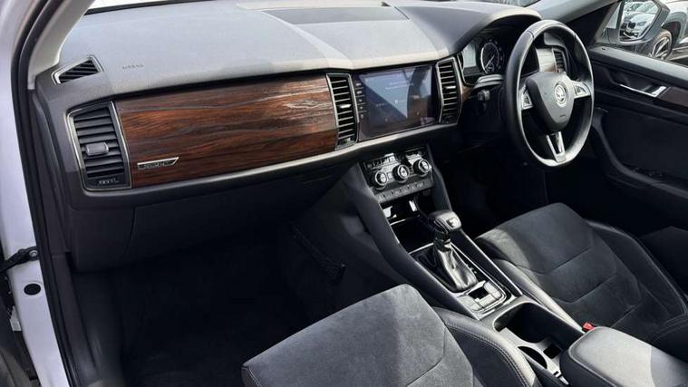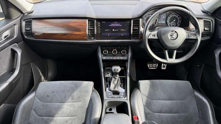 Bluetooth system, Columbus satellite navigation with 9.2" touch screen and integrated Wi-Fi, Drive mode selector, Exterior temperature gauge, SmartLink, Speed limiter, Bolero Radio, DAB Digital radio, DVD System, SD card slot, USB connection, Adaptive front lighting system, Aero wiper + intermittent function, Auto dimming door mirrors, Auto dimming rear view mirror, Automatic activation of hazard warning lights, Body colour bumpers, Electric adjustable/heated/folding door mirrors, Electric front windows, Electric rear windows, Front and Rear door steps, Headlight washers, Heated rear window, High gloss black grille with chrome inserts, LED daytime running lights, LED front fog lights with static cornering light function, LED Headlights, Light assistant (coming home/tunnel light), Rain and light sensors, Rear diffuser, Rear wiper, Silver door mirrors, Silver roof rails, Sunset privacy glass, Tinted windows, 12V Accessory socket in centre console, 12V power point in luggage area, 3 rear height adjustable headrests, 4 lashing points on luggage floor, 60/40 split fold rear seat back, Alcantara door panels, Alcantara upholstery, Aluminium pedals, Black roof lining, Boot storage compartments, Centre console with storage/cupholders, Chrome gear shift lever, Chrome inner door handles, Driver + front passenger lumbar support, Driver's glovebox with lid, Driver's storage box, Electric front seats with memory function, Folding grab handles with rear coat hooks, Front and rear bottle holders, Front centre armrest with storage compartment, Front floor mats, Front/rear courtesy lights, Front/rear reading lights, Height adjustable front seats, Height/tilt adjustable front headrests, Illuminated air conditioned glovebox, Illuminated luggage compartment, Isofix system on outer rear seats, LED ambient lighting, LED footwell lights, Luggage compartment cover, Luggage nets in boot, Manually adjustable steering column, Passenger side net compartment on centre console, Pollen filter, Rear centre armrest with cupholders, Removable LED light in boot, Sunglasses storage, Sunvisors with illuminated vanity mirrors, Ticket holder, Chrome pack - Kodiaq, Rough Road pack - Kodiaq, 3 point front/outer rear seatbelts+pre-tensioners, ABS + EDL + ASR + MSR + ESC, Driver and passenger airbags, Drivers knee airbag, Electromechanical parking brake, Front assist including city emergency braking, Front side airbags, Fuel cut off safety device, HBA (Hydraulic Brake Assist), Head airbags, Hill hold control, Passenger airbag deactivate switch, Seatbelt warning, Two tone horn, Tyre pressure monitor, Alarm with interior monitoring and tilt sensor, Anti-theft wheel bolts, Immobiliser, Keyless entry and keyless start, Remote central locking, Wood door casing inserts, Wood finish centre console, 19" Crater anthracite alloy wheels,