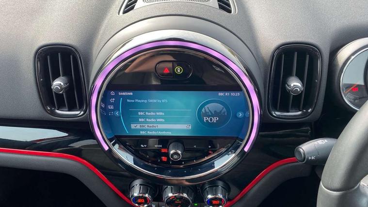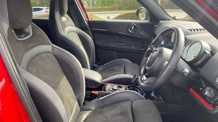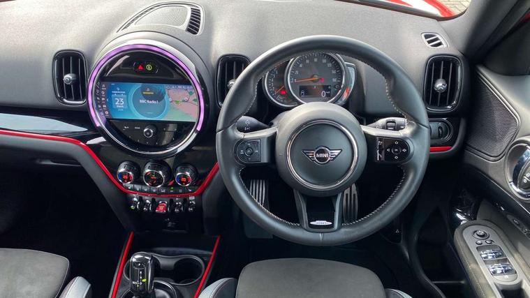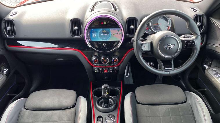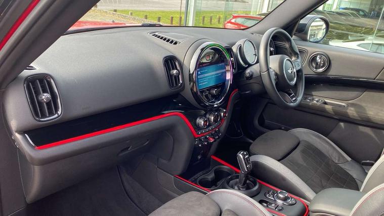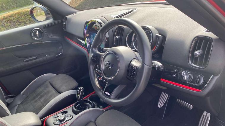 Active Guard incl speed limiting and lane departure functions with auto steering, and front collision warning with brake intervention, Automatic start/stop function with brake energy recuperation, Compatible mobile phone bluetooth with audio streaming, Cruise control with brake assist, Electro-mechanical speed dependant steering assistance, Instrument cluster, MINI Driving Modes - centre toggle switch to control driving setting (sport, mid and green), Mini E-call, On board computer, Rear parking distance control, 51 Litre fuel tank, Double Vanos system, Fully variable valve control, High precision injection, Performance Control, Steptronic transmission with double clutch, FM tuner and DAB digital radio, 3rd brake light, Body colour fuel filler cap, Day time driving lights, Door sill strips, Dynamic brake lights, Electric windows, Heated rear window, Heated windscreen washer jets, John Cooper Works - aerodynamic kit (front and rear apron, spoiler), front and rear sport bumpers and part-painted side sills with door sill finishers, John Cooper Works Logo, LED fog lights, LED Headlights, Model logo, Model logo on Tailgate, Rain sensor with auto headlights, Rear fog lights, Rear side wing doors, Rear window wiper, Side scuttle panel with integrated indicator, Split rear doors, Sun/heat protection glass, White indicator lenses, 12V socket in centre console, 3 seat bench in 2nd row, 360L luggage compartment capacity, 4 lashing eyes in luggage compartment, 40:20:40 split folding rear seats, Anthracite headlining with grab handles and clothes hooks, Chrome interior highlights, Colour line - Carbon black, Cupholders, English handbook, Floor mats, Front headrests, Glove compartment, Height and length steering column adjustment, Interior lighting with 12 basic colours selectable via toggle switch in roof, Isofix rear child seat preparation, LED reading lights, vanity mirror lights, front foot well light and spotlight on front seats, Manual air conditioning, Mini John Cooper Works leather gearshift lever and handbrake gaiters, Multifunction steering wheel, Nappa leather steering wheel with MINI Yours logo, Rear headrests, Single front passenger seat, Stainless steel pedals and foot rest, Storage compartments in doors, Sunvisors with vanity mirrors, Tool kit, Excitement pack - Countryman, Navigation pack - Countryman, Piano black exterior pack - Countryman, 2 tone horn, 3 point seatbelts on all seats, 6 Airbags - front, side, head and seat belt tensioners, Anti-lock braking system (ABS), DSC - Dynamic Stability Control, Electronic handbrake, Front and rear disc brakes, Hill start assist, Manual rear child locks, Tyre pressure monitoring system, Alarm system with tilt sensor, monitoring doors, bonnet interior and tailgate, Auto drive away locking, Deadlocking function, Electronic vehicle immobiliser, Locking wheel bolts, Start/stop toggle with keyless go, Piano black JCW interior trim,
