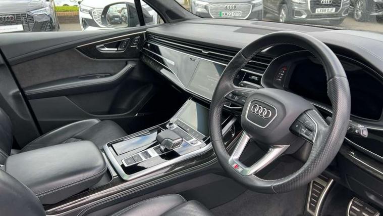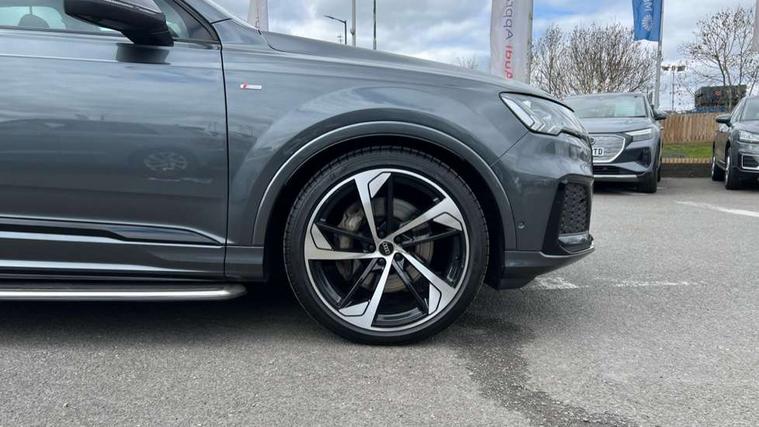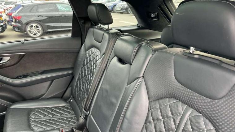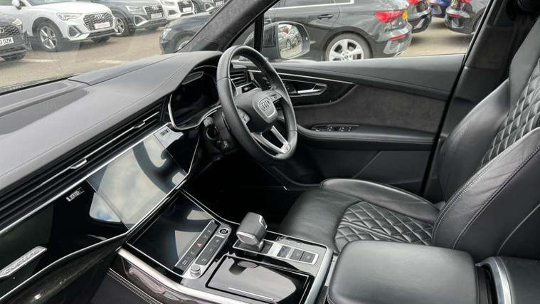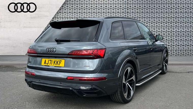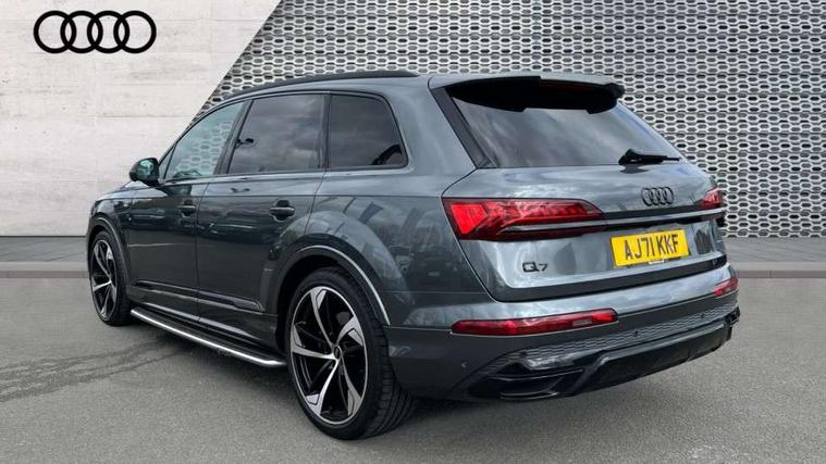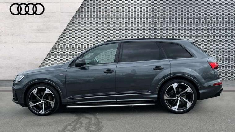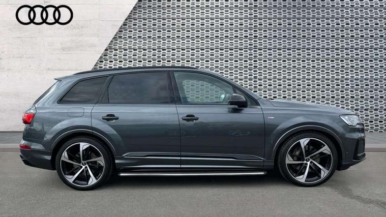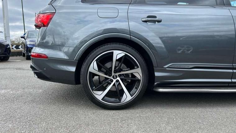 All wheel steering, Audi connect safety and service (e-call), Audi connect with Amazon Alexa Integration, Audi drive select (Auto, Comfort, Dynamic, Efficiency, Individual, Off-road and All road), Bluetooth interface, Camera based traffic sign recognition, Head up Display, MMI navigation plus with MMI touch screens includes 10.1" and 8.6" screens with haptic feedback, Natural voice recognition, Power door closure, Power operated tailgate, Smartphone interface includes wireless Apple carplay/Android Auto, Start/stop system, 48V Mild hybrid technology, Adaptive air sports suspension, Quattro all wheel drive with self locking centre differential, 2 USB-C ports with charging functionality in the rear, Audi music interface - front 2 USB-C ports with charger and data functions, DAB digital radio module, 3rd brake light, Audi Beam uses LEDs to project Audi logo onto the ground as you exit your Q7, Audi HD matrix LED headlights with Audi laser light + dynamic front and rear indicators, Auto dimming frameless rear view mirror, Black roof rails, Bumpers in contrast paint scandium grey finish includes door trim and wheel arch trim strips, inlays in door strip contain quattro embossing, Electric panoramic glass sunroof, Electrically adj heated/folding + automatically dimming exterior mirrors with memory + automatic kerb side function for passenger side exterior mirror, Gloss black finish for exterior Audi rings and Q7 logos without engine badging, Headlight washers, Heat insulating glass in windshield, Integrated LED indications in door mirrors, LED daytime running lights, LED rear tail lights, Privacy glass - dark tinted rear and rear side windows from B-pillar backwards, Rear side wing doors, Rear wiper, Side running boards, 2 seat bench in 3rd row, 3 seat bench in 2nd row, 3 spoke heated leather multi-function steering wheel including paddle shift, 4 zone deluxe automatic climate control, 7 seat layout with ISOFIX points for the front passenger seat and rear passenger seat, Black Alcantara headlining, Comfort front centre armrest, Double sun visors with illuminated vanity mirrors, Electric adjustable front seats/backrest bolsters, lumbar support, memory functionality, Folding rear seats, Front head restraints, Front/rear floor mats, Heated front and outer rear seats for second row, Illuminated door sill trims with S logo, Manual sunblind for the rear side windows and manual sunblind for the rear window, Rear head restraints, Seat ventilation and massage function in the front, Single front passenger seat, Stainless steel pedals, City assist pack - Q7, Comfort and sound pack with Bang + Olufsen premium sound system - Q7, Extended leather pack - Q7, Titanium black styling pack - Q7/SQ7, Tour pack with Adaptive cruise assist - Q7, 3 point seatbelts on all rear seats, Audi pre sense front, Child locks on rear doors, Driver and front passenger, front side and curtain airbags, Electromechanical parking brake, Electronic Stabilisation Control (ESC) including ABS, ASR and EDL, Extended pedestrian protection measures, Hill hold assist, Seatbelt monitoring, Tyre pressure loss indicator, Warning triangle and first aid kit, Anti theft alarm, Anti-theft wheel bolts and wheel loosening detection, Remote central locking, Polished oak trim with grey finish inlay, Tool kit, Tyre repair kit,