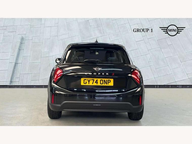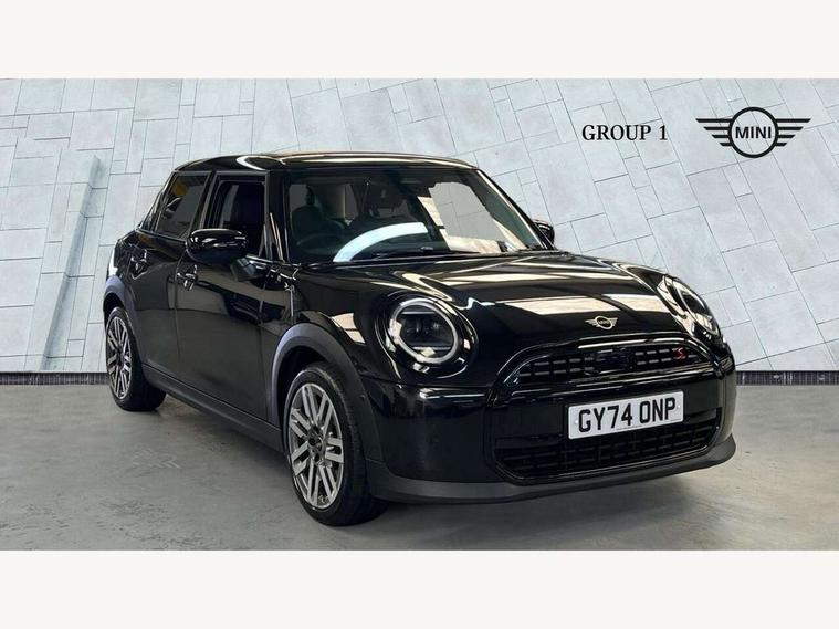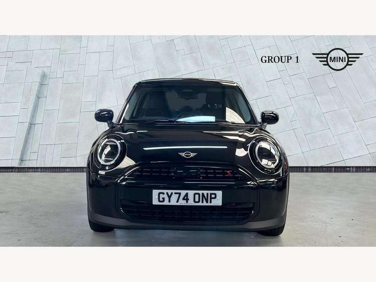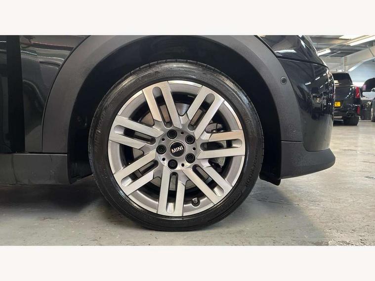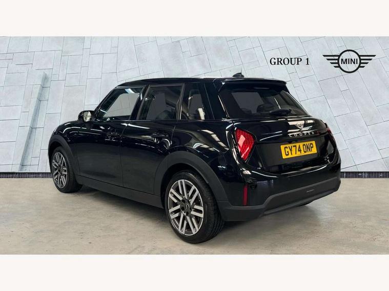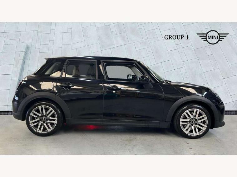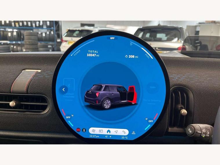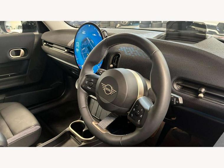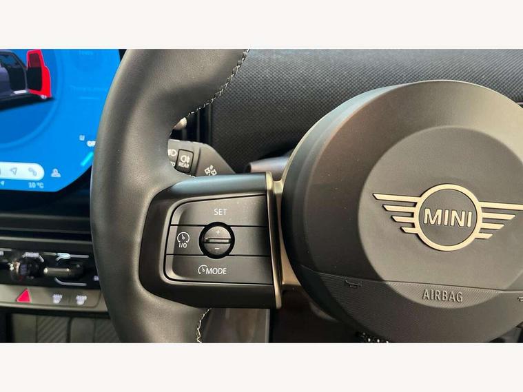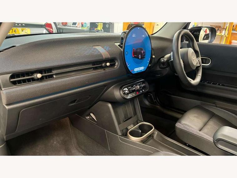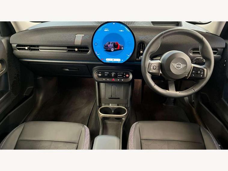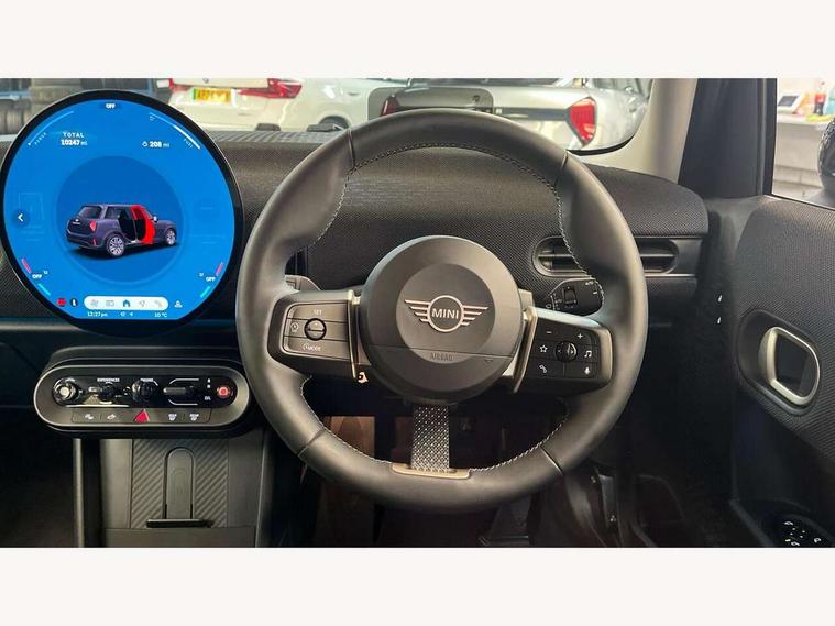 Central toggle bar, Circular OLED Screen, Compatible mobile phone bluetooth with audio streaming, Cruise control, Digital instrument cluster, Electro-mechanical speed dependant steering assistance, Emergency call service, MINI Experience Modes, Mini navigation system, On board computer, Service interval indicator, 7 speed steptronic transmission with double clutch, DAB Digital radio, Personal eSim, Adaptable light signatures, Auto headlights, Electric adjustable heated door mirrors, Electric front+rear windows, Heated rear window, Heated windscreen washer jets, LED daytime running lights, LED indicator lights, LED rear lights, Rain sensor window wipers, Rear fog lights, Rear side wing doors, Rear window wiper, 2 zone automatic air conditioning, 3 seat bench in 2nd row, 60/40 rear seat bench, Ambient lighting, Cupholders, Floor mats, Front and rear head restraints, Front compact armrest, Heated steering wheel, Height adjustable passenger seat, Light headliner, Luggage compartment lighting, Single front passenger seat, Sport Vescin Steering Wheel black with vibrant silver accents, Sunvisors with vanity mirrors, Vescin/Cloth upholstery, Driving assistant pack - Cooper Hatchback, Level 1 pack - Mini Hatchback, Park assistant pack - Cooper Hatchback, 3 point seatbelts on all five seats, 6 Airbags - front, side, head and seat belt tensioners, Acoustic pedestrian protection, Anti-lock braking system (ABS), Child locks on rear doors, DSC - Dynamic Stability Control, Electronic parking brake, Front and rear disc brakes, Front ISOFIX (iSize), Front passenger airbag deactivation, Traction control, Tyre pressure monitoring system, Alarm, Immobiliser, Remote central locking, Black/Blue dashboard knit, Tyre repair kit,
